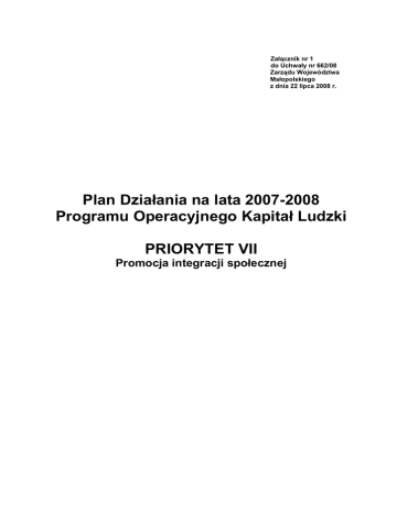 Załącznik nr 1 do Uchwały nr 662/08 Zarządu Województwa Małopolskiego z dnia 22 lipca 2008 r. Plan Działania na lata 2007-2008 Programu Operacyjnego Kapitał Ludzki PRIORYTET VII Promocja integracji społecznej Plan działania na lata 2007-2008 PROGRAM OPERACYJNY KAPITAŁ LUDZKI Numer Priorytetu: VII Nazwa Priorytetu: Promocja integracji społecznej Nazwa Instytucji Pośredniczącej: Samorząd Województwa Małopolskiego, Urząd Marszałkowski Województwa Małopolskiego, Departament Polityki Regionalnej Adres siedziby:31 – 156 Kraków, ul. Basztowa 22 Telefon: (012) 29 90 700 Fax: (012) 29 90 726 Adres e-mail: [email protected] I. Obszary wsparcia I.1 Preferowane formy wsparcia W celu rozpoznania rzeczywistych potrzeb i preferencji potencjalnych beneficjentów komponentu regionalnego PO KL, w Województwie Małopolskim planuje się w 2008 r. ogłoszenie konkursów we wszystkich typach projektów w ramach poszczególnych Działań i Poddziałań Priorytetu VII. Intencją samorządu województwa w pierwszym okresie wdrażania jest umożliwienie podejmowania działań projektowych przez beneficjentów w jak najszerszym zakresie, nie ograniczając ich preferencji. Działanie 7.1 Rozwój i upowszechnienie aktywnej integracji Poddziałanie 7.1.1 Rozwój i upowszechnianie aktywnej integracji przez ośrodki pomocy społecznej Rozwój form aktywnej integracji oraz upowszechnianie aktywnej integracji i pracy socjalnej Wsparcie realizowane zgodnie z „Zasadami przygotowania, realizacji i rozliczania projektów systemowych Ośrodków Pomocy Społecznej, Powiatowych Centrów Pomocy Rodzinie oraz Regionalnego Ośrodka Polityki Społecznej w ramach Programu Operacyjnego Kapitał Ludzki 2007-2013” Poddziałanie 7.1.2 Rozwój i upowszechnianie aktywnej integracji przez powiatowe centra pomocy rodzinie Rozwój form aktywnej integracji oraz upowszechnianie aktywnej integracji i pracy socjalnej Wsparcie realizowane zgodnie z „Zasadami przygotowania, realizacji i rozliczania projektów systemowych Ośrodków Pomocy Społecznej, Powiatowych Centrów Pomocy Rodzinie oraz Regionalnego Ośrodka Polityki Społecznej w ramach Programu Operacyjnego Kapitał Ludzki 2007-2013” Poddziałanie 7.1.3 Podnoszenie kwalifikacji kadr pomocy i integracji społecznej Szkolenia oraz specjalistyczne doradztwo dla kadr instytucji pomocy społecznej, działających na terenie regionu, powiązane bezpośrednio z potrzebami oraz ze specyfiką realizowanych zadań Wsparcie realizowane zgodnie z „Zasadami przygotowania, realizacji i rozliczania projektów systemowych Ośrodków Pomocy Społecznej, Powiatowych Centrów Pomocy Rodzinie oraz Regionalnego Ośrodka Polityki Społecznej w ramach Programu Operacyjnego Kapitał Ludzki 2007-2013” 2 Działanie 7.2 Przeciwdziałanie wykluczeniu i wzmocnienie sektora ekonomii społecznej Poddziałanie 7.2.1 Aktywizacja zawodowa i społeczna osób zagrożonych wykluczeniem społecznym 1. wsparcie (m.in. prawne, organizacyjne, szkoleniowe i finansowe) dla tworzenia i działalności podmiotów integracji społecznej, w tym: centrów integracji społecznej, klubów integracji społecznej, zakładów aktywności zawodowej oraz podmiotów działających na rzecz aktywizacji społeczno-zawodowej (których podstawowym zadaniem nie jest działalność gospodarcza) kursy i szkolenia umożliwiające nabycie, podniesienie lub zmianę kwalifikacji i kompetencji z wyjątkiem warsztatów terapii zajęciowej 2. kursy i szkolenia 1 umożliwiające nabycie, podniesienie lub zmianę kwalifikacji i kompetencji zawodowych dla osób zagrożonych wykluczeniem społecznym 3. staże subsydiowane zatrudnienie i zajęcia reintegracji zawodowej u pracodawcy2 4. poradnictwo psychologiczne, psychospołeczne, zawodowe i inne, prowadzące do integracji społecznej i zawodowej, skierowane do osób zagrożonych wykluczeniem i ich otoczenia 5. rozwój nowych form i metod wsparcia indywidualnego i środowiskowego na rzecz integracji zawodowej i społecznej (w tym np. środowiskowej pracy socjalnej, centrów aktywizacji lokalnej, animacji lokalnej, streetworkingu, couchingu, treningu pracy) 6. rozwój usług społecznych przezwyciężających indywidualne bariery w integracji społecznej w tym w powrocie na rynek pracy 7. rozwijanie umiejętności i kompetencji społecznych, niezbędnych na rynku pracy 8. wsparcie tworzenia i działalności środowiskowych instytucji aktywizujących osoby niepełnosprawne w tym zaburzone psychicznie 9. promocja i wsparcie wolontariatu, w zakresie integracji osób wykluczonych i zagrożonych wykluczeniem społecznym 10. wsparcie dla tworzenia i funkcjonowania pozaszkolnych form integracji społecznej młodzieży (świetlice środowiskowe w tym z programem socjoterapeutycznym, kluby środowiskowe) połączonych z realizacją działań w zakresie reintegracji zawodowej i społecznej 11. organizowanie akcji i kampanii promocyjno –informacyjnych m.in. z zakresu równości szans, mobilności i elastyczności zawodowej, promowania postaw aktywnych oraz przeciwdziałania wykluczeniu społecznemu 12. rozwój dialogu, partnerstwa publiczno-społecznego i współpracy na rzecz rozwoju zasobów ludzkich na poziomie regionalnym i lokalnym 13. prowadzenie, publikowanie i upowszechnianie badań i analiz z zakresu polityki społecznej w regionie (w tym działań mających na celu przygotowanie i wdrażanie gminnych lub powiatowych strategii rozwiązywania problemów społecznych) Działanie 7.2.2 Wsparcie ekonomii społecznej 1. Wsparcie finansowe dla utworzenia i funkcjonowania instytucji otoczenia sektora ekonomii społecznej, świadczących następujące usługi: • usługi prawne, księgowe, marketingowe, doradztwo finansowe • doradztwo (indywidualne i grupowe) oraz szkolenia umożliwiające uzyskanie wiedzy i umiejętności potrzebnych do założenia i prowadzenia działalności w sektorze ekonomii społecznej • rozwój partnerstwa lokalnego na rzecz rozwoju ekonomii społecznej •