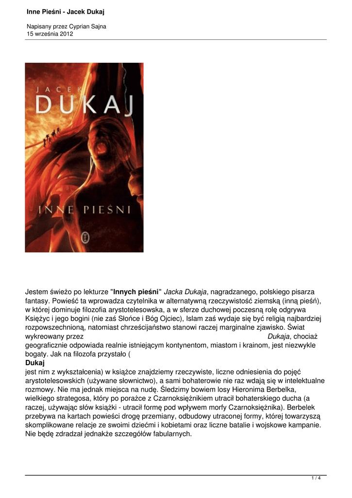 Inne Pieśni - Jacek Dukaj Napisany przez Cyprian Sajna 15 września 2012 Jestem świeżo po lekturze "Innych pieśni" Jacka Dukaja, nagradzanego, polskiego pisarza fantasy. Powieść ta wprowadza czytelnika w alternatywną rzeczywistość ziemską (inną pieśń), w której dominuje filozofia arystotelesowska, a w sferze duchowej poczesną rolę odgrywa Księżyc i jego bogini (nie zaś Słońce i Bóg Ojciec), Islam zaś wydaje się być religią najbardziej rozpowszechnioną, natomiast chrześcijaństwo stanowi raczej marginalne zjawisko. Świat wykreowany przez Dukaja, chociaż geograficznie odpowiada realnie istniejącym kontynentom, miastom i krainom, jest niezwykle bogaty. Jak na filozofa przystało ( Dukaj jest nim z wykształcenia) w książce znajdziemy rzeczywiste, liczne odniesienia do pojęć arystotelesowskich (używane słownictwo), a sami bohaterowie nie raz wdają się w intelektualne rozmowy. Nie ma jednak miejsca na nudę. Śledzimy bowiem losy Hieronima Berbelka, wielkiego strategosa, który po porażce z Czarnoksiężnikiem utracił bohaterskiego ducha (a raczej, używając słów książki - utracił formę pod wpływem morfy Czarnoksiężnika). Berbelek przebywa na kartach powieści drogę przemiany, odbudowy utraconej formy, której towarzyszą skomplikowane relacje ze swoimi dziećmi i kobietami oraz liczne batalie i wojskowe kampanie. Nie będę zdradzał jednakże szczegółów fabularnych. 1/4 Inne Pieśni - Jacek Dukaj Napisany przez Cyprian Sajna 15 września 2012 Poza tym, że "Inne pieśni" stanowią doskonałą, wciągającą rozrywkę sprzyjają także licznym refleksjom na temat naszego miejsca i roli w świecie, społecznych i politycznych relacji, czy kontaktu z tym co nieznane. Alternatywny świat stworzony przez Dukaja odarty jest z sentymentów, nie ma w nim miejsca na słabość, czy walkę o sprawiedliwość lub utopijne marzenia. Nikt w nim się nie okłamuje. Każdy doskonale wie, że najsilniejsi (Kratistosi) narzucają swoją wolę, kreując (morfując) rzeczywistość pod wpływem swego anthosu. Relacje międzyludzkie podlegają różnym formom, zależnym od sytuacji, czy też narzucanym przez kratistosów (władców), której mogą się wyłącznie oprzeć najsilniejsze jednostki. Każdy zna swoje miejsce, niewolnik (doulos), aristokrata, kratistos. W ten sposób świat jest pełen harmonii, chociaż podlega twardym zasadom. Nikt nie próbuje jednak z nimi walczyć, a wyjątki od tej reguły są uznawane za wariactwo (Kristos - czyli Chrystus, czy np. sekta demokratów). Ten fantastyczny świat (wątki typowego fantasy dosyć liczne - księżycanie, kakomorfy) po głębszym namyśle nie jest jednak li tylko wyobrażeniem autora, lecz w istocie metaforą naszej rzeczywistości. Świat w którym żyjemy, rzeczywiście podlega tak twardym zasadom, ustalanym i narzucanym przez najsilniejsze jednostki w danej grupie, rodzinie czy społeczeństwie, a każde nasze zachowanie podlega ustalonym i narzuconym formom, którym nie sposób się sprzeciwić. Drogą więc, którą powinien dążyć człowiek (taki morał wyciągnąłem z powieści) jest droga zgodna z jego prawdziwą naturą, nie oszukiwanie siebie, nie staranie się o bycie kimś, kim nie jesteśmy, już w nas samych tkwi to do czego jesteśmy przeznaczeni - jeden do spokojnego życia w zaciszu domowym, drugi do walki o najwyższe laury. Wariactwem jest chęć zmiany tego czego nie da się zmienić, świat jest taki jaki jest - ma twarde zasady, gdzie silniejsi narzucają wolę, gdzie odbywa się starcie Form: Pomiędzy obcym i obcym - może być tylko gwałt. Porozumienie - jedynie pomiędzy istotami tej samej Formy. Porozumienie - to znaczy zwycięstwo Formy silniejszego, którą przyjąwszy, słabszy zrozumie teraz jasno i wyraźnie, dlaczego nie miał racji. Nie ma w nim miejsca na rozczulanie się i walkę o utopijne prawdy, których i tak nie da się przecież wprowadzić. Tylko słabi podlegają temu urojeniu. "Inne pieśni", niekoniecznie ze świadomością ich autora, nawiązują do crowleyowskiej zasady "czyń swoją wolę", wolę, która jest zgodna z Twoją prawdziwą naturą. Jeśli z natury jesteś wojownikiem, zdobywaj, narzucając swoje, jeśli jesteś słabeuszem, wypełniaj wolę innych w 2/4 Inne Pieśni - Jacek Dukaj Napisany przez Cyprian Sajna 15 września 2012 pokorze. Dostrzegam też silne nawiązania do filozofii Fryderyka Nietzsche, moralności Panów i niewolników, idei nadczłowieka itd. W głowie pojawia się pytanie - czy tak powinienem czynić? Czy kroczyć twardo, niczym nieugięty bohater, by zmieniać, morfować rzeczywistość wokół wedle mocy swojego anthosu? Albo jeśli jestem słabej natury, poddać się innym, sprawując los niewolnika? Dobrze, że moje wnętrze należy wyłącznie do mnie samego i póki jestem na tyle świadomy i uważny, potrafię dostrzegać, czy poddaje się formie, czy opanowuje mnie morfa innych, na ile moje czyny wynikają z okoliczności i oddziaływania świata zewnętrznego. Tak, powieść Dukaja to zdecydowanie inne pieśni, nie chrześcijańskie, te bowiem wynoszą to co w świecie słabe i niskie: Przeto przypatrzcie się, bracia, powołaniu waszemu! Niewielu tam mędrców według oceny ludzkiej, niewielu możnych, niewielu szlachetnie urodzonych. Bóg wybrał właśnie to, co głupie w oczach świata, aby zawstydzić mędrców, wybrał to, co niemocne, aby mocnych poniżyć; i to, co nie jest szlachetnie urodzone według świata i wzgardzone, i to, co nie jest, wyróżnił Bóg, by to co jest, unicestwić, tak by się żadne stworzenie nie chełpiło wobec Boga. (I Kor 1,26-29) "Inne pieśni" zainspirowały mnie również do napisania wiersza, który zamieszczam poniżej: MELANCHOLIA Jest tylko jeden świat bezwględnych starć kerosów Świat form nadrzędnych Demonów głupców i herosów Jest tylko jeden świat ten z ciemnych krat utkany i z szarych firmanentów z wodami łez i oceanem testamentów 3/4 Inne Pieśn
