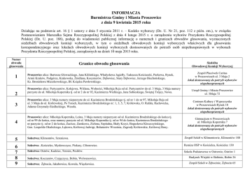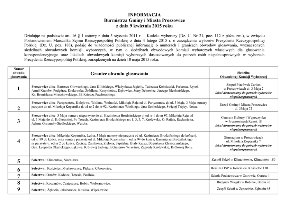 INFORMACJA Burmistrza Gminy i Miasta Proszowice z dnia 9 kwietnia 2015 roku Działając na podstawie art. 16 § 1 ustawy z dnia 5 stycznia 2011 r. – Kodeks wyborczy (Dz. U. Nr 21, poz. 112 z późn. zm.), w związku Postanowieniem Marszałka Sejmu Rzeczypospolitej Polskiej z dnia 4 lutego 2015 r. o zarządzeniu wyborów Prezydenta Rzeczypospolitej Polskiej (Dz. U. poz. 188), podaję do wiadomości publicznej informację o numerach i granicach obwodów głosowania, wyznaczonych siedzibach obwodowych komisji wyborczych, w tym o siedzibach obwodowych komisji wyborczych właściwych dla głosowania korespondencyjnego oraz lokalach obwodowych komisji wyborczych dostosowanych do potrzeb osób niepełnosprawnych w wyborach Prezydenta Rzeczypospolitej Polskiej, zarządzonych na dzień 10 maja 2015 roku. Numer obwodu głosowania 1 2 3 4 Granice obwodu głosowania Proszowice ulice: Bartosza Głowackiego, Jana Kilińskiego, Władysława Jagiełły, Tadeusza Kościuszki, Parkowa, Rynek, Armii Kraków, Podgórze, Krakowska, Źródlana, Kosynierów, Dębowiec, Stary Dębowiec, Jerzego Biechońskiego, Ks. Bronisława Mieszkowskiego, Bł. Księdza Pawłowskiego. Proszowice ulice: Partyzantów, Kolejowa, Wiślana, Wolności, Mikołaja Reja od ul. Partyzantów do ul. 3 Maja, 3 Maja numery parzyste do ul. Mikołaja Kopernika tj. od nr 2 do nr 92, Kazimierza Wielkiego, Jana Sobieskiego, Świętej Trójcy, Nowa. Proszowice ulice: 3 Maja numery nieparzyste do ul. Kazimierza Brodzińskiego tj. od nr 1 do nr 97, Mikołaja Reja od ul. 3 Maja do ul. Królewskiej, Po Torach, Kazimierza Brodzińskiego nr: 1, 3, 5, 7, Królewska, O. Rafała, Racławicka, Adama Grzymały-Siedleckiego, Wesoła. Proszowice ulice: Mikołaja Kopernika, Leśna, 3 Maja numery nieparzyste od ul. Kazimierza Brodzińskiego do końca tj. od nr 99 do końca, oraz numery parzyste od ul. Mikołaja Kopernika tj. od nr 94 do końca, Kazimierza Brodzińskiego nr parzyste tj. od nr 2 do końca, Zacisze, Zamkowa, Zielona, Szpitalna, Biały Krzyż, Bogusława Kleszczyńskiego, Gen. Leopolda Okulickiego, Łąkowa, Królowej Jadwigi, Bohaterów Września, Zagrody Królewskie, Królowej Bony. Siedziba Obwodowej Komisji Wyborczej Zespół Placówek Caritas w Proszowicach ul. 3 Maja 2 lokal dostosowany do potrzeb wyborców niepełnosprawnych Urząd Gminy i Miasta Proszowice ul. 3Maja 72 Centrum Kultury i Wypoczynku w Proszowicach Rynek 18 lokal dostosowany do potrzeb wyborców niepełnosprawnych Gimnazjum w Proszowicach ul. Mikołaja Kopernika 7 lokal dostosowany do potrzeb wyborców niepełnosprawnych 5 Sołectwa; Klimontów, Szreniawa. Zespół Szkół w Klimontowie, Klimontów 180 6 7 8 9 Sołectwa ; Kościelec, Mysławczyce, Piekary, Ciborowice. Remiza OSP w Kościelcu, Kościelec 130 Sołectwa: Ostrów, Kadzice, Teresin, Posiłów. Szkoła Podstawowa w Ostrowie, Ostrów 1 Sołectwa; Koczanów, Czajęczyce, Bobin, Wolwanowice. Budynek Wiejski w Bobinie, Bobin 26 Sołectwa; Żębocin, Jakubowice, Kowala, Więckowice. Zespół Szkół w Żębocinie, Żębocin 65 Szkoła Podstawowa w Stogniowicach, Stogniowice 25 Szkoła Podstawowa w Szczytnikach Szczytniki 91a lokal dostosowany do potrzeb wyborców niepełnosprawnych Remiza OSP w Opatkowicach, Opatkowice 37 10 Sołectwa: Stogniowice, Przezwody, Górka Stogniowska. 11 Sołectwa; Szczytniki, Szczytniki-Kolonia, Makocice. 12 Sołectwo; Opatkowice. 13 Sołectwa; Jazdowiczki, Szklana, Łaganów, Gniazdowice. 14 Obwód odrębny – Samodzielny Publiczny Zespół Opieki Zdrowotnej w Proszowicach Szkoła Podstawowa nr 1 w Proszowicach ul. Tadeusza Kościuszki 15 lokal dostosowany do potrzeb wyborców niepełnosprawnych Samodzielny Publiczny Zespół Opieki Zdrowotnej w Proszowicach ul. Mikołaja Kopernika 13 lokal dostosowany do potrzeb wyborców niepełnosprawnych Głosowanie w wyborach Prezydenta Rzeczypospolitej Polskiej odbędzie się w dniu 10 maja 2015 r. w godz. 7.00 – 21.00. Informuję o możliwości głosowania korespondencyjnego oraz przez pełnomocnika. Dla celów głosowania korespondencyjnego na terenie gminy Proszowice wyznacza się Obwodowe Komisje Wyborcze: Nr 1 w Zespole Placówek Caritas w Proszowicach, Nr 3 w Centrum Kultury i Wypoczynku w Proszowicach, Nr 4 w Gimnazjum w Proszowicach, Nr 11 w Szkole Podstawowej w Szczytnikach, Nr 13 w Szkole Podstawowej Nr 1 w Proszowicach. Burmistrz Gminy i Miasta Proszowice (-) Grzegorz Cichy 1) Zmiany wymienionej ustawy zostały ogłoszone w Dz. U. z 2011 r. Nr 26, poz. 134, Nr 94, poz. 550, Nr 102, poz. 588, Nr 134, poz. 777, Nr 147, poz. 881, Nr 149, poz. 889, Nr 171, poz. 1016 i Nr 217, poz. 1281, z 2012 r. poz. 849, 951 i 1529 oraz z 2014 r. poz. 179, 180 i 1072.