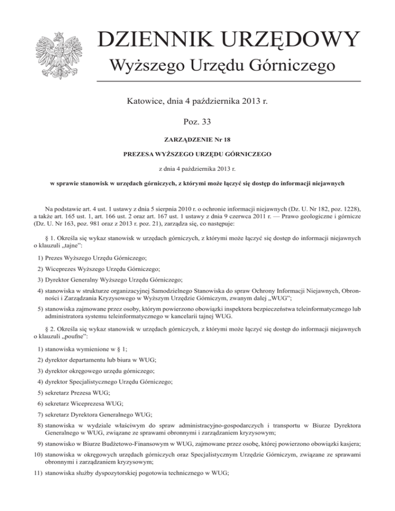 DZIENNIK URZĘDOWY Wyższego Urzędu Górniczego Katowice, dnia 4 października 2013 r. Poz. 33 ZARZĄDZENIE Nr 18 PREZESA WYŻSZEGO URZĘDU GÓRNICZEGO z dnia 4 października 2013 r. w sprawie stanowisk w urzędach górniczych, z którymi może łączyć się dostęp do informacji niejawnych Na podstawie art. 4 ust. 1 ustawy z dnia 5 sierpnia 2010 r. o ochronie informacji niejawnych (Dz. U. Nr 182, poz. 1228), a także art. 165 ust. 1, art. 166 ust. 2 oraz art. 167 ust. 1 ustawy z dnia 9 czerwca 2011 r. — Prawo geologiczne i górnicze (Dz. U. Nr 163, poz. 981 oraz z 2013 r. poz. 21), zarządza się, co następuje: § 1. Określa się wykaz stanowisk w urzędach górniczych, z którymi może łączyć się dostęp do informacji niejawnych o klauzuli „tajne”: 1)Prezes Wyższego Urzędu Górniczego; 2)Wiceprezes Wyższego Urzędu Górniczego; 3)Dyrektor Generalny Wyższego Urzędu Górniczego; 4)stanowiska w strukturze organizacyjnej Samodzielnego Stanowiska do spraw Ochrony Informacji Niejawnych, Obronności i Zarządzania Kryzysowego w Wyższym Urzędzie Górniczym, zwanym dalej „WUG”; 5)stanowiska zajmowane przez osoby, którym powierzono obowiązki inspektora bezpieczeństwa teleinformatycznego lub administratora systemu teleinformatycznego w kancelarii tajnej WUG. § 2. Określa się wykaz stanowisk w urzędach górniczych, z którymi może łączyć się dostęp do informacji niejawnych o klauzuli „poufne”: 1)stanowiska wymienione w § 1; 2)dyrektor departamentu lub biura w WUG; 3)dyrektor okręgowego urzędu górniczego; 4)dyrektor Specjalistycznego Urzędu Górniczego; 5)sekretarz Prezesa WUG; 6)sekretarz Wiceprezesa WUG; 7)sekretarz Dyrektora Generalnego WUG; 8)stanowiska w wydziale właściwym do spraw administracyjno-gospodarczych i transportu w Biurze Dyrektora Generalnego w WUG, związane ze sprawami obronnymi i zarządzaniem kryzysowym; 9)stanowisko w Biurze Budżetowo-Finansowym w WUG, zajmowane przez osobę, której powierzono obowiązki kasjera; 10) stanowiska w okręgowych urzędach górniczych oraz Specjalistycznym Urzędzie Górniczym, związane ze sprawami obronnymi i zarządzaniem kryzysowym; 11) stanowiska służby dyspozytorskiej pogotowia technicznego w WUG; Dziennik Urzędowy Wyższego Urzędu Górniczego – 2 – Poz. 33 12) stanowiska w Kancelarii Głównej WUG; 13) audytor wewnętrzny; 14) Rzecznik Prasowy Prezesa WUG; 15) stanowiska w wydziale właściwym do spraw komputeryzacji i informatyzacji w Biurze Dyrektora Generalnego w WUG. § 3. Określa się wykaz stanowisk w urzędach górniczych, z którymi może łączyć się dostęp do informacji niejawnych o klauzuli „zastrzeżone”: 1)stanowiska wymienione w § 1; 2)stanowiska wymienione w § 2. § 4. Traci moc zarządzenie nr 15 Prezesa Wyższego Urzędu Górniczego z dnia 3 lutego 2012 r. w sprawie stanowisk w urzędach górniczych, z którymi może łączyć się dostęp do informacji niejawnych (Dz. Urz. WUG poz. 43). § 5. Zarządzenie wchodzi w życie z dniem podpisania. Prezes Wyższego Urzędu Górniczego: Piotr Litwa