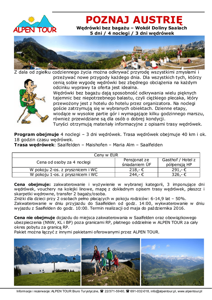 POZNAJ AUSTRIĘ Wędrówki bez bagażu – Wokół Doliny Saalach 5 dni / 4 noclegi / 3 dni wędrówek Z dala od zgiełku codziennego życia można odkrywać przyrodę wszystkimi zmysłami i przeżywać nowe przygody każdego dnia. Dla wszystkich tych, którzy cenią sobie wygodę wędrówki bez zbędnego obciążenia na każdym odcinku wyprawy ta oferta jest idealna. Wędrówki bez bagażu dają sposobność odkrywania wielu pięknych tajemnic bez niepotrzebnego balastu, czyli ciężkiego plecaka, który przewożony jest z hotelu do hotelu przez organizatora. Na noclegi goście zatrzymują się w wybranych obiektach. Dzienne etapy, wiodące w wysokie partie gór i wymagające kilku godzinnego marszu, również przewidziane są dla osób o dobrej kondycji. Turyści otrzymują materiały informacyjne z opisami trasy wędrówek. Program obejmuje 4 noclegi – 3 dni wędrówek. Trasa wędrówek obejmuje 40 km i ok. 18 godzin czasu wędrówek. Trasa wędrówek: Saalfelden – Maishofen – Maria Alm – Saalfelden Ceny w EUR Cena od osoby za 4 noclegi W pokoju 2-os. z prysznicem i WC W pokoju 1-os. z prysznicem i WC Pensjonat ze śniadaniem ÜF 218,- € 244,- € Gasthof / Hotel z półpensją HP 291,- € 326,- € Cena obejmuje: zakwaterowanie i wyżywienie w wybranej kategorii, 3 imponujące dni wędrówek, vouchery na kolejki linowe, mapę z dokładnym opisem trasy wędrówek, płaszcz i skarpetki wędrowne, transfer 2 bagaży/osoba. Zniżki dla dzieci przy 2 osobach pełno płacących w pokoju rodziców: 6-14,9 lat – 50%. Zakwaterowanie w dniu przyjazdu do Saalfelden od godz. 14:00, wykwaterowanie w dniu wyjazdu z Saalfelden do godz. 10:00. Termin realizacji od maja do października 2016. Cena nie obejmuje dojazdu do miejsca zakwaterowania w Saalfelden oraz obowiązkowego ubezpieczenia (NNW, KL i BP) poza granicami RP, płatnego oddzielnie w ALPEN TOUR za cały okres pobytu za granicą RP. Pakiet można łączyć z innymi pakietami oferowanymi przez ALPEN TOUR. Informacje i rezerwacje: ALPEN TOUR Biuro Turystyczne, 22/371-59-60, 691-032-018, [email protected], www.alpentour.pl