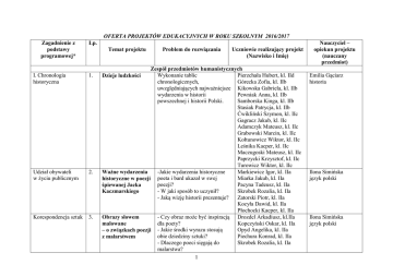 OFERTA PROJEKTÓW EDUKACYJNYCH W ROKU SZKOLNYM 2016/2017 Zagadnienie z podstawy programowej* Lp. Temat projektu I. Chronologia historyczna 1. Udział obywateli w życiu publicznym 2. Korespondencja sztuk 3. Problem do rozwiązania Uczniowie realizujący projekt (Nazwisko i Imię) Zespół przedmiotów humanistycznych Wykonanie tablic Pierzchała Hubert, kl. IId Dzieje ludzkości chronologicznych, Górecka Zofia, kl. IIb uwzględniających najważniejsze Kikowska Gabriela, kl. IIb wydarzenia w historii Pewniak Anna, kl. IIb powszechnej i historii Polski. Samborska Kinga, kl. IIb Stasiak Patrycja, kl. IIb Ćwikliński Szymon, kl. IIc Gagracz Jakub, kl. IIc Adamczyk Mateusz, kl. IIc Grabowski Marcin, kl. IIc Kołtunowicz Wiktor, kl. IIc Leśnika Kacper, kl. IIc Maczugoski Mateusz, kl. IIc Paprzycki Krzysztof, kl. IIc Turowicz Wiktor, kl. IIc -Jakie wydarzenia historyczne Markiewicz Igor, kl. IIa Ważne wydarzenia Miarka Jakub, kl. IIa historyczne w poezji poeta i bard ukazał w swej poezji? Pacyna Tadeusz, kl. IIa śpiewanej Jacka - W jaki sposób to uczynił? Skrobek Rozalia, kl. IIa Kaczmarskiego - Jaką wizję historii prezentuje? Zatorski Piotr, kl. IIa Kocyła Dawid, kl. IIa Płochocki Kacper, kl. IIa - Czy obraz może być inspiracją Drozdel Arkadiusz, kl.IIa Obrazy słowem dla poety? Kopczyński Oskar, kl. IIa malowane Opyd Angelika, kl. IIa – o związkach poezji - Jakie środki wyrazu stosują obie dziedziny sztuki? Piechura Konrad, kl. IIa z malarstwem - Dlaczego poeci sięgają do Skrobek Rozalia, kl. IIa malarstwa? 1 Nauczyciel – opiekun projektu (nauczany przedmiot) Emilia Gąciarz historia Ilona Simińska język polski Ilona Simińska język polski Uczeń doskonali sprawność analizy i interpretacji tekstów kultury; zyskuje nowe narzędzia, dzięki którym jego lektura jest coraz dojrzalsza, bardziej świadoma i samodzielna 4. Podstawa programowa z fizyki 5. Regiony geograficzne Polski 6. Budowa i funkcjonowanie organizmu roślin na przykładzie rośliny okrytonasiennej 7. Jak czytamy lektury? Jak sformułować pytania kontrolne, by stwierdzić, czy uczniowie dokładnie przeczytali lekturę? Kolanek Denis, kl. IIa Śliwiński Kacper, kl. IIa Tatarczak Hubert, kl. IIa Zespół przedmiotów matematyczno-przyrodniczo-technicznych Cele ogólne projektu : Kawalec Błażej, kl. IId Ciekawe zjawisko zmienianie postrzegania Pękosławski Hubert, kl. IId fizyczne wokół nas fizyki z przedmiotu trudnego Ulman Krystian, kl. IId na interesujący i przyjemny, Sujecka Alicja, kl. IId rozbudzanie zainteresowania naukami ścisłymi, rozbudzenie zainteresowań poznawczych i naukowych, uzupełnienie i ugruntowanie wiedzy z fizyki, pokazywanie praktycznego zastosowania fizyki, wdrażanie do systematycznej pracy, propagowanie dobrej organizacji pracy. Które miejsca stanowią Majkowski Dawid, kl. IIb Atrakcje naszego atrakcje turystyczne? Mizera Jakub, kl. IIb regionu Szpiner Jakub, kl. IIb Określenie wpływu światła, Kocałek Jakub, kl. IId Wpływ różnych wody, temperatury i podłoża Pater Kacper, kl. IId czynników na na proces kiełkowania. Połubińska Martyna, kl. IId kiełkowanie nasion Włodarczyk Konrad, kl. IId 2 Ewa Ciecióra język polski Jacek Dylik fizyka Alicja Szkudlarek geografia Emilia Załęczna biologia Elementy wiedzy o krajach obszaru nauczanego języka oraz o kraju ojczystym z uwzględnieniem kontekstu międzykulturowego oraz tematyki integracji europejskiej Elementy wiedzy o krajach niemieckiego obszaru językowego 8. Starożytni matematycy 9. Kulinarne zwyczaje Brytyjczyków The history of Hollywood*. Historia Hollywood 10. 11. Święta i dni świąteczne w krajach niemieckiego obszaru językowego 12. Mini słownik idiomów Magiera Przemysław, kl. IId Michalak Kacper, kl. IId Semeradt Paweł, kl. IId Słupecka Zuzanna, kl. IId Stępińska Natalia, kl. IId Święciak Amelia, kl. IId Zespół nauczycieli języków obcych Czym różni się kuchnia Karkus Oliwia, kl. IId polska od brytyjskiej. Magiera Przemysław, kl. IId Poznanie struktury, historii Jasińska Aleksandra, kl. IId miasta. Stelmaszczyk Julia, kl. IId * do wybory dowolne miasto Matyjaszczyk Wiktoria, kl. IIb kraju anglojęzycznego. Podlewska Oliwia, kl. IIb Podlewski Jakub, kl. IIb Markiewicz Klaudia, kl. IIb Borowski Norbert, kl. IIc Górekci Kacper, kl. IIc Zebranie informacji o starożytnych matematykach z różnych źródeł. Po zakończeniu projektu uczniowie będą potrafili wymienić najważniejsze święta i dni świąteczne w krajach niemieckojęzycznych, poszerzą swój wiedzę na temat tradycji i obyczajów w krajach niemieckiego obszaru językowego. Jakie idiomy są szczególnie popularne we współcześnie używanym języku angielskim? 3 Grażyna Harciarek matematyka Katarzyna Załęczna język angielski Ksymena Pietrzyk język angielski Kuśmierek Maja, kl. IIb Wójcik Wiktoria, kl. IIb Magdalena Wojtasik język niemiecki Pawłowska Natalia, kl. IId Łabędzka Zuzanna, kl. IIb Michałek Wiktoria, kl. IIb Mikołajczyk Marta, kl. IIb Sylwia Łabędzka język angielski Sporty całego życia i wypoczynek 13. Rozwijanie predyspozycji do lekkiej atletyki 14. Rozwijanie predyspozycji do piłki nożnej 15. Problematyka odżywiania 16. Rozwijanie predyspozycji do logicznego myślenia 17. Zespół nauczycieli wychowania fizycznego Wybranie odpowiedniego Dawid Cichosz, kl. IIIc Szkolny turniej systemu rozgrywek. Karkus Oliwia, kl. IId tenisa stołowego dziewcząt i chłopców Wyłonienie najlepszych zawodników i zawodniczek. Zdobycie doświadczeń Chodorowska Alicja, kl. IIc Mistrzostwa niezbędnych do organizacji Fraczek Sandra, kl. IIc Powiatu szkół i przeprowadzenia zawodów. Gierlak Julita, kl. IIc gimnazjalnych Jabłońska Julia, kl. IIc w Lidze Rogulski Marcel, kl. IIc Lekkoatletycznej Szwej Dominika, kl. IIc dziewcząt i chłopców Frątczak Filip, kl. IIc Klat Hubert, kl. IIc Zaangażowanie uczniów Michalski Wiktor, kl. IIa Organizacja w przygotowanie Porabik Angelika, kl. IIa Mistrzo