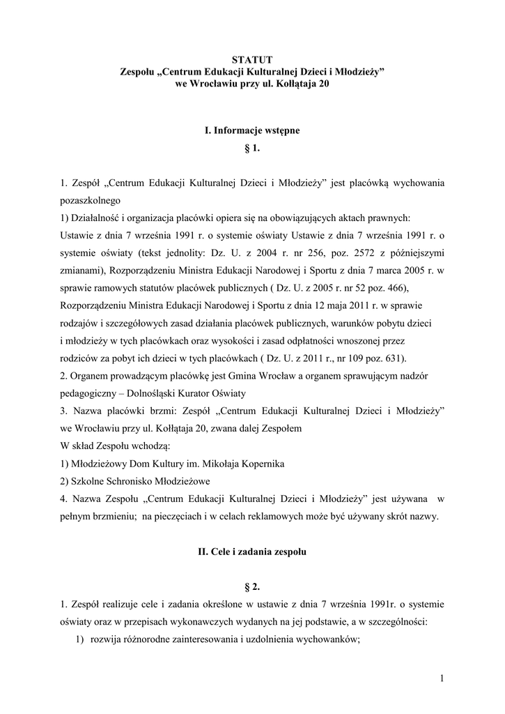1 STATUT Zespołu „Centrum Edukacji Kulturalnej Dzieci i Młodzieży