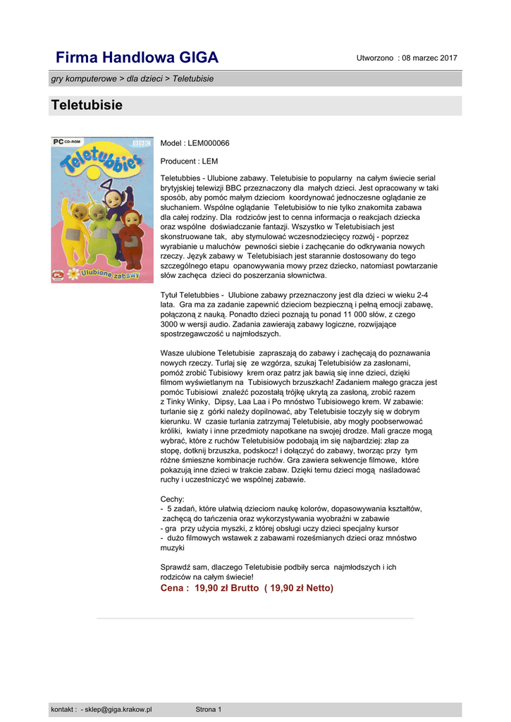 Firma Handlowa GIGA Utworzono : 08 marzec 2017 gry komputerowe > dla dzieci > Teletubisie Teletubisie Model : LEM000066 Producent : LEM Teletubbies - Ulubione zabawy. Teletubisie to popularny na całym świecie serial brytyjskiej telewizji BBC przeznaczony dla małych dzieci. Jest opracowany w taki sposób, aby pomóc małym dzieciom koordynować jednoczesne oglądanie ze słuchaniem. Wspólne oglądanie Teletubisiów to nie tylko znakomita zabawa dla całej rodziny. Dla rodziców jest to cenna informacja o reakcjach dziecka oraz wspólne doświadczanie fantazji. Wszystko w Teletubisiach jest skonstruowane tak, aby stymulować wczesnodziecięcy rozwój - poprzez wyrabianie u maluchów pewności siebie i zachęcanie do odkrywania nowych rzeczy. Język zabawy w Teletubisiach jest starannie dostosowany do tego szczególnego etapu opanowywania mowy przez dziecko, natomiast powtarzanie słów zachęca dzieci do poszerzania słownictwa. Tytuł Teletubbies - Ulubione zabawy przeznaczony jest dla dzieci w wieku 2-4 lata. Gra ma za zadanie zapewnić dzieciom bezpieczną i pełną emocji zabawę, połączoną z nauką. Ponadto dzieci poznają tu ponad 11 000 słów, z czego 3000 w wersji audio. Zadania zawierają zabawy logiczne, rozwijające spostrzegawczość u najmłodszych. Wasze ulubione Teletubisie zapraszają do zabawy i zachęcają do poznawania nowych rzeczy. Turlaj się ze wzgórza, szukaj Teletubisiów za zasłonami, pomóż zrobić Tubisiowy krem oraz patrz jak bawią się inne dzieci, dzięki filmom wyświetlanym na Tubisiowych brzuszkach! Zadaniem małego gracza jest pomóc Tubisiowi znaleźć pozostałą trójkę ukrytą za zasłoną, zrobić razem z Tinky Winky, Dipsy, Laa Laa i Po mnóstwo Tubisiowego krem. W zabawie: turlanie się z górki należy dopilnować, aby Teletubisie toczyły się w dobrym kierunku. W czasie turlania zatrzymaj Teletubisie, aby mogły poobserwować króliki, kwiaty i inne przedmioty napotkane na swojej drodze. Mali gracze mogą wybrać, które z ruchów Teletubisiów podobają im się najbardziej: złap za stopę, dotknij brzuszka, podskocz! i dołączyć do zabawy, tworząc przy tym różne śmieszne kombinacje ruchów. Gra zawiera sekwencje filmowe, które pokazują inne dzieci w trakcie zabaw. Dzięki temu dzieci mogą naśladować ruchy i uczestniczyć we wspólnej zabawie. Cechy: - 5 zadań, które ułatwią dzieciom naukę kolorów, dopasowywania kształtów, zachęcą do tańczenia oraz wykorzystywania wyobraźni w zabawie - gra przy użycia myszki, z której obsługi uczy dzieci specjalny kursor - dużo filmowych wstawek z zabawami roześmianych dzieci oraz mnóstwo muzyki Sprawdź sam, dlaczego Teletubisie podbiły serca najmłodszych i ich rodziców na całym świecie! Cena : 19,90 zł Brutto ( 19,90 zł Netto) kontakt : - [email protected] Strona 1