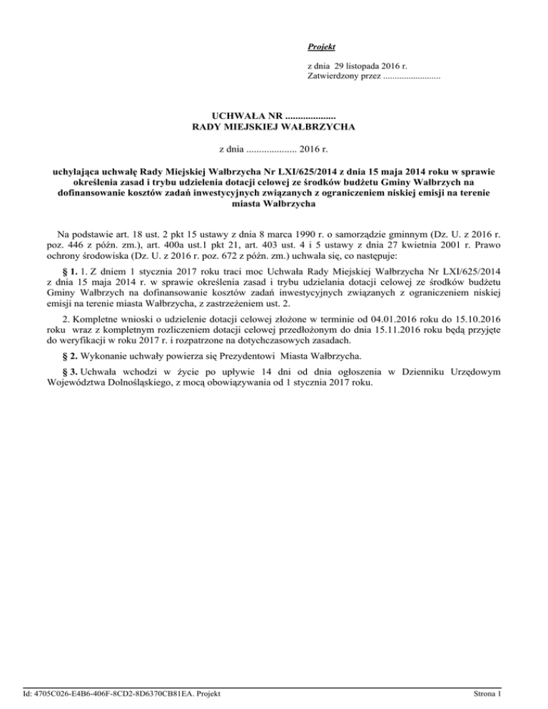 Projekt z dnia 29 listopada 2016 r. Zatwierdzony przez ......................... UCHWAŁA NR .................... RADY MIEJSKIEJ WAŁBRZYCHA z dnia .................... 2016 r. uchylająca uchwałę Rady Miejskiej Wałbrzycha Nr LXI/625/2014 z dnia 15 maja 2014 roku w sprawie określenia zasad i trybu udzielenia dotacji celowej ze środków budżetu Gminy Wałbrzych na dofinansowanie kosztów zadań inwestycyjnych związanych z ograniczeniem niskiej emisji na terenie miasta Wałbrzycha Na podstawie art. 18 ust. 2 pkt 15 ustawy z dnia 8 marca 1990 r. o samorządzie gminnym (Dz. U. z 2016 r. poz. 446 z późn. zm.), art. 400a ust.1 pkt 21, art. 403 ust. 4 i 5 ustawy z dnia 27 kwietnia 2001 r. Prawo ochrony środowiska (Dz. U. z 2016 r. poz. 672 z późn. zm.) uchwala się, co następuje: § 1. 1. Z dniem 1 stycznia 2017 roku traci moc Uchwała Rady Miejskiej Wałbrzycha Nr LXI/625/2014 z dnia 15 maja 2014 r. w sprawie określenia zasad i trybu udzielania dotacji celowej ze środków budżetu Gminy Wałbrzych na dofinansowanie kosztów zadań inwestycyjnych związanych z ograniczeniem niskiej emisji na terenie miasta Wałbrzycha, z zastrzeżeniem ust. 2. 2. Kompletne wnioski o udzielenie dotacji celowej złożone w terminie od 04.01.2016 roku do 15.10.2016 roku wraz z kompletnym rozliczeniem dotacji celowej przedłożonym do dnia 15.11.2016 roku będą przyjęte do weryfikacji w roku 2017 r. i rozpatrzone na dotychczasowych zasadach. § 2. Wykonanie uchwały powierza się Prezydentowi Miasta Wałbrzycha. § 3. Uchwała wchodzi w życie po upływie 14 dni od dnia ogłoszenia w Dzienniku Urzędowym Województwa Dolnośląskiego, z mocą obowiązywania od 1 stycznia 2017 roku. Id: 4705C026-E4B6-406F-8CD2-8D6370CB81EA. Projekt Strona 1 UZASADNIENIE Przekraczanie norm jakości powietrza w okresie grzewczym jest ważnym problemem miasta. Ze względu na to, że głównym źródłem emisji benzo(a)pirenu i szkodliwych pyłów PM10 i PM2,5 jest niepełny proces spalania złej jakości paliw oraz odpadów w kotłach i piecach małej mocy, Miasto Wałbrzych opracowało dokument pn.: „Program Ograniczenia Niskiej Emisji dla miasta Wałbrzycha” przyjęty Uchwałą Nr LXI/624/2014 Rady Miejskiej Wałbrzycha z dnia 15 maja 2014 r. Jego realizacja służy poprawie jakości powietrza, a tym samym jakości życia i zdrowia mieszkańców. Jednym ze sposobów poprawy stanu powietrza w gminie, przyjętym w Programie Ograniczenia Niskiej Emisji dla miasta Wałbrzycha jest między innymi wymiana źródeł ciepła na bardziej ekologiczne. Pozwala to na znaczną likwidację niskiej emisji w miejscu jej powstawania, a więc w miejscu przebywania ludzi. W związku z powyższym w dniu 15 maja 2014 r. została przyjęta Uchwała Nr LXI/625/2014 w sprawie określenia zasad i trybu udzielenia dotacji ze środków budżetu Gminy Wałbrzych na dofinansowanie kosztów zadań inwestycyjnych związanych z ograniczeniem niskiej emisji na terenie miasta Wałbrzycha. Do realizacji zadania miały służyć środki finansowe własne. W perspektywie liczono na możliwość skorzystania ze środków NFOŚiGW, WFOŚiGW oraz środków unijnych, co miało odciążyć budżet miasta w tym zakresie. W 2014 roku udzielono 142 dotacje celowe na kwotę w wysokości 556 335,42 zł. W 2015 r. dotowanych było 110 inwestycji na kwotę 475 562,28 zł. W 2016 r. przedłożonych zostało 362 wnioski na łączną kwotę dofinansowania 1 525 028,94 zł. Niezbędna kwota do wypłaty dotacji przy tak znacznej ilości wniosków okazała się ponad możliwości budżetu gminy w 2016 r. Proponowana uchwała zawiera więc zapisy umożliwiające wypłatę dotacji w 2017 roku dla kompletnych wniosków złożonych w 2016 r. Jednocześnie mając na uwadze trzyletni okres realizacji uchwały Rady Miejskiej Wałbrzycha Nr LXI/625/2014 proponuje się jej uchylenie. Mając na względzie rodzące się możliwości skorzystania ze środków zewnętrznych gmina będzie przygotowywać kolejny program, który opierał będzie się o środki pozyskane z zewnątrz. Do tego dostosować jednak trzeba będzie zasady finansowania i realizacji inwestycji, co uwidocznione zostanie w momencie poznania wszystkich reguł narzucanych przez oferującego środki zewnętrzne. Gmina Wałbrzych podkreślić chce tym samych potrzebę kontynuowania rozpoczętego procesu wspierania odejścia od spalania paliw stałych niskiej jakości w przestarzałych urządzeniach grzewczych. sporządził: P. Sowa sprawdził: K. Pankowska-Sowa Id: 4705C026-E4B6-406F-8CD2-8D6370CB81EA. Projekt Strona 1