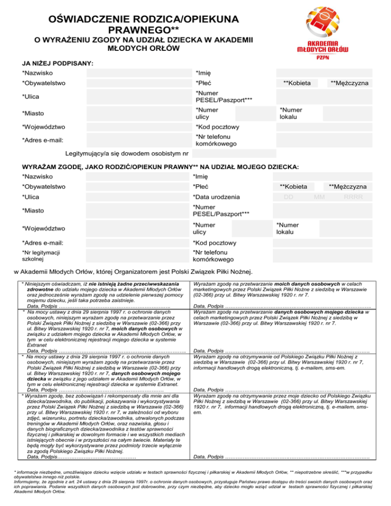 OŚWIADCZENIE RODZICA/OPIEKUNA PRAWNEGO** O WYRAŻENIU ZGODY NA UDZIAŁ DZIECKA W AKADEMII MŁODYCH ORŁÓW JA NIŻEJ PODPISANY: *Nazwisko *Imię *Obywatelstwo *Płeć *Ulica *Numer PESEL/Paszport*** *Miasto *Numer ulicy *Województwo *Kod pocztowy *Adres e-mail: *Nr telefonu komórkowego **Kobieta **Mężczyzna *Numer lokalu Legitymujący/a się dowodem osobistym nr WYRAŻAM ZGODĘ, JAKO RODZIĆ/OPIEKUN PRAWNY** NA UDZIAŁ MOJEGO DZIECKA: *Nazwisko *Imię *Obywatelstwo *Płeć *Ulica *Data urodzenia *Miasto *Numer PESEL/Paszport*** *Województwo *Numer ulicy *Adres e-mail: *Kod pocztowy *Nr legitymacji szkolnej *Nr telefonu komórkowego **Kobieta DD **Mężczyzna MM RRRR *Numer lokalu w Akademii Młodych Orłów, której Organizatorem jest Polski Związek Piłki Nożnej. * Niniejszym oświadczam, iż nie istnieją żadne przeciwwskazania zdrowotne do udziału mojego dziecka w Akademii Młodych Orłów oraz jednocześnie wyrażam zgodę na udzielenie pierwszej pomocy mojemu dziecku, jeśli taka potrzeba zaistnieje. Data, Podpis ………………………………………………………. * Na mocy ustawy z dnia 29 sierpnia 1997 r. o ochronie danych osobowych, niniejszym wyrażam zgodę na przetwarzanie przez Polski Związek Piłki Nożnej z siedzibą w Warszawie (02-366) przy ul. Bitwy Warszawskiej 1920 r. nr 7, moich danych osobowych w związku z udziałem mojego dziecka w Akademii Młodych Orłów, w tym w celu elektronicznej rejestracji mojego dziecka w systemie Extranet Data, Podpis ………………………………………………………………. * Na mocy ustawy z dnia 29 sierpnia 1997 r. o ochronie danych osobowych, niniejszym wyrażam zgodę na przetwarzanie przez Polski Związek Piłki Nożnej z siedzibą w Warszawie (02-366) przy ul. Bitwy Warszawskiej 1920 r. nr 7, danych osobowych mojego dziecka w związku z jego udziałem w Akademii Młodych Orłów, w tym w celu elektronicznej rejestracji dziecka w systemie Extranet. Data, Podpis …………………………………………………… * Wyrażam zgodę, bez zobowiązań i rekompensaty dla mnie ani dla dziecka/zawodnika, do publikacji, pokazywania i wykorzystywania przez Polski Związek Piłki Nożnej z siedzibą w Warszawie (02-366) przy ul. Bitwy Warszawskiej 1920 r. nr 7, w zależności od wyboru zdjęć, wizerunku, portretu dziecka/zawodnika, utrwalonych podczas treningów w Akademii Młodych Orłów, oraz nazwiska, głosu i danych biograficznych dziecka/zawodnika z testów sprawności fizycznej i piłkarskiej w dowolnym formacie i we wszystkich mediach istniejących obecnie i w przyszłości na całym świecie. Materiały te będą mogły być wykorzystywane przez podmioty trzecie wyłącznie za zgodą Polskiego Związku Piłki Nożnej. Data, Podpis……………………………………… Wyrażam zgodę na przetwarzanie moich danych osobowych w celach marketingowych przez Polski Związek Piłki Nożne z siedzibą w Warszawie (02-366) przy ul. Bitwy Warszawskiej 1920 r. nr 7. Data, Podpis ………………….……………….……………………………………. Wyrażam zgodę na przetwarzanie danych osobowych mojego dziecka w celach marketingowych przez Polski Związek Piłki Nożnej z siedzibą w Warszawie (02-366) przy ul. Bitwy Warszawskiej 1920 r. nr 7. Data, Podpis ………………………………….……………………………………. Wyrażam zgodę na otrzymywanie od Polskiego Związku Piłki Nożnej z siedzibą w Warszawie (02-366) przy ul. Bitwy Warszawskiej 1920 r. nr 7, informacji handlowych drogą elektroniczną, tj. e-mailem, sms-em. Data, Podpis ……………………………….………………………………………. Wyrażam zgodę na otrzymywanie przez moje dziecko od Polskiego Związku Piłki Nożnej z siedzibą w Warszawie (02-366) przy ul. Bitwy Warszawskiej 1920 r. nr 7, informacji handlowych drogą elektroniczną, tj. e-mailem, smsem. Data, Podpis ……………………………….………………………………………. * informacje niezbędne, umożliwiające dziecku wzięcie udziału w testach sprawności fizycznej i piłkarskiej w Akademii Młodych Orłów, ** niepotrzebne skreślić, ***w przypadku obywatelstwa innego niż polskie. Informujemy, że zgodnie z art. 24 ustawy z dnia 29 sierpnia 1997r. o ochronie danych osobowych, przysługuje Państwu prawo dostępu do treści swoich danych osobowych oraz ich poprawiania. Podanie wszystkich danych osobowych jest dobrowolne, przy czym niezbędne, aby dziecko mogło wziąć udział w testach sprawności fizycznej i piłkarskiej Akademii Młodych Orłów.