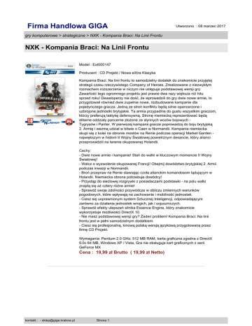 Firma Handlowa GIGA Utworzono : 08 marzec 2017 gry komputerowe > strategiczne > NXK - Kompania Braci: Na Linii Frontu NXK - Kompania Braci: Na Linii Frontu Model : Ext000147 Producent : CD Projekt / Nowa eXtra Klasyka Kompania Braci: Na linii frontu to samodzielny dodatek do znakomicie przyjętej strategii czasu rzeczywistego Company of Heroes. Zrealizowane z niezwykłym rozmachem rozszerzenie w niczym nie ustępuje podstawowej wersji gry. Zawartość tego ogromnego projektu jest prawie dwa razy większa niż hitu sprzed roku! Deweloperzy nie dość, że wprowadzili do gry dwie nowe armie, to przygotowali również dwie zupełnie nowe, rozbudowane kampanie dla pojedynczego gracza. Jedną ze stron konfliktu będą silnie opancerzone i uzbrojone jednostki brytyjskie. Ta armia przypadnie do gustu wszystkim graczom, którzy preferują taktykę defensywną. Stronę niemiecką reprezentować będą elitarne oddziały pancerne złożone ze słynnych wozów bojowych Tygrysów i Panter. W pierwszej kampanii gracze poprowadzą do boju brytyjską 2. Armię i wezmą udział w bitwie o Caen w Normandii. Kampania niemiecka skupi się z kolei na obronie mostów na Renie podczas operacji Market Garden największym w historii II Wojny Światowej powietrznym desancie, który alianci przeprowadzili na terenie okupowanej Holandii. Cechy: - Dwie nowe armie i kampanie! Stań do walki w kluczowym momencie II Wojny Światowej! - Walcz o wyzwolenie okupowanej Francji! Obejmij dowództwo brytyjskiej 2. Armii podczas inwazji w Normandii. - Broń przepraw na Renie stawiając czoła alianckim komandosom lądującym w Holandii. Niemiecka obrona potrzebuje dowódcy! - Przystąp do sieciowej rozgrywki z posiadaczami podstawki - na polu walki znajdą się aż cztery różne armie! - Sprawdź swoje zdolności przywódcze w obliczu zmiennych warunków pogodowych, które wpływają na zachowanie i mobilność jednostek. - Ciesz się usprawnionym system Sztucznej Inteligencji, odpowiadającym zarówno za działania jednostek wrogich, jak i sojuszniczych. - Sprawdź efekty ulepszeń silnika Essence Engine, który znakomicie wykorzystuje możliwości DirectX 10. - Nie masz podstawowej wersji gry? Żaden problem! Kompania Braci: Na linii frontu jest w pełni samodzielnym dodatkiem. - Ciesz się profesjonalną, kinową polską wersją językową przygotowaną przez firmę CD Projekt. Wymagania: Pentium 2.0 GHz, 512 MB RAM, karta graficzna zgodna z DirectX 9.0c 64 MB, Windows XP / Vista, Gra nie obsługuje kart graficznych z serii GeForce MX Cena : 19,99 zł Brutto ( 19,99 zł Netto) kontakt : - [email protected] Strona 1