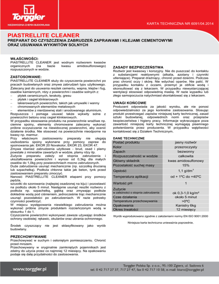 KARTA TECHNICZNA NR 6091/04.2014 PIASTRELLITE CLEANER PREPARAT DO CZYSZCZENIA ZABRUDZEŃ ZAPRAWAMI I KLEJAMI CEMENTOWYMI ORAZ USUWANIA WYKWITÓW SOLNYCH WŁAŚCIWOŚCI: PIASTRELLITE CLEANER jest wodnym roztworem kwasów organicznych (na bazie kwasu amidosulfonowego) rozpuszczonych w wodzie. ZASTOSOWANIE: PIASTRELLITE CLEANER służy do czyszczenia powierzchni po pracach budowlanych oraz zmywa zabrudzeń typu użytkowego. Zalecany jest do usuwania resztek cementu, wapna, klejów i fug, osadów kamiennych, rdzy z powierzchni i osadów solnych z: − płytek ceramicznych, terakoty, gresu − płytek i cegieł klinkierowych − lakierowanych powierzchni, takich jak umywalki i wanny − chromowanych elementów metalowych − elementów z nierdzewnej stali i anodowanego aluminium. Rozpuszcza i pomaga usuwać także wykwity solne z powierzchni betonu oraz cegieł klinkierowych. W przypadku stosowania produktu na powierzchnie wrażliwe np. ciemne spoiny, elementy chromowane zalecamy wykonać próbne oczyszczanie na niewidocznej powierzchni, aby ocenić działanie środka. Nie stosować na powierzchnie nieodporne na kwasy np. marmur. Przy właściwym zastosowaniu preparaty nie ulegają uszkodzeniu spoiny wykonane przy pomocy zapraw do spoinowania jak: EKOR 20 Novakolor, EKOR 23, EKOR 47. Zmywa również zabrudzenia użytkowe - brud, osad i plamy powstałe z minerałów zawartych w wodzie, plamy rdzy itp. Zużycie preparatu zależy od stopnia zabrudzenia i ukształtowania powierzchni i wynosi od 0,3kg dla małych osadów do 1,0kg przy powierzchniach mocno zabrudzonych. Duże zabrudzenia usunąć mechanicznie (np. szczotką drucianą lub szpachelką). Podłoża chłonne takie jak beton, tynk przed zastosowaniem preparatu zmoczyć. Nanosić PIASTRELLITE CLEANER etapami przy pomocy pędzla, szczotki do szorowania (najlepiej osadzonej na kiju) i pozostawić na podłożu około 5 minut. Następnie usunąć resztki roztworu z podłoża np. szpachelką, gąbką oraz zmywając podłoże dokładnie wodą pod ciśnieniem, jednocześnie trąc mechanicznie usunąć pozostałości po zabrudzeniach. W razie potrzeby czynności powtórzyć. W miejscu występowania niewielkiego zabrudzenia można wykonać próbne zmycie produktem rozcieńczonym wodą w stosunku 1 do 1. Czyszczenie powierzchni wykonywać zawsze używając środków ochrony osobistej: rękawic, okularów oraz ubrania ochronnego. Środek czyszczący budowlany. nie PRZECHOWYWANIE jest sklasyfikowany jako wyrób Przechowywać w suchym i osłoniętym pomieszczeniu. Chronić przed mrozem. Przechowywany w oryginalnie zamkniętych pojemnikach jest zdatny do użycia przez co najmniej 12 miesięcy. Na opakowaniu podaje się datę przydatności do zastosowania. ZASADY BEZPIECZEŃSTWA Roztwór jest kwasowy i korozyjny. Nie do puszczać do kontaktu z substancjami reaktywnymi (alkalia, azotany i czynniki utleniające). Preparat drażniący, chronić przed dziećmi. Podczas prac chronić oczy i skórę. Nie wdychać oparów. Nie palić. W przypadku kontaktu z oczami, przemyć je obficie wodą i skonsultować się z lekarzem. W przypadku niewystarczającej wentylacji stosować odpowiednią maskę. W razie wypadku lub złego samopoczucia natychmiast skontaktować się z lekarzem. UWAGI KOŃCOWE Producent odpowiada za jakość wyrobu, ale nie ponosi odpowiedzialności za jego konkretne zastosowania. Stosując produkt przestrzegać zapisów niniejszej karty technicznej, zasad sztuki budowlanej, odpowiednich norm oraz przepisów bezpieczeństwa i higieny pracy. Informacje wykraczające poza zawartość niniejszej karty technicznej wymagają pisemnego potwierdzenia przez producenta. W przypadku wątpliwości kontaktować się z Działem Technicznym. DANE TECHNICZNE Postać produktu Kolor Zapach Rozpuszczalność w wodzie Główny składnik Pozostałość suchej masy Gęstość jasny roztwór przezroczysty bezwonny całkowita kwas amidosulfonowy 15% 1,1 g/dm Temperatura aplikacji Wartość pH 3 od + 1ºC do +40ºC 1 Zużycie w zależności o stopnia zabrudzenia Czas działania Temperatura przechowywania Opakowania Okres trwałości ok 0,3-1,0 kg/m² około 5 minut >0ºC Kanistry 6kg 12 miesięcy Wyrób wyprodukowano zgodnie z założeniami normy EN ISO 9001:2000 Niniejsza karta techniczna unieważnia poprzednie.