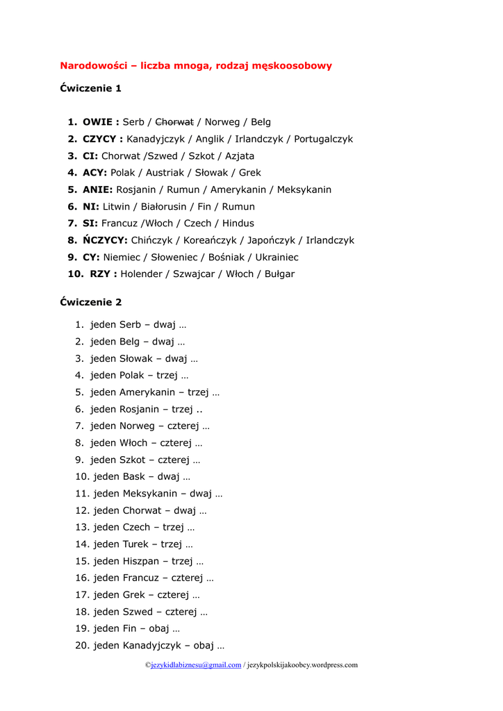 Narodowości – liczba mnoga, rodzaj męskoosobowy Ćwiczenie 1 1. OWIE : Serb / Chorwat / Norweg / Belg 2. CZYCY : Kanadyjczyk / Anglik / Irlandczyk / Portugalczyk 3. CI: Chorwat /Szwed / Szkot / Azjata 4. ACY: Polak / Austriak / Słowak / Grek 5. ANIE: Rosjanin / Rumun / Amerykanin / Meksykanin 6. NI: Litwin / Białorusin / Fin / Rumun 7. SI: Francuz /Włoch / Czech / Hindus 8. ŃCZYCY: Chińczyk / Koreańczyk / Japończyk / Irlandczyk 9. CY: Niemiec / Słoweniec / Bośniak / Ukrainiec 10. RZY : Holender / Szwajcar / Włoch / Bułgar Ćwiczenie 2 1. jeden Serb – dwaj … 2. jeden Belg – dwaj … 3. jeden Słowak – dwaj … 4. jeden Polak – trzej … 5. jeden Amerykanin – trzej … 6. jeden Rosjanin – trzej .. 7. jeden Norweg – czterej … 8. jeden Włoch – czterej … 9. jeden Szkot – czterej … 10. jeden Bask – dwaj … 11. jeden Meksykanin – dwaj … 12. jeden Chorwat – dwaj … 13. jeden Czech – trzej … 14. jeden Turek – trzej … 15. jeden Hiszpan – trzej … 16. jeden Francuz – czterej … 17. jeden Grek – czterej … 18. jeden Szwed – czterej … 19. jeden Fin – obaj … 20. jeden Kanadyjczyk – obaj … ©[email protected] / jezykpolskijakoobcy.wordpress.com Ćwiczenie 3 1. Szkoci są bardzo mili. Szkot jest bardzo miły. 2. Francuzi są towarzyscy. F___________________________________ 3. Polacy byli pierwsi na mecie. P_______________________________ 4. Anglicy zareagowali arogancko. A______________________________ 5. Portugalczycy są bardzo pewni siebie. P __________________________ 5. Grecy powinni być teraz bardziej pracowici. G__________________________ 6. Włosi są bardziej rodzinni niż Austriacy. W_____________________________ 7. Serbowie są tacy sami jak Chorwaci. S_______________________________ 8. Ci Hiszpanie są doskonałymi zawodnikami. ___ H_______________________ 9. Czy Amerykanie potrafią jeszcze wygrać ten mecz? ____________________? 10. Ci Japończycy nie są szczerzy. ___ J _______________________________ Ćwiczenie 4 1. Moim zdaniem Azjaci (mieszkańcy Azji) są bardziej systematyczni niż _____________ (mieszkańcy Europy). 2. Jestem przekonana, że ____________ (zawodnicy Francji) wygrają z Hiszpanami. 3. Uważam, że _____________ i _____________(mieszkańcy Holandii i Belgii) są bardzo oszczędni. 4. Dwie minuty przed końcem _______________ (zawodnicy Polski) remisują z Włochami 1:1. 5. _______________ (mieszkańcy Anglii) są towarzyscy i pracowici. 6. _______________ (mieszkańcy Turcji) są przyzwyczajeni do wysokich temperatur. 7. ______________ (drużyna Węgier) wygrali z _______________ (drużyną Danii). 8. ______________ (mieszkańcy Izraela) wybrali nowy parlament. 9. ______________ (mieszkańcy Portugalii) są bardziej otwarci niż _____________ (mieszkańcy Kanady). 10. ____________ (mieszkańcy Czech) mają lepsze piwo niż _______________ (mieszkańcy Włoch). ©[email protected] / jezykpolskijakoobcy.wordpress.com