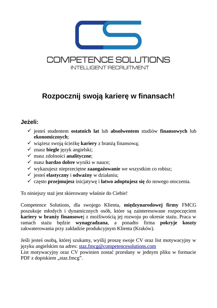 Rozpocznij swoją karierę w finansach! Jeżeli: jesteś studentem ostatnich lat lub absolwentem studiów finansowych lub ekonomicznych; wiążesz swoją ścieżkę kariery z branżą finansową; znasz biegle język angielski; masz zdolności analityczne; masz bardzo dobre wyniki w nauce; wykazujesz nieprzeciętne zaangażowanie we wszystkim co robisz; jesteś elastyczny i odważny w działaniu; często przejmujesz inicjatywę i łatwo adoptujesz się do nowego otoczenia. To niniejszy staż jest skierowany właśnie do Ciebie! Competence Solutions, dla swojego Klienta, międzynarodowej firmy FMCG poszukuje młodych i dynamicznych osób, które są zainteresowane rozpoczęciem kariery w branży finansowej z możliwością jej rozwoju po okresie stażu. Praca w ramach stażu będzie wynagradzana, a ponadto firma pokryje koszty zakwaterowania przy zakładzie produkcyjnym Klienta (Kraków). Jeśli jesteś osobą, której szukamy, wyślij proszę swoje CV oraz list motywacyjny w języku angielskim na adres: [email protected] List motywacyjny oraz CV powinien zostać przesłany w jednym pliku w formacie PDF z dopiskiem „staz.fmcg”.