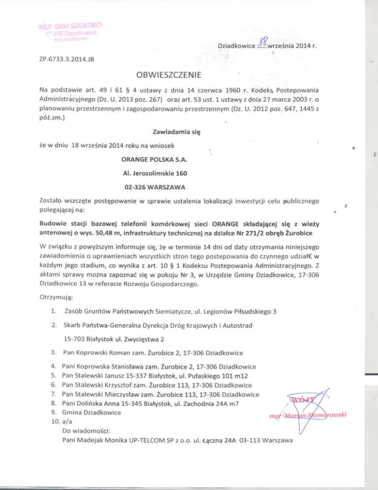 IA/ÓJ1 GMI~iY'1:, Im, I 'WW~ 17-306 DziarlL WIl'" wOJ oodl,~<;iiE' DziadkowiceAfwrzesnia 2014 r. -~ ", 'x ZP.6733.3.2014.JB .' OBWIESZCZENIE Na podstawie art. 49 i 61 § 4 ustawy z dnia 14 czerwca 1960 r. Kodek~Postepowania Administracyjnego (Dz.U. 2013 poz. 267) oraz art. 53 ust. 1 ustawy z dnia 27'marca 2003 r. o planowaniu przestrzennym i zagospodarowaniu przestrzennym (Dz.U. 2012 poz: 64711445 z póz.zm.) Zawiadamia sie ze w dniu 18 wrzesnia 2014 roku na wniosek . ORANGE POLSKA S.A. Al. Jerozolimskie 160 02-326 WARSZAWA Zostalo wszczete postepowanie w sprawie ustalenia lokalizacjiinwestycji celu publicznego polegajacej na: Budowie stacji bazowej telefonii komórkowej sieci ORANGEskladajacej sie z wieiy antenowej o wys. 50,48 m, infrastruktury technicznej na dzialce Nr 271/2 obreb Zurobice W zwiazku z powyzszym informuje siel ze w terminie 14 dni od daty otrzymania niniejszego zawiadomienia o uprawnieniach wszystkich stron tego postepowania do czynnego udzial€ w kazdym jego stadiuml co wynika z art. 10 § 1 Kodeksu Postepowania Administracyjnego. Z aktami sprawy mozna zapoznac sie w pokoju Nr 31w Urzedzie Gminy Dziadkowicel 17-306 Dziadkowice13 w referacie RozwojuGospodarczego. Otrzymuja: 1. Zasób Gruntów Panstwowych Siemiatyczel ul. LegionówPilsudskiego3 2. Skarb Panstwa-Generalna DyrekcjaDróg Krajowychi Autostrad 15-703 Bialystokul. Zwyciestwa2 3. Pan KoprowskiRoman zam. Zurobice 2/17-306 Dziadkowice 4. Pani KoprowskaStanislawa zam. Zurobice 2,17-306 Dziadkowice 5. Pan StalewskiJanusz 15-337 BialystokIul. Pulaskiego 101 m12 6. Pan Stalewski Krzysztofzam. Zurobice 113117-306 Dziadkowice 7. Pan Stalewski Mieczyslawzam. Zurobice 113/17-306 Dziadkowice 8. Pani DolinskaAnna 15-345 BialystokIul. Zachodnia 24Am7 9. Gmina Dziadkowice 10. a/a Dowiadomosci: Pani Madejak Monika UP-TELCOM SPz 0.0. ul. Laczna24A 03-113 Warszawa -