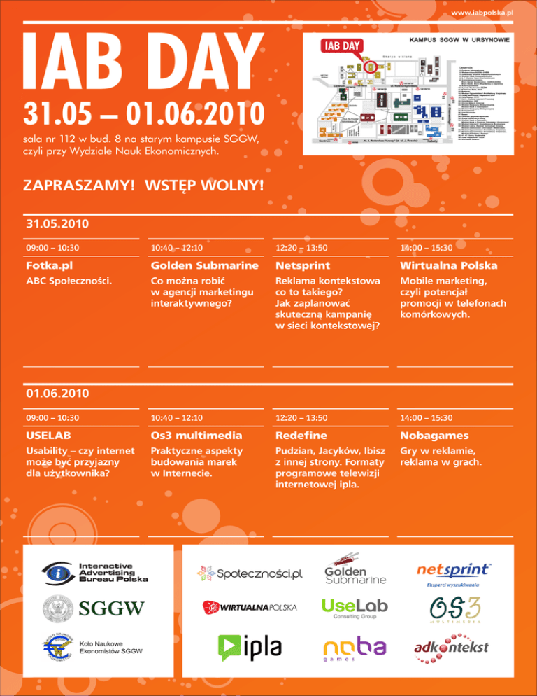 www.iabpolska.pl 31.05 – 01.06.2010 sala nr 112 w bud. 8 na starym kampusie SGGW, czyli przy Wydziale Nauk Ekonomicznych. ZAPRASZAMY! WSTĘP WOLNY! 31.05.2010 09:00 – 10:30 10:40 – 12:10 12:20 – 13:50 14:00 – 15:30 Fotka.pl Golden Submarine Netsprint Wirtualna Polska ABC Społeczności. Co można robić w agencji marketingu interaktywnego? Reklama kontekstowa co to takiego? Jak zaplanować skuteczną kampanię w sieci kontekstowej? Mobile marketing, czyli potencjał promocji w telefonach komórkowych. 09:00 – 10:30 10:40 – 12:10 12:20 – 13:50 14:00 – 15:30 USELAB Os3 multimedia Redefine Nobagames Usability – czy internet może być przyjazny dla użytkownika? Praktyczne aspekty budowania marek w Internecie. Pudzian, Jacyków, Ibisz z innej strony. Formaty programowe telewizji internetowej ipla. Gry w reklamie, reklama w grach. 01.06.2010