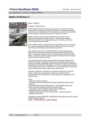 Firma Handlowa GIGA Utworzono : 08 marzec 2017 gry komputerowe > symulatory > Battle Of Britain 2 Battle Of Britain 2 Model : NIc000047 Producent : Nicolas Games Battle of Britain 2 Wings of Victory przenosi gracza w okres słynnych walk powietrznych nad południową Anglią w 1940 roku. Gra dostarczy doskonałej rozrywki zarówno weteranom gier, jak i okazjonalnym graczom i pozwoli bliżej poznać ten jeden z najbardziej znaczących momentów w historii. Należy zauważyć, że jest to premiera tego tytułu na polskim rynku, a Nicolas Games postanowił wydać ten tytuł w ramach nowej inicjatywy "Premierowe Zbicie Cen", w której każda gra jest nowością na rodzimym rynku i kosztuje zaledwie 29,99zł. W grze Battle of Britain 2 „Wings of Victory” gracz może wcielić się w głównodowodzącego jednej ze stron konfliktu lub skupić się na walce powietrznej, pozostawiając sprawy taktyczne generałom. Jako dowódca gracz może kontrolować działania wojenne pojedynczych jednostek oraz budynków w świecie w którym tysiące samolotów walczy ze sobą o supremację w powietrzu. Każdy z tysięcy pojedynczych celów wśród których znajdują się samoloty, zakłady zbrojeniowe, stacje radarowe, odgrywa określoną rolę w toczącej się wojnie. W tej ogromnej kampanii gracz może obserwować zarówno brytyjskie, jak i niemieckie samoloty wypełniające swoje dzienne obowiązki a także samemu wskoczyć do kokpitu brytyjskiego myśliwca Hurricane lub Spitfire, niemieckiego Messerschmitta, bombowca nurkującego Ju 87 Stuka czy zająć pozycję strzelca w bombowcach Dornier Do17, Heinkel He11 czy Ju 88. Wszystko co gracz musi uczynić jako pilot to zniszczyć wroga i wyjść z bitwy żywym. Cokolwiek wybierzesz, znajdziesz się w świecie bezustannych niemieckich nalotów bombowych, biorąc udział w historycznym odtworzeniu tych niesamowitych starć powietrznych. A zatem zapnij pasy i przygotuj się na lot swojego życia! Cechy: - Wybuchowa walka powietrzna - Wspaniałe historyczne odtworzenie słynnych powietrznych bitew II wojny światowej - Technologia „Real Weather”, umożliwiająca odtworzenie frontów burzowych mogących przełamać samolot na pół - Technologia sztucznej inteligencji „Real Pilot” - Realistyczny dźwięk, włączając warkot silnika - Niebywałe efekty wizualne, doskonałe wybuchy i uderzenia pocisków - Dogłębna komunikacja Wymagania: Pentium III 800 MHz, 256 MB RAM, karta graficzna zgodna z DirectX 128MB, Windows 2000/XP Cena : 9,99 zł Brutto ( 9,99 zł Netto) kontakt : - [email protected] Strona 1