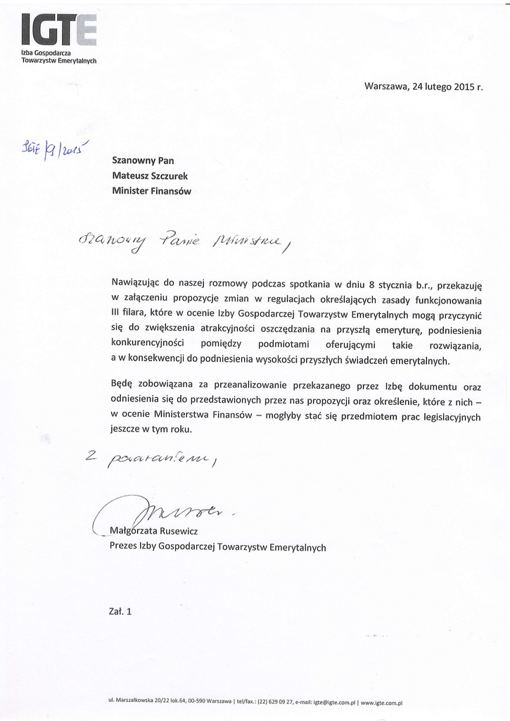 IGTffi lzba Gospodarcza Towarzystw Emerytalnych Warszawa, 24lutego 2015 r. J6i,pl*" Szanowny Pan Mateusz Szczurek Minister Finans6w d?+luo+ ?ut',,,,8 gt /l./.ti+it sltzu / Nawiqzujqc do naszej rozmowy podczas spotkania w dniu 8 stycznia b.r., przekazujq w zatqczeniu propozycje zmian w regulacjach okre6lajqcych zasady funkcjonowania lll filara, kt6re w ocenie lzby Gospodarczej Towarzystw Emerytalnych mogq przyczyni(, siq do zwiqkszenia atrakcyjno5ci oszczqdzania na przysztq emeryturq, podniesienia konkurencyjnosci pomiqdzy podmiotami oferuiqcymi takie rozwiqzania, w konsekwencji do podniesienia wysokoSci przyszfych Swiadczef emerytalnych. a Bqdq zobowiqzana za przeanalizowanie przekazanego przez lzbq dokumentu oraz odniesienia siq do przedstawionych przez nas propozycji oraz okre6lenie, kt6re z nich w ocenie Ministerstwa Finans6w - mogtyby stai siq przedmiotem prac legislacyjnych jeszcze w tym roku. Z /zaa6' -''1"'""\r ,'.. ,'"' i_ \ t-avn,Q42.o. , \ ,l7rl, ,ttrr/vftv //r'- Matg6rzata Rusewicz Prezes lzby Gospodarczej Towarzystw Emerytalnych Zal. ul t Marszalkowska 20/221ok,64,00-590 warszawa I telfax.: (22) 629 og 27, e-mail: [email protected] www,igte,com,pl I