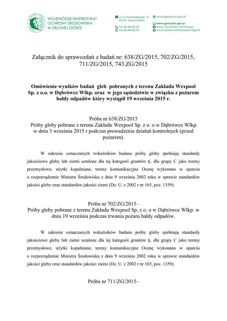 Załącznik do sprawozdań z badań nr: 638/ZG/2015, 702/ZG/2015, 711/ZG/2015, 743.ZG/2015 Omówienie wyników badań gleb pobranych z terenu Zakładu Wexpool Sp. z o.o. w Dąbrówce Wlkp. oraz w jego sąsiedztwie w związku z pożarem hałdy odpadów który wystąpił 19 września 2015 r. Próba nr 638/ZG/2015 Próby gleby pobrane z terenu Zakładu Wexpool Sp. z o. o w Dąbrówce Wlkp. w dniu 3 września 2015 r podczas prowadzenia działań kontrolnych (przed pożarem). W zakresie oznaczanych wskaźników badane próby gleby spełniają standardy jakościowe gleby lub ziemi ustalone dla tej kategorii gruntów tj. dla grupy C jako tereny przemysłowe, użytki kopalniane, tereny komunikacyjne Ocenę wykonano w oparciu o rozporządzenie Ministra Środowiska z dnia 9 września 2002 roku w sprawie standardów jakości gleby oraz standardów jakości ziemi (Dz. U. z 2002 r nr 165, poz. 1359). Próba nr 702/ZG/2015– Próby gleby pobrane z terenu Zakładu Wexpool Sp. z o. o w Dąbrówce Wlkp. w dniu 19 września podczas trwania pożaru hałdy odpadów. W zakresie oznaczanych wskaźników badane próby gleby spełniają standardy jakościowe gleby lub ziemi ustalone dla tej kategorii gruntów tj. dla grupy C jako tereny przemysłowe, użytki kopalniane, tereny komunikacyjne Ocenę wykonano w oparciu o rozporządzenie Ministra Środowiska z dnia 9 września 2002 roku w sprawie standardów jakości gleby oraz standardów jakości ziemi (Dz. U. z 2002 r nr 165, poz. 1359). Próba nr 711/ZG/2015– Próby gleby pobrane z terenów wokół Zakładu Wexpool Sp. z o. o w Dąbrówce Wlkp. w dniu 22 września 2015 r. w trakcie trwania akcji ratowniczej związanej z gaszeniem hałdy odpadów. Spośród czterech prób gleb pobranych z gruntów rolnych wokół zakładu Wexpool Sp. z o.o. w Dąbrówce Wlkp. trzy spełniały standardy jakościowe gleby lub ziemi ustalone dla tej kategorii gruntów tj grupy B jako grunty zaliczone do użytków rolnych z wyłączeniem gruntów pod stawami i gruntów pod rowami, grunty leśne oraz zadrzewione i zakrzewione, nieużytki, a także grunty zabudowane i zurbanizowane z wyłączeniem terenów przemysłowych, użytków kopalnianych oraz terenów komunikacyjnych. W jednej próbie pobranej z użytków rolnych zlokalizowanych na kierunku wschodnim od zakładu (próba nr 3060/ZG) stwierdzono przekroczenie standardów jakości gleby w zakresie benzo(a)pirenu Ocenę wykonano w oparciu o rozporządzenie Ministra Środowiska z dnia 9 września 2002 roku w sprawie standardów jakości gleby oraz standardów jakości ziemi (Dz. U. z 2002 r nr 165, poz. 1359). Próba nr 743/ZG/2015– Próby gleby pobrane z terenów wokół Zakładu Wexpool Sp. z o. o w Dąbrówce Wlkp. w dniu 28 września 2015 r. po zakończeniu akcji ratowniczej związanej z gaszenia hałdy odpadów. Spośród sześciu prób gleb pobranych z gruntów rolnych i terenów zabudowanych wokół zakładu Wexpool Sp. z o.o. w Dąbrówce Wlkp. .pięć spełniało standardy jakościowe gleby lub ziemi ustalone dla tej kategorii gruntów tj grupy B jako grunty zaliczone do użytków rolnych z wyłączeniem gruntów pod stawami i gruntów pod rowami, grunty leśne oraz zadrzewione i zakrzewione, nieużytki, a także grunty zabudowane i zurbanizowane z wyłączeniem terenów przemysłowych, użytków kopalnianych oraz terenów komunikacyjnych. W jednej próbie pobranej z użytków rolnych zlokalizowanych na kierunku wschodnim od zakładu (próba nr 3121/ZG) stwierdzono przekroczenie standardów jakości gleby w zakresie zanieczyszczeń węglowodorowych grupy III/D wielkopierścieniowych węglowodorów aromatycznych (WWA). Ocenę wykonano w oparciu o rozporządzenie Ministra Środowiska z dnia 9 września 2002 roku w sprawie standardów jakości gleby oraz standardów jakości ziemi (Dz. U. z 2002 r nr 165, poz. 1359). W dniu 12 października 2015 r. pobrana została próba w celu potwierdzenia poziomu zanieczyszczeń gleb w tym miejscu. Ponadto w ramach interwencji w związku z informacją zgłoszoną przez mieszkańca wsi Dąbrówka Wlkp. wskazującą na przedostanie się wód popożarowych poza teren zakładu WEXPOOL na przyległy grunt rolny pobrana została próba gleby w miejscu, w którym doszło do zanieczyszczenia w celu ustalenia czy nie doszło do szkody w środowisku. Wyniki badań będą znane po ok. 10 dniach od dnia przekazania prób do badań laboratoryjnych. Załącznik do sprawozdań z badań nr: 712/ZG/2015, 725/ZG/2015, 742/ZG/2015. Omówienie wyników badań wód podziemnych i powierzchniowych pobranych w sąsiedztwie Zakładu Wexpool Sp. z o.o. w Dąbrówce Wlkp. w związku z pożarem hałdy odpadów który wystąpił w dniach 19 – 25 września 2015 r. Na podstawie wyników badań uzyskanych z dwóch punktów poboru wody podziemnej: ze studni SW3 oraz ze studni SW2 z próbek pobranych 22 września 2015 r. stwierdzono, iż woda podziemna dla większości badanych parametrów spełniała wymagania dla wód w zakresie I klasy (wody bardzo dobrej jakości), poza wodą ze studni SW2 gdzie stwierdzono wartości niklu - w zakresie II klasy (wody dobrej jakości) zgodnie z Rozporządzeniem Ministra Środowiska z dnia 23 lipca 2008 r. w sprawie kryteriów i sposobu oceny stanu wód podziemnych (Dz. U. Nr 143, poz. 896). W próbce badania wody powierzchniowej ze stawu hodowlanego w Dąbrówce Wlkp., należącego do Kazimierza Witwickiego (próba pobrana 23 września 2015 r.) wskazały na spełnienie wymagań badanych parametrów zgodnie z Rozporządzeniem Ministra Środowiska z dnia 22 października 2014 r. w sprawie sposobu klasyfikacji stanu jednolitych części wód powierzchniowych oraz środowiskowych norm jakości dla substancji priorytetowych (Dz. U. z 2014 r., poz. 1482). Wyniki badań nie wykazały niepokojących wartości dla zbiorników wodnych. 28 września 2015 r. powtórnie (po zakończeniu akcji gaśniczej na terenie Zakładu Wexpool) w trzech wymienionych powyżej punktach pobrano próby wody p