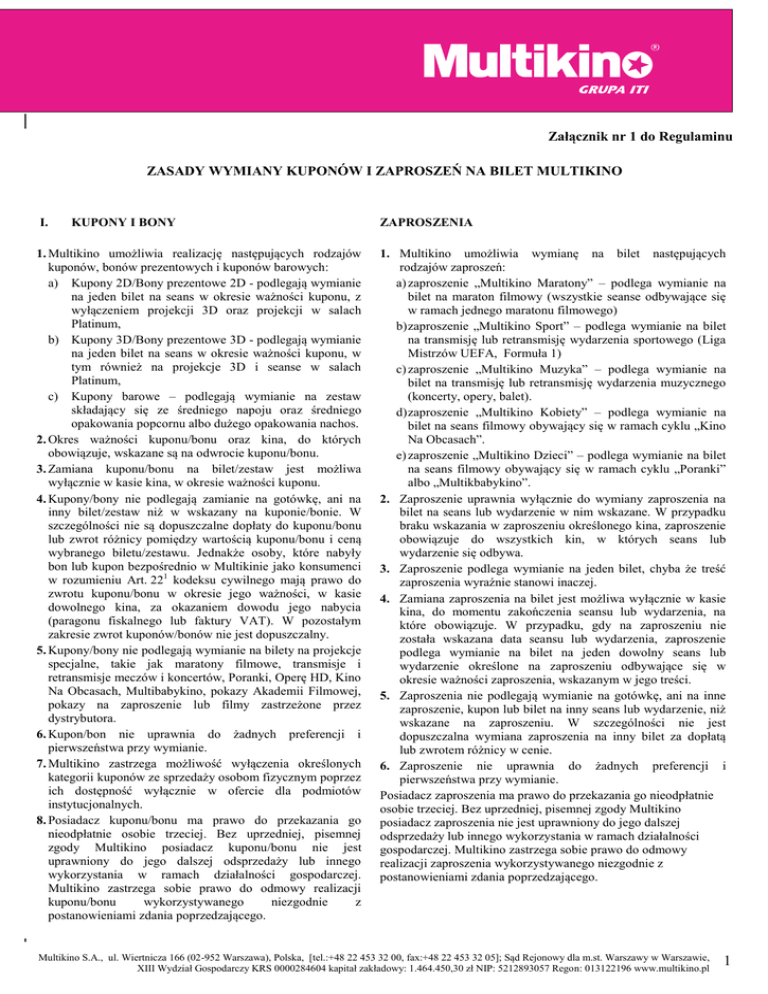 Załącznik nr 1 do Regulaminu ZASADY WYMIANY KUPONÓW I ZAPROSZEŃ NA BILET MULTIKINO I. KUPONY I BONY II. 1. Multikino umożliwia realizację następujących rodzajów kuponów, bonów prezentowych i kuponów barowych: a) Kupony 2D/Bony prezentowe 2D - podlegają wymianie na jeden bilet na seans w okresie ważności kuponu, z wyłączeniem projekcji 3D oraz projekcji w salach Platinum, b) Kupony 3D/Bony prezentowe 3D - podlegają wymianie na jeden bilet na seans w okresie ważności kuponu, w tym również na projekcje 3D i seanse w salach Platinum, c) Kupony barowe – podlegają wymianie na zestaw składający się ze średniego napoju oraz średniego opakowania popcornu albo dużego opakowania nachos. 2. Okres ważności kuponu/bonu oraz kina, do których obowiązuje, wskazane są na odwrocie kuponu/bonu. 3. Zamiana kuponu/bonu na bilet/zestaw jest możliwa wyłącznie w kasie kina, w okresie ważności kuponu. 4. Kupony/bony nie podlegają zamianie na gotówkę, ani na inny bilet/zestaw niż w wskazany na kuponie/bonie. W szczególności nie są dopuszczalne dopłaty do kuponu/bonu lub zwrot różnicy pomiędzy wartością kuponu/bonu i ceną wybranego biletu/zestawu. Jednakże osoby, które nabyły bon lub kupon bezpośrednio w Multikinie jako konsumenci w rozumieniu Art. 221 kodeksu cywilnego mają prawo do zwrotu kuponu/bonu w okresie jego ważności, w kasie dowolnego kina, za okazaniem dowodu jego nabycia (paragonu fiskalnego lub faktury VAT). W pozostałym zakresie zwrot kuponów/bonów nie jest dopuszczalny. 5. Kupony/bony nie podlegają wymianie na bilety na projekcje specjalne, takie jak maratony filmowe, transmisje i retransmisje meczów i koncertów, Poranki, Operę HD, Kino Na Obcasach, Multibabykino, pokazy Akademii Filmowej, pokazy na zaproszenie lub filmy zastrzeżone przez dystrybutora. 6. Kupon/bon nie uprawnia do żadnych preferencji i pierwszeństwa przy wymianie. 7. Multikino zastrzega możliwość wyłączenia określonych kategorii kuponów ze sprzedaży osobom fizycznym poprzez ich dostępność wyłącznie w ofercie dla podmiotów instytucjonalnych. 8. Posiadacz kuponu/bonu ma prawo do przekazania go nieodpłatnie osobie trzeciej. Bez uprzedniej, pisemnej zgody Multikino posiadacz kuponu/bonu nie jest uprawniony do jego dalszej odsprzedaży lub innego wykorzystania w ramach działalności gospodarczej. Multikino zastrzega sobie prawo do odmowy realizacji kuponu/bonu wykorzystywanego niezgodnie z postanowieniami zdania poprzedzającego. ZAPROSZENIA 1. Multikino umożliwia wymianę na bilet następujących rodzajów zaproszeń: a) zaproszenie „Multikino Maratony” – podlega wymianie na bilet na maraton filmowy (wszystkie seanse odbywające się w ramach jednego maratonu filmowego) b) zaproszenie „Multikino Sport” – podlega wymianie na bilet na transmisję lub retransmisję wydarzenia sportowego (Liga Mistrzów UEFA, Formuła 1) c) zaproszenie „Multikino Muzyka” – podlega wymianie na bilet na transmisję lub retransmisję wydarzenia muzycznego (koncerty, opery, balet). d) zaproszenie „Multikino Kobiety” – podlega wymianie na bilet na seans filmowy obywający się w ramach cyklu „Kino Na Obcasach”. e) zaproszenie „Multikino Dzieci” – podlega wymianie na bilet na seans filmowy obywający się w ramach cyklu „Poranki” albo „Multikbabykino”. 2. Zaproszenie uprawnia wyłącznie do wymiany zaproszenia na bilet na seans lub wydarzenie w nim wskazane. W przypadku braku wskazania w zaproszeniu określonego kina, zaproszenie obowiązuje do wszystkich kin, w których seans lub wydarzenie się odbywa. 3. Zaproszenie podlega wymianie na jeden bilet, chyba że treść zaproszenia wyraźnie stanowi inaczej. 4. Zamiana zaproszenia na bilet jest możliwa wyłącznie w kasie kina, do momentu zakończenia seansu lub wydarzenia, na które obowiązuje. W przypadku, gdy na zaproszeniu nie została wskazana data seansu lub wydarzenia, zaproszenie podlega wymianie na bilet na jeden dowolny seans lub wydarzenie określone na zaproszeniu odbywające się w okresie ważności zaproszenia, wskazanym w jego treści. 5. Zaproszenia nie podlegają wymianie na gotówkę, ani na inne zaproszenie, kupon lub bilet na inny seans lub wydarzenie, niż wskazane na zaproszeniu. W szczególności nie jest dopuszczalna wymiana zaproszenia na inny bilet za dopłatą lub zwrotem różnicy w cenie. 6. Zaproszenie nie uprawnia do żadnych preferencji i pierwszeństwa przy wymianie. Posiadacz zaproszenia ma prawo do przekazania go nieodpłatnie osobie trzeciej. Bez uprzedniej, pisemnej zgody Multikino posiadacz zaproszenia nie jest uprawniony do jego dalszej odsprzedaży lub innego wykorzystania w ramach działalności gospodarczej. Multikino zastrzega sobie prawo do odmowy realizacji zaproszenia wykorzystywanego niezgodnie z postanowieniami zdania poprzedzającego. Multikino S.A., ul. Wiertnicza 166 (02-952 Warszawa), Polska, [tel.:+48 22 453 32 00, fax:+48 22 453 32 05]; Sąd Rejonowy dla m.st. Warszawy w Warszawie, XIII Wydział Gospodarczy KRS 0000284604 kapitał zakładowy: 1.464.450,30 zł NIP: 5212893057 Regon: 013122196 www.multikino.pl 1 Multikino S.A., ul. Wiertnicza 166 (02-952 Warszawa), Polska, [tel.:+48 22 453 32 00, fax:+48 22 453 32 05]; Sąd Rejonowy dla m.st. Warszawy w Warszawie, XIII Wydział Gospodarczy KRS 0000284604 kapitał zakładowy: 1.464.450,30 zł NIP: 5212893057 Regon: 013122196 www.multikino.pl 2