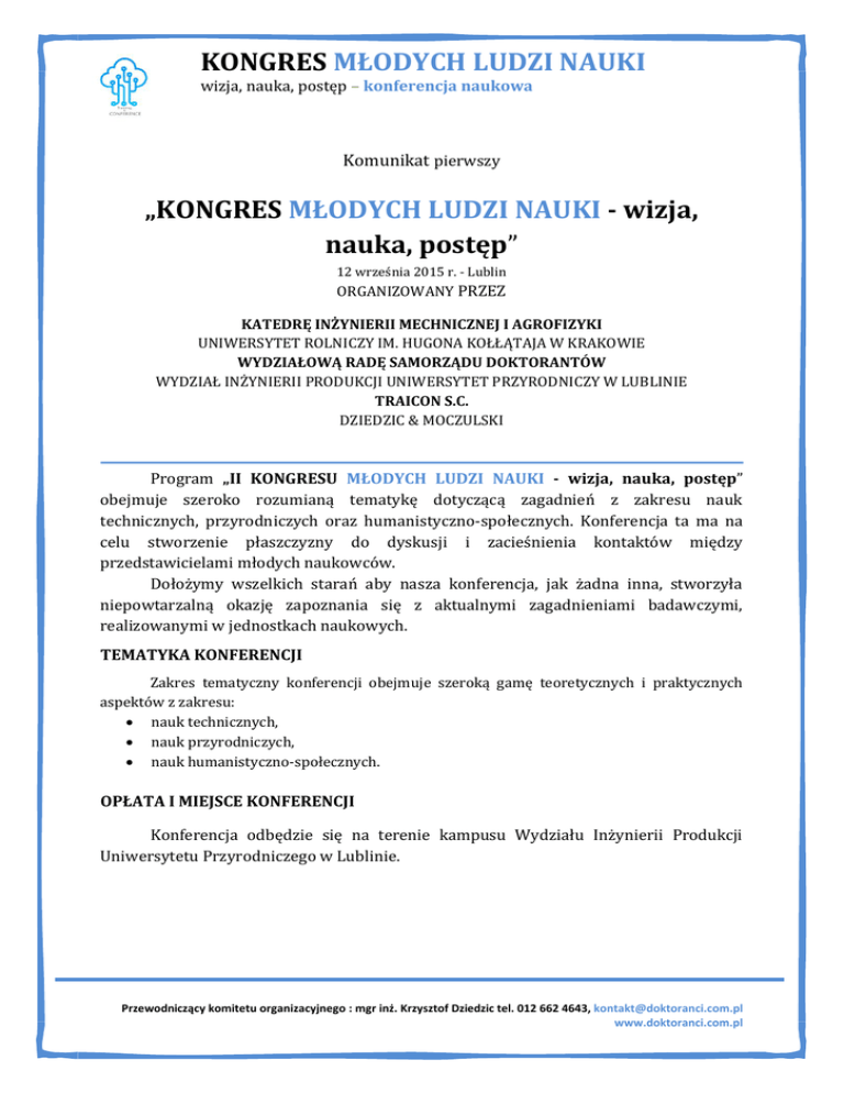 KONGRES MŁODYCH LUDZI NAUKI wizja, nauka, postęp – konferencja naukowa Komunikat pierwszy „KONGRES MŁODYCH LUDZI NAUKI - wizja, nauka, postęp” 12 września 2015 r. - Lublin ORGANIZOWANY PRZEZ KATEDRĘ INŻYNIERII MECHNICZNEJ I AGROFIZYKI UNIWERSYTET ROLNICZY IM. HUGONA KOŁŁĄTAJA W KRAKOWIE WYDZIAŁOWĄ RADĘ SAMORZĄDU DOKTORANTÓW WYDZIAŁ INŻYNIERII PRODUKCJI UNIWERSYTET PRZYRODNICZY W LUBLINIE TRAICON S.C. DZIEDZIC & MOCZULSKI Program „II KONGRESU MŁODYCH LUDZI NAUKI - wizja, nauka, postęp” obejmuje szeroko rozumianą tematykę dotyczącą zagadnień z zakresu nauk technicznych, przyrodniczych oraz humanistyczno-społecznych. Konferencja ta ma na celu stworzenie płaszczyzny do dyskusji i zacieśnienia kontaktów między przedstawicielami młodych naukowców. Dołożymy wszelkich starań aby nasza konferencja, jak żadna inna, stworzyła niepowtarzalną okazję zapoznania się z aktualnymi zagadnieniami badawczymi, realizowanymi w jednostkach naukowych. TEMATYKA KONFERENCJI Zakres tematyczny konferencji obejmuje szeroką gamę teoretycznych i praktycznych aspektów z zakresu: nauk technicznych, nauk przyrodniczych, nauk humanistyczno-społecznych. OPŁATA I MIEJSCE KONFERENCJI Konferencja odbędzie się na terenie kampusu Wydziału Inżynierii Produkcji Uniwersytetu Przyrodniczego w Lublinie. Przewodniczący komitetu organizacyjnego : mgr inż. Krzysztof Dziedzic tel. 012 662 4643, [email protected] www.doktoranci.com.pl KONGRES MŁODYCH LUDZI NAUKI wizja, nauka, postęp – konferencja naukowa Całkowity koszt udziału w konferencji wynosi 300 PLN. Opłata konferencyjna zawiera: catering podczas obrad, materiały konferencyjne, publikację w materiałach konferencyjnych. Istnieje możliwość prezentacji dodatkowego posteru lub referatu. W tym celu należy uiścić opłatę dodatkową w wysokości 100zł za każdy dodatkowy poster lub referat. WAŻNE DATY 12 sierpnia 2015 r. – ostateczny termin zgłoszenia uczestnictwa 12 sierpnia 2015 r. – termin uiszczenia opłaty konferencyjnej 10 września 2015 r. – termin nadesłania prezentacji z wystąpieniami 12 września 2015 r. – KONFERENCJA PUBLIKACJE Artykuły dostarczone przez uczestników będą publikowane w materiałach pokonferencyjnych. Dodatkowo istnieje możliwość publikacji artykułów w następujących czasopismach naukowych: Inżynieria Rolnicza (ISSN 1429-7264), Infrastruktura i Ekologia Terenów Wiejskich (ISSN 1732-5587). Warunkiem skierowania artykułu przez Organizatorów Konferencji do publikacji w wyżej wymienionych czasopismach, jest spełnienie przez autorów wymogów redakcyjnych stawianych przez czasopisma oraz uiszczenie opłaty za druk, zgodnie z cennikiem czasopisma. KONTAKT Przewodniczący Komitetu Organizacyjnego Sekretarz Konferencji Krzysztof Dziedzic [email protected] Krzysztof Mudryk [email protected] tel. +48 662 4643 PO WIĘCEJ INFORMACJI ZAPRASZAMY NA NASZĄ STRONĘ INTERNETOWĄ www.doktoranci.com.pl Przewodniczący komitetu organizacyjnego : mgr inż. Krzysztof Dziedzic tel. 012 662 4643, [email protected] www.doktoranci.com.pl