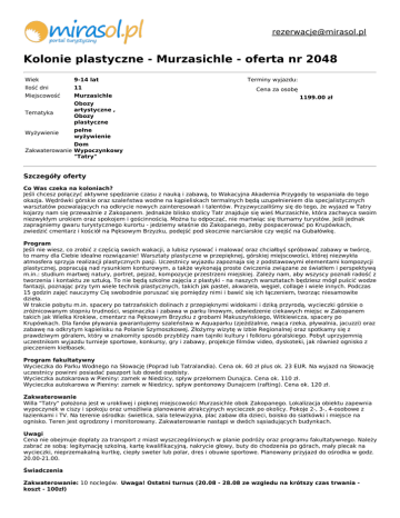 [email protected] Kolonie plastyczne - Murzasichle - oferta nr 2048 Wiek 9-14 lat Ilość dni 11 Miejscowość Murzasichle Tematyka Obozy artystyczne , Obozy plastyczne Wyżywienie pełne wyżywienie Terminy wyjazdu: Cena za osobę 1199.00 zł Dom Zakwaterowanie Wypoczynkowy "Tatry" Szczegóły oferty Co Was czeka na koloniach? Jeśli chcesz połączyć aktywne spędzanie czasu z nauką i zabawą, to Wakacyjna Akademia Przygody to wspaniała do tego okazja. Wędrówki górskie oraz szaleństwa wodne na kąpieliskach termalnych będą uzupełnieniem dla specjalistycznych warsztatów pozwalających na odkrycie nowych zainteresowań i talentów. Przyzwyczailiśmy się do tego, że wyjazd w Tatry kojarzy nam się przeważnie z Zakopanem. Jednakże blisko stolicy Tatr znajduje się wieś Murzasichle, która zachwyca swoim niezwykłym urokiem oraz spokojem i gościnnością. Można tu odpocząć, nie martwiąc się tłumamy turystów. Jeśli jednak zapragniemy gwaru turystycznego kurortu - jedziemy właśnie do Zakopanego, żeby pospacerować po Krupówkach, zwiedzić cmentarz i kościół na Pęksowym Brzyzku, podejść pod skocznie narciarskie czy wejść na Gubałówkę. Program Jeśli nie wiesz, co zrobić z częścią swoich wakacji, a lubisz rysować i malować oraz chciałbyś spróbować zabawy w twórcę, to mamy dla Ciebie idealne rozwiązanie! Warsztaty plastyczne w przepięknej, górskiej miejscowości, której niezwykła atmosfera sprzyja realizacji plastycznych pasji. Uczestnicy wyjazdu zapoznaja się z podstawowymi elementami kompozycji plastycznej, popracują nad rysunkiem konturowym, a także wykonają proste ćwiczenia związane ze światłem i perspektywą m.in.: studium martwej natury, portret, pejzaż, kompozycje przestrzeni miejskiej. Zależy nam, aby wszyscy poznali radość z tworzenia i kontaktu ze sztuką. To nie będą szkolne zajęcia z plastyki - na naszych warsztatach będziesz mógł puścić wodze fantazji, poznając przy tym wiele technik plastycznych, takich jak pastel, akwarela, węgiel, collage i wiele innych. Podczas 15 godzin zajęć nauczymy Cię swobodnie poruszać się pomiędzy nimi i bawić się ich łączeniem, tworząc niesamowite dzieła. W trakcie pobytu m.in. spacery po tatrzańskich dolinach z przepięknymi widokami i dziką przyrodą, wycieczki górskie o zróżnicowanym stopniu trudności, wspinaczka i zabawa w parku linowym, odwiedzenie ciekawych miejsc w Zakopanem takich jak Wielka Krokiew, cmentarz na Pęksowym Brzyzku z grobami Makuszyńskiego, Witkiewicza, spacery po Krupówkach. Dla fanów pływania gwarantujemy szaleństwa w Aquaparku (zjeżdżalnie, rwąca rzeka, pływalnia, jacuzzi) oraz zabawę na odkrytym kąpielisku na Polanie Szymoszkowej. Złożymy wizytę w Izbie Regionalnej oraz spotkamy się z prawdziwym góralem, który w znakomity sposób przybliży nam tajniki kultury i folkloru góralskiego. Pobyt uprzyjemnią uczestnikom wyjazdu turnieje sportowe, konkursy, gry i zabawy, projekcje filmów video, dyskoteki, jak również ognisko z pieczeniem kiełbasek. Program fakultatywny Wycieczka do Parku Wodnego na Słowację (Poprad lub Tatralandia). Cena ok. 60 zł plus ok. 23 EUR. Na wyjazd na Słowację uczestnicy powinni posiadać paszport lub dowód osobisty. Wycieczka autokarowa w Pieniny: zamek w Niedzicy, spływ przełomem Dunajca. Cena ok. 110 zł. Wycieczka autokarowa w Pieniny: zamek w Niedzicy, spływ pontonowy Dunajcem (rafting). Cena ok. 120 zł. Zakwaterowanie Willa "Tatry" położona jest w urokliwej i pięknej miejscowości Murzasichle obok Zakopanego. Lokalizacja obiektu zapewnia wypoczynek w ciszy i spokoju oraz umożliwia planowanie atrakcyjnych wycieczek po okolicy. Pokoje 2-, 3-, 4-osobowe z łazienkami i TV. Na terenie ośrodka: świetlica, sala telewizyjna, plac zabaw dla dzieci, boisko do siatkówki i miejsce na ognisko. Teren jest ogrodzony i monitorowany. Zakwaterowanie nastąpi w dwóch sąsiadujących budynkach. Uwagi Cena nie obejmuje dopłaty za transport z miast wyszczególnionych w planie podróży oraz programu fakultatywnego. Należy zabrać ze sobą: legitymację szkolną, kartę kwalifikacyjną, nakrycie głowy, buty do chodzenia po górach, mały plecak na wycieczki, nieprzemakalną kurtkę, ciepły sweter lub polar, dres i obuwie sportowe. Planowany przyjazd do ośrodka w godz. 20.00-21.00. Świadczenia Zakwaterowanie: 10 noclegów. Uwaga! Ostatni turnus (20.08 - 28.08 ze wzgledu na krótszy czas trwania koszt - 100zł) Wyżywienie: całodzienne (3 posiłki z napojami plus podwieczorek). Pierwszy posiłek: kolacja w dniu przyjazdu, ostatni posiłek: śniadanie w dniu wyjazdu oraz prowiant na drogę powrotną. W trakcie całodziennych wycieczek lunch pakiet. Transport: autokar turystyczny. Ubezpieczenie: Signal Iduna S.A. Opieka pedagogiczna. Opieka przewodnika na wycieczki górskie. Zajęcia sportowe i rekreacyjne. Bilety wstępu do zwiedzanych obiektów, na baseny, do parku linowego, gawęda góralska. Realizacja programu. UWAGA: Ceny promocyjne obowiązują do wyczerpania miejsc. Jak rezerwować Aby wstępnie zarezerwować wyjazd, Klient powinien: -podać w wyszukiwarce parametry obozu/kolonii, którymi jest zainteresowany (np. kraj, miasto, tematykę wyjazdu, wiek itp.) i kliknąć Wyszukaj oferty -po wyświetleniu wyników wyszukiwania przeczytać opisy wyjazdów, wybrać jeden z nich i kliknąć Przejdź do rezerwacji , gdzie znajduje się Formularz rezerwacyjny -wypełnić Formularz rezerwacyjny, w którym należy podać prawidłowe dane osobowe uczestników wyjazdu, niezbędne do dokonania rezerwacji -po wprowadzeniu danych zaakceptować Regulamin i Warunki uczestnictwa Organizatora imprezy turystycznej (znajdujące się przy opisie oferty) i kliknąć Wyślij Kolejne kroki: - po potwierdzeniu telefonicznym i mailowym przezKonsultanta mirasol.pl dostępności miejsc i otrzymaniu mailem Potwierdzenia rezerwacji, należy wpłacić wymaganą zaliczkę lub całą kwotę za wyjazd - w momencie