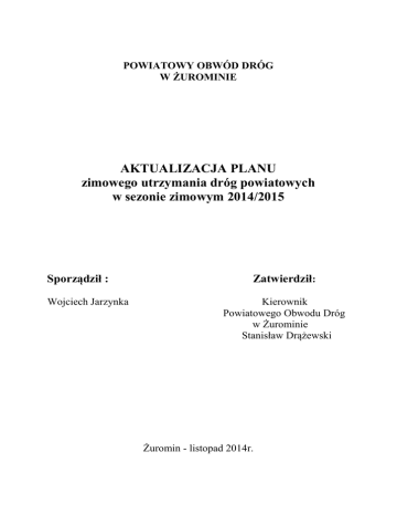 POWIATOWY OBWÓD DRÓG W ŻUROMINIE AKTUALIZACJA PLANU zimowego utrzymania dróg powiatowych w sezonie zimowym 2014/2015 Sporządził : Wojciech Jarzynka Zatwierdził: Kierownik Powiatowego Obwodu Dróg w Żurominie Stanisław Drążewski Żuromin - listopad 2014r. DYŻURY PRZY ZIMOWYM UTRZYMANIU DRÓG BĘDĄ PEŁNIONE W POWIATOWYM OBWODZIE DRÓG PRZY ULICY WARSZAWSKIEJ 32 Tel. /23/ - 657-23-19 WYKAZ OSÓB KIERUJĄCYCH AKCJĄ ZIMOWEGO UTRZYMANIA DRÓG POWIATOWYCH Lp. Nazwisko i imię Stanowisko służbowe Telefon służbowy Telefon komórkowy 1 2 3 4 1. Drążewski Stanisław Kierownik POD /23/ 657-23-19 502-482-552 2. Jarzynka Wojciech Kierownik Robót /23/ 657-23-19 606-389-075 3. Drążewski Tomasz Majster /23/ 657-23-19 604-509-327 4. Górka Jan Majster /23/ 657-23-19 604-530-837 5. Krzemiński Ryszard Kierowca-dróżnik /23/ 657-23-19 691-073-447 Żuromin – listopad 2014r. Osobą odpowiedzialną za zimowe utrzymanie dróg powiatowych z ramienia Wykonawcy jest: Przedsiębiorstwo Transportowo – Handlowe „WAPNOPOL” – Adam Nowakowski 06- 450 Glinojeck, ul. Nadrzeczna 14 Telefon kom. – 784 943 996 /Kortes Tadeusz/ 1.Wykonawca zgodnie z Umową nr 5/2014 z dnia 30.10.2014r. - szczegółowe warunki umowy pkt.13 ponosi pełną odpowiedzialność cywilną za szkody oraz następstwa nieszczęśliwych wypadków dotyczących pracowników i osób trzecich a powstałych w związku z prowadzonymi robotami, w tym także ruchem pojazdów mechanicznych. 2.Wykonawca zgodnie z Umową nr 5/2014 z dnia 30.10.2014r. – szczegółowe warunki umowy pkt.11 zapewnia możliwość kontaktu telefonicznego z operatorami sprzętu użytego w akcji zimowego utrzymania dróg. Informacja o zasadach odśnieżania i usuwania gołoledzi na drogach powiatowych: 1.Akcja przeciwśnieżna -wykaz dróg powiatowych objętych akcją zimowego utrzymania wg standardu 5 i 6 (załącznik nr 1). 2.Akcja przeciwgołoledziowa - wykaz miejsc niebezpiecznych na drogach powiatowych (załącznik nr 2). 3.Zasady odśnieżania i usuwania gołoledzi (załącznik nr 3). AKCJA PRZECIWŚNIEŻNA Załącznik nr 1 Wykaz dróg powiatowych objętych akcją zimowego utrzymania wg standardu 5 i 6 Drogi powiatowe pierwszej kolejności odśnieżania Gmina Żuromin Nr drogi Gmina Bieżuń Gmina Kuczbork km km km 4601W Nowa Wieś – Działdowo 4,725 4602W Przełęk – Kuczbork 8,666 4626W Chamsk – dr. Woj. Nr 541 1,504 4613W Brudnice – Kipichy 3,64 4620W Poniatowo – Lutocin 2,316 4632W Sadłowo – Zgliczyn 10,56 4640W Bieżuń – Szreńsk 9,558 4635W Sokołowy Kąt – Siemiątkowo 4,74 3014W Raciąż – Radzanów ul. Szpitalna – Żuromin 0,894 Razem: 8,354 24,858 13,391 Ogółem drogi pierwszej kolejności odśnieżania: 89,462 km Gmina Lutocin Gmina Lubowidz Gmina Siemiątkowo km km km 15,041 10,946 8,723 8,149 10,946 15,041 Uwagi 5 5 5 5 5 5 5 5 5 5 16,872 Drogi powiatowe drugiej kolejności odśnieżania 4607W Żuromin – Osówka 3,656 4608W Osówka – Straszewy 4627W Żuromin – Kuczbork 8,882 2335W Szreńsk – Kliczewo 2,423 4619W Chrapoń – Lutocin 4622W Lutocin – Zimolza 1,45 4634W Bieżuń – Drzazga 11,95 4638W Gradzanowo – Wolany 2994W Koziebrody – Pijawnia Razem: 14,961 13,4 Ogółem drogi drugiej kolejności odśnieżania : 59,102km 1,066 4,581 3,918 0,75 6,773 6,063 4,668 12,836 5,647 7,119 0,471 7,59 5 5 5 5 5 5 5 5 5 Drogi powiatowe trzeciej kolejności odśnieżania: 4603W Sarnowo – Zalesie 4604W Będzymin – Cieszki 4605W Zieluń – Chojnowo 4606W Zielona – Jabłonowo 4609W Osówka – Lubowidz 4610W Zieluń – Wronka – Dłutowo 4611W Zieluń – Wylazłowo 4612W Pątki – Suchy Grunt 4614W Brudnice – Lubowidz 4615W Pątki – Sinogóra 4616W Raczyny – Syberia 4617W Jasiony – Płociczno 4618W Pietrzyk – Dębówka 4621W Chromakowo – Lutocin 4623W Lutocin – Jonne 4624W Swojęcin – Obręb – Jonne-( do dr. Nr 541 4625W Poniatowo – Bieżuń 4628W Olszewo – Kosewo – Zielona 4629W Kuczbork – Nidzgora 4630W Olszewo – Ługi 4631W Wilewo – Glinki 4633W Karniszyn – Kobyla Łąka 4636W Zielona – Osówka 2358W Radzanów – Gradzanowo 2360W Drzazga – Siemiątkowo 4637W Siemiątkowo – Krzeczanowo 4639W Krzeczanowo – Kodłutowo 3013W Koszczywiec – Jaworowo Razem: 1,975 2,6 6,124 7,62 0,39 3,25 1,95 6,237 7,068 5,706 1,726 4,874 5 5 5 6 5 5 5 5 5 5 6 5 5 5 5 1,238 3,284 4,975 3,528 6,357 7,015 4,395 5,175 2,845 6,212 7,702 2,637 5,124 0,57 3,65 9,090 2,774 3,512 2,66 21,930 11,41 22,599 Ogółem drogi trzeciej kolejności odśnieżania: 157, 578 km Razem drogi I, II, III kolejności zimowego utrzymania dróg : 306, 142 km Drogi nie objęte zimowym utrzymaniem dróg: 19,749 km Ogółem drogi powiatowe: 325,891km 1,268 31,3 46,292 0,578 6,092 5,511 2,935 8,931 24,047 5 5 6 6 5 6 6 5 5 5 5 5 5 1550 700 250 150 150 100 100 100 100 600 200 1100 150 100 100 150 500 300 100 150 100 200 100 100 450 1500 100 250 150 100 100 650 100 100 150 200 250 200 150 100 200 100 200 200 100 200 700 AKCJA PRZECIWGOŁOLEDZIOWA Załącznik nr 2 4632W Sadłowo – Sławęcin- Zgliczyn, gm. Bieżuń- standard 5 0+000 0+100 skrzyżowanie z drogą woj. nr 541 1+200 1+300 przystanek PKS 3+000 3+150 skrzyżowanie 4+100 4+300 łuk poziomy 5+000 5+250 łuki poziome, skrzyżowanie, przystanek PKS 6+050 6+250 przystanek PKS, skrzyż. z dr. pow. nr 4631W 6+500 6+650 łuk poziomy 7+750 7+850 skrzyż. z drogą gminną Gołuszyn – Sławęcin 8+150 8+350 łuk poziomy 10+460 10+560 skrzyżowanie z dr.pow. nr 4634 W 4634W Bieżuń- Kocewo- Zgliczyn, gm. Bieżuń – standard 5 0+000 0+100 skrzyż. z dr. woj. nr 541 , spadek podłużny 3+050 3+300 łuki poziome, skrzyżowanie 7+200 7+350 łuki poziome , most 8+200 8+300 przystanek PKS, skrzyżowanie 11+850 11+950 skrzyżowanie z dr. pow. nr 4632 W 4637W Siemiątkowo- Krzeczanowo, gm. Siemiątkowo- standard 5 0+000 0+250 skrzyżowanie , łuki poziome 2+000 2+150 łuk poziomy 3+807 3+975 odcinek drogi w nasypie, łuk poziomy 5+411 5+511 skrzyżowanie z drog