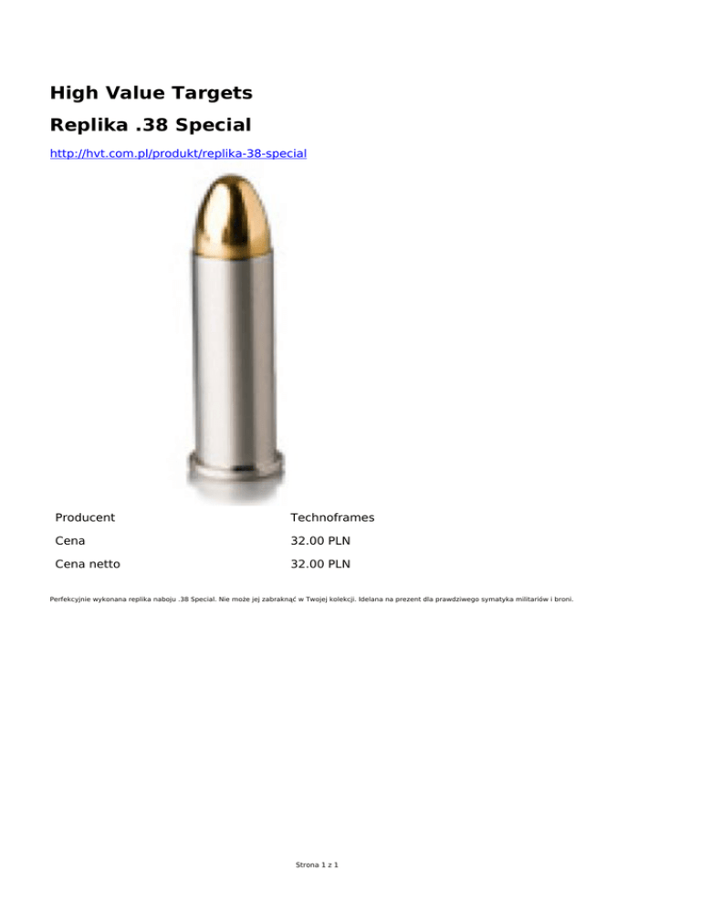 High Value Targets Replika .38 Special http://hvt.com.pl/produkt/replika-38-special Producent Technoframes Cena 32.00 PLN Cena netto 32.00 PLN Perfekcyjnie wykonana replika naboju .38 Special. Nie może jej zabraknąć w Twojej kolekcji. Idelana na prezent dla prawdziwego symatyka militariów i broni. Strona 1 z 1