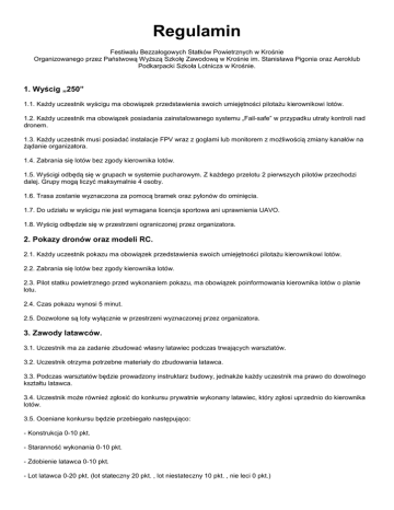 Regulamin Festiwalu Bezzałogowych Statków Powietrznych w Krośnie Organizowanego przez Państwową Wyższą Szkołę Zawodową w Krośnie im. Stanisława Pigonia oraz Aeroklub Podkarpacki Szkoła Lotnicza w Krośnie. 1. Wyścig „250” 1.1. Każdy uczestnik wyścigu ma obowiązek przedstawienia swoich umiejętności pilotażu kierownikowi lotów. 1.2. Każdy uczestnik ma obowiązek posiadania zainstalowanego systemu „Fail-safe” w przypadku utraty kontroli nad dronem. 1.3. Każdy uczestnik musi posiadać instalacje FPV wraz z goglami lub monitorem z możliwością zmiany kanałów na żądanie organizatora. 1.4. Zabrania się lotów bez zgody kierownika lotów. 1.5. Wyścigi odbędą się w grupach w systemie pucharowym. Z każdego przelotu 2 pierwszych pilotów przechodzi dalej. Grupy mogą liczyć maksymalnie 4 osoby. 1.6. Trasa zostanie wyznaczona za pomocą bramek oraz pylonów do ominięcia. 1.7. Do udziału w wyścigu nie jest wymagana licencja sportowa ani uprawnienia UAVO. 1.8. Wyścig odbędzie się w przestrzeni ograniczonej przez organizatora. 2. Pokazy dronów oraz modeli RC. 2.1. Każdy uczestnik pokazu ma obowiązek przedstawienia swoich umiejętności pilotażu kierownikowi lotów. 2.2. Zabrania się lotów bez zgody kierownika lotów. 2.3. Pilot statku powietrznego przed wykonaniem pokazu, ma obowiązek poinformowania kierownika lotów o planie lotu. 2.4. Czas pokazu wynosi 5 minut. 2.5. Dozwolone są loty wyłącznie w przestrzeni wyznaczonej przez organizatora. 3. Zawody latawców. 3.1. Uczestnik ma za zadanie zbudować własny latawiec podczas trwających warsztatów. 3.2. Uczestnik otrzyma potrzebne materiały do zbudowania latawca. 3.3. Podczas warsztatów będzie prowadzony instruktarz budowy, jednakże każdy uczestnik ma prawo do dowolnego kształtu latawca. 3.4. Uczestnik może również zgłosić do konkursu prywatnie wykonany latawiec, który zgłosi uprzednio do kierownika lotów. 3.5. Oceniane konkursu będzie przebiegało następująco: - Konstrukcja 0-10 pkt. - Staranność wykonania 0-10 pkt. - Zdobienie latawca 0-10 pkt. - Lot latawca 0-20 pkt. (lot stateczny 20 pkt. , lot niestateczny 10 pkt. , nie leci 0 pkt.)