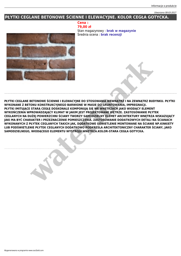 Informacje o produkcie Utworzono 08-03-2017 PŁYTKI CEGLANE BETONOWE ŚCIENNE I ELEWACYJNE. KOLOR CEGŁA GOTYCKA. Cena : 79,00 zł er m ar k Stan magazynowy : brak w magazynie Średnia ocena : brak recenzji w at PŁYTKI CEGLANE BETONOWE ŚCIENNE I ELEWACYJNE DO STOSOWANIA WEWNĄTRZ I NA ZEWNĄTRZ BUDYNKU. PŁYTKI WYKONANE Z BETONU KONSTRUKCYJNEGO BARWIONE W MASIE DO GRUNTOWANIA, IMPREGNACJI. PŁYTKI IMITUJĄCE STARĄ CEGŁĘ DOSKONALE KOMPONUJĄ SIĘ WE WNĘTRZACH JAKO WIODĄCY ELEMENT WYKOŃCZENIA WPROWADZAJĄCY KLIMAT W JAKIM JEST PROJEKTOWANE WĘTRZE. ZASTOSOWANIE PŁYTEK CEGLANYCH NA DUŻEJ POWIERZCHNI ŚCIANY TWORZY SAMODZIELNY ELEMET ARCHITEKTURY WNĘTRZA WSKAZUJĄCY JAKI MA BYĆ CHARAKTER I PRZEZNACZENIE POMIESZCZENIA. ZASTOSOWANIE DODATKOWYCH DETALI NA ŚCIANACH WYKONANYCH Z PŁYTEK CEGLANYCH TAKICH JAK, DODATKOWE OŚWIETLENIE MONTOWANE NA ŚCIANIE NP.KINKIETY LUB PODŚWIETLENIE PŁYTEK CEGLANYCH DODATKOWO PODKREŚLA ARCHITEKTONICZNY CHARAKTER ŚCIANY, JAKO SAMODZIELNEGO, WIODĄCEGO ELEMENTU WYSTROJU WNĘTRZA.KOLOR-STARA CEGŁA GOTYCKA. Wygenerowano w programie www.oscGold.com