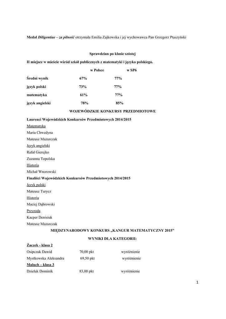 Medal Diligentiae – za pilność otrzymała Emilia Zajkowska i jej wychowawca Pan Grzegorz Ptaszyński Sprawdzian po klasie szóstej II miejsce w mieście wśród szkół publicznych z matematyki i języka polskiego. w Polsce w SP6 Średni wynik 67% 77% język polski 73% 77% matematyka 61% 77% język angielski 78% 85% WOJEWÓDZKIE KONKURSY PRZEDMIOTOWE Laureaci Wojewódzkich Konkursów Przedmiotowych 2014/2015 Matematyka Maria Chwedyna Mateusz Mazurczak Język angielski Rafał Gierejko Zuzanna Topolska Historia Michał Wnorowski Finaliści Wojewódzkich Konkursów Przedmiotowych 2014/2015 Język polski Mateusz Turycz Historia Maciej Dąbrowski Przyroda Kacper Denisiuk Mateusz Mazurczak MIĘDZYNARODOWY KONKURS „KANGUR MATEMATYCZNY 2015” WYNIKI DLA KATEGORII: Żaczek klasa 2 Osipczuk Dawid 70,00 pkt wyróżnienie Mystkowska Aleksandra 69,50 pkt wyróżnienie Maluch – klasa 3 Dziełak Dominik 83,00 pkt wyróżnienie 1 Maluch – klasa 4 Chorębiewska Magdalena 96,25 pkt wyróżnienie Kondracki Jerzy 88,75 pkt wyróżnienie Baranowski Hubert 87,50 pkt wyróżnienie Prokopczuk Alicja 84,75 pkt wyróżnienie Beniamin – klasa 5 Jankowski Mateusz 117,25 pkt wyróżnienie Błaszczak Emilia 93,25 pkt wyróżnienie Matys Zofia 89,75 pkt wyróżnienie Kozłowska Anna 87,75 pkt wyróżnienie Bobrykow Zuzanna 83,50 pkt wyróżnienie Beniamin – klasa 6 Chwedyna Maria 118,75 pkt wyróżnienie Mazurczak Mateusz 117,50 pkt wyróżnienie OGÓLNOPOLSKI KONKURS "ZŁO DOBREM ZWYCIĘŻAJ" Tytuł LAUREATA zdobyła Gabriela Stalończyk kl. V Wyróżnienia KATARZYNA TURSKA z kl. V c oraz ANNA OLCHOWIK z kl. Vb SZKOLNY KONKURS RELIGIJNY „NAJPIĘKNIEJSZA SZOPKA BETLEJEMSKA ” Zwycięzcami konkursu w kategorii klas IIII zostali: Miejsca I: Aleksandra Gil, kl. II b; Matylda Chorębiewska wraz z siostrą, kl. I c Miejsca II: Emma Kraśnicka, kl. I b; Weronika Sakowicz, kl. III b Miejsca III: Magdalena Grochowska, kl. I a; Szymon Kamiński, kl. II a Wyróżnienie: Aleksandra Kołnierowicz , kl. II b Zwycięzcami konkursu w kategorii klas IVVI zostali: Miejsca I: Wiktoria Rutkowska, kl. IV a; Grupa: Gabriela Zalewska, Zuzanna Bobrykow, Anna Olchowik, kl. V b: Magdalena Chorębiewska, kl. IV b Miejsca II: Gabriela Stalończyk, kl. V d; Julia Wojtkowska VI b; Julia Niczyporuk (z rodziną) kl. V b Miejsca III: Emilia Błaszczak (z rodziną) kl. V b; Alicja Choszczyk oraz Anna Kozłowska (z Tatą) kl. V d Wyróżnienia: Amelia Rogowska kl. V a; Wiktoria Zdunik kl. V c KONKURS PRZYRODNICZY PANDA Alicja Prokopczuk klasa IVB – LAUREAT 3 miejsce w Polsce Wyróżnienie otrzymali: 2 Michał Tałałaj klasa IVC – 7 miejsce w Polsce Jerzy Kondracki klasa IVC – 7 miejsce w Polsce Maja Dąbrowska klasa IVA – 9 miejsce w Polsce Marcin Daniluk klasa IVA– 9 miejsce w Polsce Dominika Wróbel klasa IVB– 9 miejsce w Polsce Marcelina Koniakowska klasa IVA– 9 miejsce w Polsce Filip Dąbrowski klasa IVA – 10 miejsce w Polsce Emilia Błaszczak klasa VB – 7 miejsce w Polsce Mateusz Jankowski klasa VB– 9 miejsce w Polsce Zuzanna Bagińska klasa VB– 9 miejsce w Polsce Alicja Choszczyk klasa VD– 10 miejsce w Polsce Maciej Dąbrowski klasa VIA – 8 miejsce w Polsce OGÓLNOPOLSKI KONKURS PANDA 2015 Z HISTORII 14 miejsce w Polsce – Jerzy Kondracki kl. IV c 15 miejsce w Polsce – Małgorzata Kalisz kl. IV a 19 miejsce w Polsce – Marcelina Kociakowska kl. IV a 28 miejsce w Polsce – Wiktoria Piktel kl. IV c Karol Cwalina kl. V d 29 miejsce w Polsce – Szymon Domagała kl. V b 32 miejsce w Polsce – Aleksandra Prochoruk kl. V a Hubert Dziełak kl. V a 34 miejsce w Polsce Julia Niczyporuk V b 41 miejsce w Polsce – Mikołaj Szpica V d OGÓLNOPOLSKI KONKURS PRZEDMIOTOWY PANDA Z JĘZYKA ANGIELSKIEGO Oto najlepsze wyniki: Język angielski POZIOM 1 1. miejsce w Polsce – Marcin Daniluk kl. IV A 5. miejsce w Polsce ex aequo – Karol Cwalina kl. V D Julia Drabikowska kl. V B 7. miejsce w Polsce eex aequo – Emilia Błaszczak kl. V B Damian Matan kl. V C 8. miejsce w Polsce ex aequo – Martyna Gmińska kl. V A 3 Zofia Matys kl. V C Krzysztof Szachowicz kl. V C 9. miejsce w Polsce ex aequo – Anna Kozłowska kl. V D Wiktoria Nikołajuk kl. V C 10. miejsce w Polsce – Amelia Ćwikowska kl. V C 11. miejsce w Polsce ex aequo – Jonasz Austin Hannibal kl. IV B Szymon Domagała kl. V B 13. miejsce w Polsce ex aequo – Gabriela Carvalhido kl. V B Marianna Kasperuk kl. V C Maksymilian Proskień kl. V C Kornelia Szamańska kl. V B 14. miejsce w Polsce – Daria Kuczyńska kl. V C 15. miejsce w Polsce ex aequo – Alicja Choszczyk kl. V D Julia Kolenda kl. V A Aleksandra Rozumko kl. V D 16. miejsce w Polsce – Małgorzata Kalisz kl. V A 17. miejsce w Polsce ex aequo – Cyprian Prus kl. V C Marcel Sztachelski kl. V C 18. miejsce w Polsce – Laura Pokało kl. V D 19. miejsce w Polsce ex aequo – Magdalena Chorębiewska kl. IV B Mateusz Czarnecki kl. IV C Jagoda Jarocka kl. IV 20. miejsce w Polsce ex aequo – Hubert Dziełak kl. V A Wiktor Grabowski kl. V D 21. miejsce w Polsce ex aequo – Wiktoria Łazewska kl. V A Katarzyna Turska kl. V C Julia Wnorowska kl. IV B 23. miejsce w Polsce ex aequo – Klaudia Jałosińska kl. V C Joanna Kuźmicka kl. IV B Damian Zalewski kl. IV C 4 24. miejsce w Polsce ex aequo – Michał Tałałaj kl. IV C Julia Weremiejewicz kl. V B 25. miejsce w Polsce ex aequo – Marcelina Kociakowska kl. IV A Julia Urban kl. V B 29. miejsce w Polsce – Bartosz Pastwa kl. IV C 31. miejsce w Polsce ex aequo – Kinga Chilimoniuk kl. IV A Fabian Tarasiuk kl. IV C 33. miejsce w Polsce – Wiktoria Piktel kl. IV C 36. miejsce w Polsce – Sara Szumska kl. IV A Język angielski POZIOM 2 9. miejsce w Polsce – Kacper Denisiuk kl. VI B 13. miejsce w Polsce – Zuzanna Topolska kl. VI B 15. miejsce w Polsce – Rafał Gierejko kl. VI A 21. miejsce w Polsce – Mateusz Mazurczak kl. VI B 23. miejsce w Polsce ex aequo – Aleksandra Grochowska kl. VI B Natalia Jastrzębska kl. VI B Olga Truszkowska k
