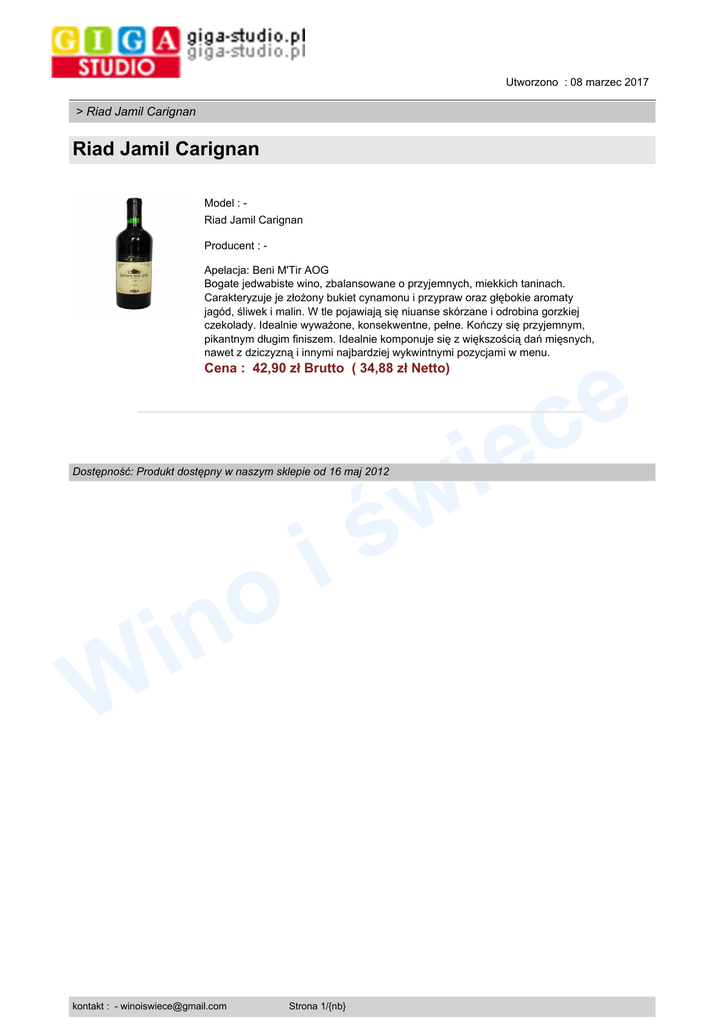 Utworzono : 08 marzec 2017 > Riad Jamil Carignan Riad Jamil Carignan Model : Riad Jamil Carignan Producent : Apelacja: Beni M'Tir AOG Bogate jedwabiste wino, zbalansowane o przyjemnych, miekkich taninach. Carakteryzuje je złożony bukiet cynamonu i przypraw oraz głębokie aromaty jagód, śliwek i malin. W tle pojawiają się niuanse skórzane i odrobina gorzkiej czekolady. Idealnie wyważone, konsekwentne, pełne. Kończy się przyjemnym, pikantnym długim finiszem. Idealnie komponuje się z większością dań mięsnych, nawet z dziczyzną i innymi najbardziej wykwintnymi pozycjami w menu. e c Cena : 42,90 zł Brutto ( 34,88 zł Netto) e i w ś Dostępność: Produkt dostępny w naszym sklepie od 16 maj 2012 W i o in kontakt : - [email protected] Strona 1/{nb}