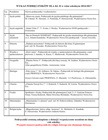 WYKAZ PODRĘCZNIKÓW DLA Kl. II w roku szkolnym 2016/2017 Lp. Przedmiot Nazwa podręcznika i wydawnictwo 1 Język polski „Słowa na czasie. Podręcznik do języka polskiego dla gimnazjum”. M. Chmiel, W. Herman, Z. Pomirska, P. Doroszewski. Wydawnictwo Nowa Era. 2 Język angielski ,,Smart Time 2”. V. Evans, J. Dooley. Wydawnictwo EGIS (podręcznik + ćwiczenia). 3 Język niemiecki Das ist Deutsch! KOMPAKT. Podręcznik do języka niemieckiego dla gimnazjum cz.2. Jolanta Kamińska. Wydawnictwo Nowa Era (podręcznik + zeszyt ćwiczeń). 4 Historia „Śladami przeszłości” Podręcznik do historii dla klasy II gimnazjum pod red. St. Roszaka. Wydawnictwo Nowa Era. 5 Wiedza o społeczeństwie „Dziś i jutro”. Podręcznik do wiedzy o społeczeństwie dla gimnazjum, część pierwsza. I. Janicka, A. Kucia, T. Maćkowski. Wydawnictwo Nowa Era. 6 Geografia „Planeta Nowa 3”. Podręcznik dla klasy trzeciej. M. Szubert. Wydawnictwo Nowa Era. Atlas geograficzny Polska , kontynenty, świat. 7 Biologia „Puls życia 1”. M. Jefimow, M. Sęktas ; Podręcznik do biologii dla gimnazjum część PIERWSZA. Wydawnictwo Nowa Era. Zeszyt ćwiczeń część PIERWSZA. E. Mazurek, J.J. Pawłowscy, A. Zdziennicka. 8 Chemia „Chemia Nowej Ery 1”. J. Kulawik, T. Kulawik, M. Litwin. Wydawnictwo Nowa Era. 9 Fizyka Spotkania z fizyką. Podręcznik dla gimnazjum.Część 2 i 3. Grażyna Francuz Ornat, Teresa Kulawik, Maria Nowotny-Różańska. Wydawnictwo Nowa Era. 10 Matematyka „Matematyka 2 z plusem” pod red. M. Dobrowolskiej. Gdańskie Wydawnictwo Oświatowe. 11 Religia/etyka „Błogosławieni, którzy ufają Jezusowi”. K. Mielnicki, E. Kondrak, E. Parszewska. Wydawnictwo Jedność Kielce. Podręczniki zostaną zakupione z dotacji i wypożyczone uczniom na dany rok szkolny. Wyjątek stanowi podręcznik do religii, którego nie obejmuje dotacja.