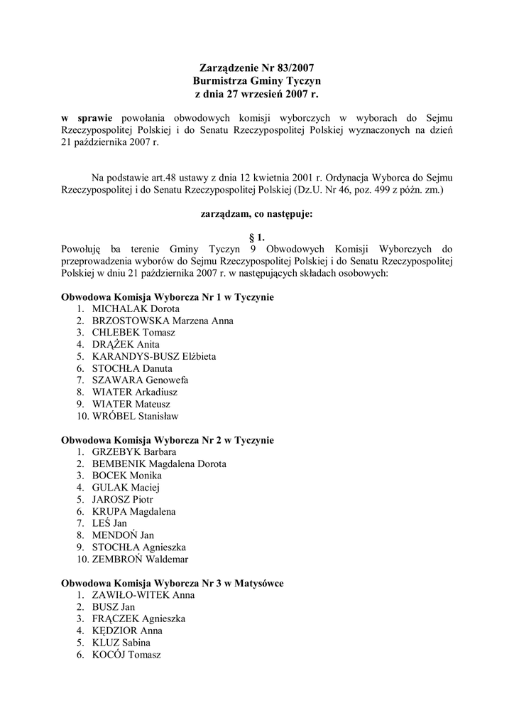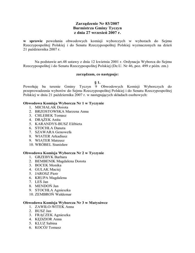 Zarządzenie Nr 83/2007 Burmistrza Gminy Tyczyn z dnia 27 wrzesień 2007 r. w sprawie powołania obwodowych komisji wyborczych w wyborach do Sejmu Rzeczypospolitej Polskiej i do Senatu Rzeczypospolitej Polskiej wyznaczonych na dzień 21 października 2007 r. Na podstawie art.48 ustawy z dnia 12 kwietnia 2001 r. Ordynacja Wyborca do Sejmu Rzeczypospolitej i do Senatu Rzeczypospolitej Polskiej (Dz.U. Nr 46, poz. 499 z późn. zm.) zarządzam, co następuje: § 1. Powołuję ba terenie Gminy Tyczyn 9 Obwodowych Komisji Wyborczych do przeprowadzenia wyborów do Sejmu Rzeczypospolitej Polskiej i do Senatu Rzeczypospolitej Polskiej w dniu 21 października 2007 r. w następujących składach osobowych: Obwodowa Komisja Wyborcza Nr 1 w Tyczynie 1. MICHALAK Dorota 2. BRZOSTOWSKA Marzena Anna 3. CHLEBEK Tomasz 4. DRĄśEK Anita 5. KARANDYS-BUSZ ElŜbieta 6. STOCHŁA Danuta 7. SZAWARA Genowefa 8. WIATER Arkadiusz 9. WIATER Mateusz 10. WRÓBEL Stanisław Obwodowa Komisja Wyborcza Nr 2 w Tyczynie 1. GRZEBYK Barbara 2. BEMBENIK Magdalena Dorota 3. BOCEK Monika 4. GULAK Maciej 5. JAROSZ Piotr 6. KRUPA Magdalena 7. LEŚ Jan 8. MENDOŃ Jan 9. STOCHŁA Agnieszka 10. ZEMBROŃ Waldemar Obwodowa Komisja Wyborcza Nr 3 w Matysówce 1. ZAWIŁO-WITEK Anna 2. BUSZ Jan 3. FRĄCZEK Agnieszka 4. KĘDZIOR Anna 5. KLUZ Sabina 6. KOCÓJ Tomasz 7. MATUŁA Natalia 8. TERCZYŃSKI Michał 9. ZŁAMANIEC Wojciech Obwodowa Komisja Wyborcza Nr 4 w Kielnarowej 1. KLIMASZ Renata 2. BRZOSTOWSKA Maria 3. CZEKAJ Marta - LID 4. DYKIEL Ewa 5. GRYS Dorota 6. KUŚNIERZ Tomasz 7. MACKIEWICZ Marta 8. MACKIEWICZ Sebastian 9. OSIADŁY Paweł 10. TRZYNA Renata Obwodowa Komisja Wyborcza Nr 5 w Borku Starym 1. JASIŃSKA Anna 2. BOROWIEC Adam 3. CZEKAJ Wiesław 4. JASIŃSKA Justyna 5. OPIOŁA Tadeusz 6. PĘKALA Jadwiga 7. STRUCK Barbara 8. ŚLUSARSKA Katarzyna 9. ZIAJA Katarzyna 10. ZMARZŁY Urszula Obwodowa Komisja Wyborcza Nr 6 w Hermanowej 1. KOTULA Barbara 2. HAŁOŃ Lucyna 3. JANDA Jerzy 4. KAPLITA Jadwiga 5. KNUTEL ElŜbieta Agnieszka 6. KNUTEL Krystyna 7. SZAWARA Andrzej 8. TENDELSKI Mateusz 9. WIATER Jadwiga 10. ZĄBEK Dorota Obwodowa Komisja Wyborcza Nr 7 w Budziwoju 1. ZIEMBA-KOZIMOR Magdalena 2. JANDA Małgorzata 3. KOTULA Ewa 4. LASSOTA Grzegorz 5. MAJCHER Arleta - LID 6. MYRDA Marek 7. SZAWARA Sebastian 8. ŚLĄCZKA Marzena 9. WYSOCKA Anna Obwodowa Komisja Wyborca Nr 8 w Budziwoju 1. MADERA Bogumiła 2. BOROWIEC Małgorzata 3. DZIOB Jadwiga Agata 4. JANDA Dorota 5. KONKOL Robert - PiS 6. MAJCHER Zofia 7. MICHALSKA Małgorzata 8. TRAFIDŁO Agnieszka 9. WIŚNIEWSKI Grzegorz Obwodowa Komisja Wyborcza Nr 9 w Białej 1. KOCÓJ GraŜyna 2. CYGAN Małgorzata 3. MAJCHER-SKIBA Marzena - LID 4. MALINOWSKA Agnieszka 5. OPIOŁA Marta 6. PITERA Jan 7. SOWA Arkadiusz 8. ZĄBEK Grzegorz 9. ZEMBROŃ Anna § 2. Zarządzenie wchodzi w Ŝycie z dniem podjęcia.