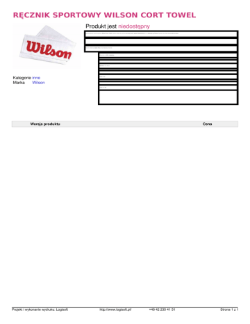 RĘCZNIK SPORTOWY WILSON CORT TOWEL Produkt jest niedostępny Wysokiej jakości ręcznik sportowy Wilson Court Towel. Idealnie nadaje się zarówno na korty (tenis, squash, badminton) jak i na siłownię czy fitness. Sprawdzi się rówież na co dzień w domu. Ręcznik zdobiony nazwą firmy w kontrastowym kolorze. Wykonany w 100% z bawełny. Rozmiar: 75 x 50 cm Kategorie inne Marka Wilson Kolor: biały Cena za 1 szt. Wersja produktu Projekt i wykonanie wydruku: Logisoft Powered by TCPDF (www.tcpdf.org) Cena http://www.logisoft.pl/ +48 42 235 41 51 Strona 1 z 1