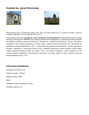 Kościół św. Jana Chrzciciela Pilica położona jest w malowniczej dolinie rzeki, która ma swoje źródła 2 km na zachód od miasta, otoczona jurajskimi wzgórzami, leży na wysokości 350 m n.p.m. Data powstania obecnego kościoła św. Jana Chrzciciela i Jana Ewangelisty nie jest dokładnie znana, budowę datuje się orientacyjnie na XIV wiek. Przez lata był wielokrotnie przebudowywany. Z pierwotnej budowli zachowało się sklepione krzyżowo gotyckie prezbiterium, oskarpowane i oświetlone ostrołukowym oknem. Od północy przylega do niego zakrystia, ozdobiona z zewnątrz attyką i herbami dawnych właścicieli Pilicy. Od południa do prezbiterium przylega dobudowana w 1601 r. renesansowa kaplica grobowa Padniewskich z późnorenesansowym portalem i nagrobkiem z czerwonego marmuru Anny i Mikołaja Padniewskich (dzieło włoskiego artysty Kaspra Fodige). Sąsiednia barokowa kaplica św. Józefa z 1700 r. jest dziełem architektury i sztuki; znajduje się w niej ciekawe sklepienie kolebkowe i późnobarokowa polichromia. W pobliżu wejścia do nawy znajduje się jeszcze kaplica Świętego Krzyża z 1701 r. Informacje dodatkowe Wymagane zezwolenie: Tak Natężenie światła: Średnie Natężenie hałasu: Małe Media Odległość od bazy produkcyjnej: do 5km Możliwość dojazdu: Tak Powered by TCPDF (www.tcpdf.org)