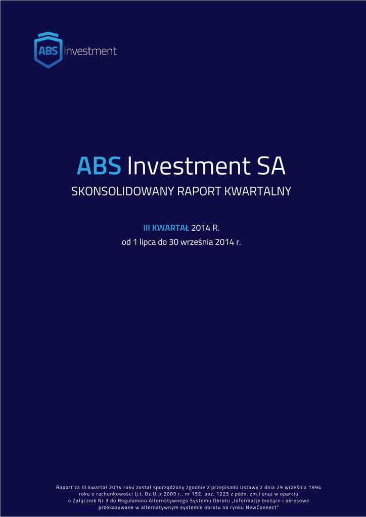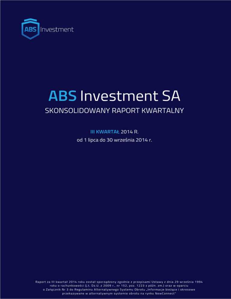 ABS Investment SA SKONSOLIDOWANY RAPORT KWARTALNY III KWARTAŁ 2014 R. od 1 lipca do 30 września 2014 r. Raport za III kwartał 2014 roku został spor ządzon y zgodnie z pr zepisami Ustawy z dnia 29 września 1994 ABS INVESTMENT SA / Skonsolidowany raport za III kwartał 2014 roku roku o rachunk owoś ci (j.t. D z.U. z 2009 r., nr 152, poz. 1223 z późn . zm.) oraz w oparciu o Załącznik Nr 3 do Regulami nu Alternatywnego S ystemu Obrotu „In formacje bieżące i okres owe przeka zywane w alternatywn ym systemie ob rotu na rynku NewConne ct" 1 Spis treści I. WSTĘP / PODSUMOWANIE KWARTAŁU.......................................................................................................... 4 II. PODSTAWOWE INFORMACJE O EMITENCIE.................................................................................................. 6 III. AKCJONARIAT......................................................................................................................................................... 7 IV. WSKAZANIE JEDNOSTEK WCHODZĄCYCH W SKŁAD GRUPY KAPITAŁOWEJ EMITENTA NA OSTATNI DZIEŃ OKRESU OBJĘTEGO RAPORTEM KWARTALNYM .............................................................. 8 BESKIDZKIE BIURO CONSULTINGOWE SA ..................................................................................................... 9 V. OŚWIADCZENIE ZARZĄDU................................................................................................................................ 10 VI. SKRÓCONE SPRAWOZDANIE FINANSOWE ZAWIERAJĄCE BILANS, RACHUNEK ZYSKÓW I STRAT, ZESTAWIENIE ZMIAN W KAPITALE WŁASNYM ORAZ RACHUNEK PRZEPŁYWÓW PIENIĘŻNYCH . 11 EMITENT ................................................................................................................................................................ 11 GRUPA KAPITAŁOWA ......................................................................................................................................... 14 VII. ZWIĘZŁA CHARAKTERYSTYKA ISTOTNYCH DOKONAŃ LUB NIEPOWODZEŃ, WRAZ Z OPISEM NAJWAŻNIEJSZYCH CZYNNIKÓW I ZDARZEŃ, MAJĄCYCH WPŁYW NA OSIĄGNIĘTE WYNIKI ........... 18 EMITENT ................................................................................................................................................................ 18 GRUPA KAPITAŁOWA ......................................................................................................................................... 22 VIII. SKŁAD PORTFELA INWESTYCYJNEGO ....................................................................................................... 27 EMITENT ................................................................................................................................................................ 27 GRUPA KAPITAŁOWA ......................................................................................................................................... 28 IX. AKTYWNOŚĆ W OBSZARZE RAPORTOWANIA .......................................................................................... 29 X. PŁYNNOŚĆ AKCJI.................................................................................................................................................. 31 XI. PROGNOZY FINANSOWE ................................................................................................................................. 32 XII. INFORMACJE NA TEMAT AKTYWNOŚCI W OBSZARZE ROZWIĄZAŃ INNOWACYJNYCH WPROWADZONYCH W PRZEDSIĘBIORSTWIE ................................................................................................ 32 XIII. INFORMACJE DOTYCZĄCE LICZBY OSÓB ZATRUDNIONYCH PRZEZ EMITENTA, W PRZELICZENIU NA PEŁNE ETATY ........................................................................................................................ 32 ABS INVESTMENT SA / Skonsolidowany raport za III kwartał 2014 roku 2 XIV. INFORMACJE O ZASADACH PRZYJĘTYCH PRZY SPORZĄDZANIU RAPORTU, W TYM INFORMACJE O ZMIANACH STOSOWANYCH ZASAD (POLITYKI) RACHUNKOWOŚCI .......................... 33 EMITENT ................................................................................................................................................................ 33 GRUPA KAPITAŁOWA ......................................................................................................................................... 39 XV. DANE KONTAKTOWE ....................................................................................................................................... 46 ABS INVESTMENT SA / Skonsolidowany raport za III kwartał 2014 roku 3 I. WSTĘP / PODSUMOWANIE KWARTAŁU Szanowni Państwo! Przedstawiamy skonsolidowany raport okresowy z działalności naszej Spółki oraz Grupy Kapitałowej w trzecim kwartale 2014 roku. Po raz kolejny zakończyliśmy kwartał stratą netto. Jest to spowodowane spadkiem wartości akcji spółki zależnej oraz drastyczną przeceną, do niedawna najbardziej wartościowej, spółki portfelowej - Uboat-Line SA. Warto zaznaczyć, że różnica kursowa tej ostatniej wyniosła w zestawieniu z poprzednim kwartałem aż -84%, co w ujęciu kwotowym pakietu posiadanego przez grupę kapitałową przełożyło się na stratę przekraczającą 2 000 000,00 zł. Na przestrzeni III oraz IV kwartału podjęliśmy działania w celu ochrony naszej inwestycji, oczekując rzetelnych informacji na temat sytuacji finansowej tej spółki. Szereg pytań został Zarządowi zaprezentowany podczas Nadzwyczajnego Walnego Zgromadzenia, które odbyło się 4 listopada 2014 roku. Obecnie oczekujemy na udzielenie odpowiedzi. ABS INVESTMENT SA / Skonsolidowany raport za III kwartał 2014 roku 4 Około 46% spółek z portfela wzrosła w III kwartale w porównaniu do poprzedniego. Na szczególną uwagę zasługują Orion Investment SA o ponad 37%, Leasing-Experts SA o 17,78%, VERBICOM SA o 10,40%. Jednocześnie chcielibyśmy się