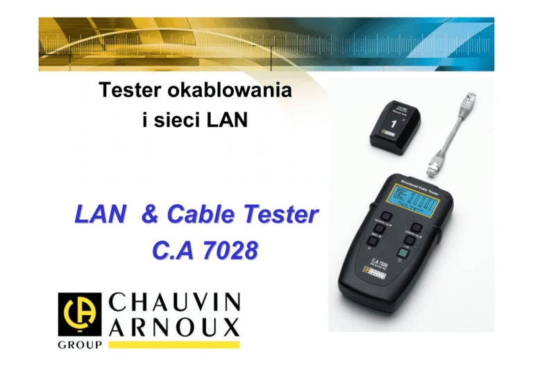 Tester okablowania i sieci LAN LAN & Cable Tester C.A 7028 Wire Mapper Pro® CA 7028 Tester sieci strukturalnych (LAN Data and Voice network) Wire Mapper Pro CA 7028 1 - RJ45 złącze wejściowe 2 - Wyświetlacz LCD 3 - «VP Zmniejszanie / Test działania » 4 - Wybór «Test konfiguracji przewodów/Funkcje » 5 – Włączenie podświetlania 6 - « VP Zwiększanie / Test długości przewodu » 7 – Generator częstotliwości dźwiękowych 8 – Włącznik 9 - Moduł rozpoznawania odległości Włączenie Wire Mapper Pro CA 7028 CHAUVIN ARNOUX @ Konfiguracja Wire Mapper Pro CA 7028 Wybór / modyfikacja parametrów 3 Wybór jednej z wartości 2 2nd 1 Równoczesne wciśnięcie A @ 4 Potwierdzenie 1st Pomiary Wire Mapper Pro CA 7028 Podłączyć Urządzenie zdalne «(remote unit) » na drugim końcu przewodu MAP A 1 naciśnięcie = 1 pomiar Identyfikacja aktywnego portu danych Wire Mapper Pro CA 7028 SERVICE Wyświetlenie = Typ połączenia A Pomiary długości przewodów Wire Mapper Pro CA 7028 Wyświetlenie = Długość wiązki przewodu @ LENGTH Standardowe ekrany Wire Mapper Pro CA 7028 Rodzaje wskazań Wire Mapper Pro CA 7028