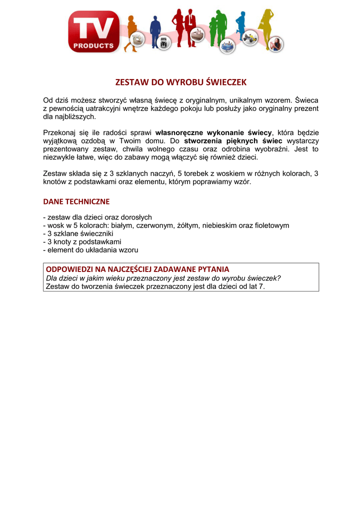 ZESTAW DO WYROBU ŚWIECZEK Od dziś możesz stworzyć własną świecę z oryginalnym, unikalnym wzorem. Świeca z pewnością uatrakcyjni wnętrze każdego pokoju lub posłuży jako oryginalny prezent dla najbliższych. Przekonaj się ile radości sprawi własnoręczne wykonanie świecy, która będzie wyjątkową ozdobą w Twoim domu. Do stworzenia pięknych świec wystarczy prezentowany zestaw, chwila wolnego czasu oraz odrobina wyobraźni. Jest to niezwykle łatwe, więc do zabawy mogą włączyć się również dzieci. Zestaw składa się z 3 szklanych naczyń, 5 torebek z woskiem w różnych kolorach, 3 knotów z podstawkami oraz elementu, którym poprawiamy wzór. DANE TECHNICZNE - zestaw dla dzieci oraz dorosłych - wosk w 5 kolorach: białym, czerwonym, żółtym, niebieskim oraz fioletowym - 3 szklane świeczniki - 3 knoty z podstawkami - element do układania wzoru ODPOWIEDZI NA NAJCZĘŚCIEJ ZADAWANE PYTANIA Dla dzieci w jakim wieku przeznaczony jest zestaw do wyrobu świeczek? Zestaw do tworzenia świeczek przeznaczony jest dla dzieci od lat 7.