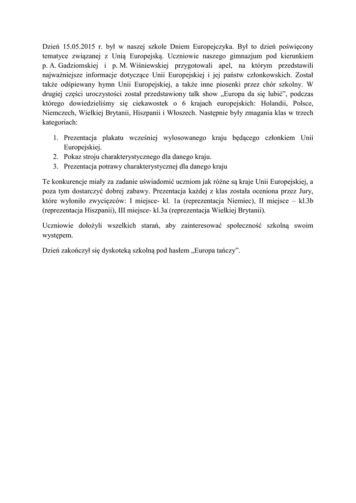 Dzień 15.05.2015 r. był w naszej szkole Dniem Europejczyka. Był to dzień poświęcony tematyce związanej z Unią Europejską. Uczniowie naszego gimnazjum pod kierunkiem p. A. Gadziomskiej i p. M. Wiśniewskiej przygotowali apel, na którym przedstawili najważniejsze informacje dotyczące Unii Europejskiej i jej państw członkowskich. Został także odśpiewany hymn Unii Europejskiej, a także inne piosenki przez chór szkolny. W drugiej części uroczystości został przedstawiony talk show „Europa da się lubić”, podczas którego dowiedzieliśmy się ciekawostek o 6 krajach europejskich: Holandii, Polsce, Niemczech, Wielkiej Brytanii, Hiszpanii i Włoszech. Następnie były zmagania klas w trzech kategoriach: 1. Prezentacja plakatu wcześniej wylosowanego kraju będącego członkiem Unii Europejskiej. 2. Pokaz stroju charakterystycznego dla danego kraju. 3. Prezentacja potrawy charakterystycznej dla danego kraju Te konkurencje miały za zadanie uświadomić uczniom jak różne są kraje Unii Europejskiej, a poza tym dostarczyć dobrej zabawy. Prezentacja każdej z klas została oceniona przez Jury, które wyłoniło zwycięzców: I miejsce- kl. 1a (reprezentacja Niemiec), II miejsce – kl.3b (reprezentacja Hiszpanii), III miejsce- kl.3a (reprezentacja Wielkiej Brytanii). Uczniowie dołożyli wszelkich starań, aby zainteresować społeczność szkolną swoim występem. Dzień zakończył się dyskoteką szkolną pod hasłem „Europa tańczy”.