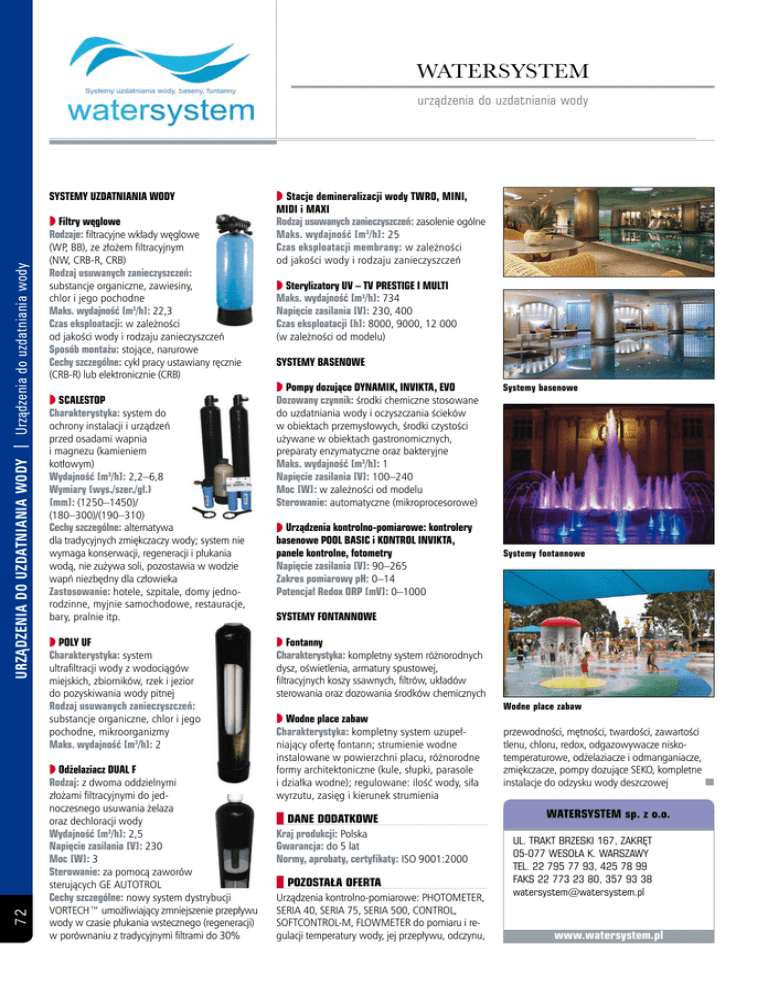 WATERSYSTEM urządzenia do uzdatniania wody Systemy uzdatniania wody URZĄDZENIA DO UZDATNIANIA wody | Urządzenia do uzdatniania wody ◗ Filtry węglowe Rodzaje: filtracyjne wkłady węglowe (WP, BB), ze złożem filtracyjnym (NW, CRB-R, CRB) Rodzaj usuwanych zanieczyszczeń: substancje organiczne, zawiesiny, chlor i jego pochodne Maks. wydajność [m3/h]: 22,3 Czas eksploatacji: w zależności od jakości wody i rodzaju zanieczyszczeń Sposób montażu: stojące, narurowe Cechy szczególne: cykl pracy ustawiany ręcznie (CRB-R) lub elektronicznie (CRB) ◗ ScaleStop Charakterystyka: system do ochrony instalacji i urządzeń przed osadami wapnia i magnezu (kamieniem kotłowym) Wydajność [m3/h]: 2,2–6,8 Wymiary (wys./szer./gł.) [mm]: (1250–1450)/ (180–300)/(190–310) Cechy szczególne: alternatywa dla tradycyjnych zmiękczaczy wody; system nie wymaga konserwacji, regeneracji i płukania wodą, nie zużywa soli, pozostawia w wodzie wapń niezbędny dla człowieka Zastosowanie: hotele, szpitale, domy jednorodzinne, myjnie samochodowe, restauracje, bary, pralnie itp. ◗ POLY UF Charakterystyka: system ultrafiltracji wody z wodociągów miejskich, zbiorników, rzek i jezior do pozyskiwania wody pitnej Rodzaj usuwanych zanieczyszczeń: substancje organiczne, chlor i jego pochodne, mikroorganizmy Maks. wydajność [m3/h]: 2 72 ◗ Odżelaziacz DUAL F Rodzaj: z dwoma oddzielnymi złożami filtracyjnymi do jednoczesnego usuwania żelaza oraz dechloracji wody Wydajność [m3/h]: 2,5 Napięcie zasilania [V]: 230 Moc [W]: 3 Sterowanie: za pomocą zaworów sterujących GE AUTOTROL Cechy szczególne: nowy system dystrybucji VORTECH™ umożliwiający zmniejszenie przepływu wody w czasie płukania wstecznego (regeneracji) w porównaniu z tradycyjnymi filtrami do 30% ◗ Stacje demineralizacji wody TWRO, MINI, MIDI i MAXI Rodzaj usuwanych zanieczyszczeń: zasolenie ogólne Maks. wydajność [m3/h]: 25 Czas eksploatacji membrany: w zależności od jakości wody i rodzaju zanieczyszczeń ◗ Sterylizatory UV – TV PRESTIGE I MULTI Maks. wydajność [m3/h]: 734 Napięcie zasilania [V]: 230, 400 Czas eksploatacji [h]: 8000, 9000, 12 000 (w zależności od modelu) Systemy basenowe ◗ Pompy dozujące DYNAMIK, INVIKTA, EVO Dozowany czynnik: środki chemiczne stosowane do uzdatniania wody i oczyszczania ścieków w obiektach przemysłowych, środki czystości używane w obiektach gastronomicznych, preparaty enzymatyczne oraz bakteryjne Maks. wydajność [m3/h]: 1 Napięcie zasilania [V]: 100–240 Moc [W]: w zależności od modelu Sterowanie: automatyczne (mikroprocesorowe) Systemy basenowe ◗ Urządzenia kontrolno-pomiarowe: kontrolery basenowe POOL BASIC i KONTROL INVIKTA, panele kontrolne, fotometry Napięcie zasilania [V]: 90–265 Zakres pomiarowy pH: 0–14 Potencjał Redox ORP [mV]: 0–1000 Systemy fontannowe Systemy fontannowe ◗ Fontanny Charakterystyka: kompletny system różnorodnych dysz, oświetlenia, armatury spustowej, filtracyjnych koszy ssawnych, filtrów, układów sterowania oraz dozowania środków chemicznych ◗ Wodne place zabaw Charakterystyka: kompletny system uzupełniający ofertę fontann; strumienie wodne instalowane w powierzchni placu, różnorodne formy architektoniczne (kule, słupki, parasole i działka wodne); regulowane: ilość wody, siła wyrzutu, zasięg i kierunek strumienia ■ DANE DODATKOWE Kraj produkcji: Polska Gwarancja: do 5 lat Normy, aprobaty, certyfikaty: ISO 9001:2000 ■ PozostaŁa oferta Urządzenia kontrolno-pomiarowe: PHOTOMETER, SERIA 40, SERIA 75, SERIA 500, CONTROL, SOFTCONTROL-M, FLOWMETER do pomiaru i regulacji temperatury wody, jej przepływu, odczynu, Wodne place zabaw przewodności, mętności, twardości, zawartości tlenu, chloru, redox, odgazowywacze niskotemperaturowe, odżelaziacze i odmanganiacze, zmiękczacze, pompy dozujące SEKO, kompletne ■ instalacje do odzysku wody deszczowej WATERSYSTEM sp. z o.o. UL. TRAKT BRZESKI 167, ZAKRĘT 05-077 WESOŁA K. WARSZAWY TEL. 22 795 77 93, 425 78 99 FAKS 22 773 23 80, 357 93 38 [email protected] www.watersystem.pl