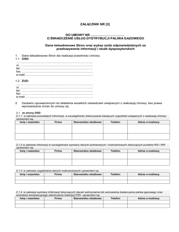 ZAŁĄCZNIK NR [3] DO UMOWY NR …………………………. O ŚWIADCZENIE USŁUG DYSTRYBUCJI PALIWA GAZOWEGO Dane teleadresowe Stron oraz wykaz osób odpowiedzialnych za przekazywanie informacji i służb dyspozytorskich 1. Dane teleadresowe Stron dla realizacji przedmiotu Umowy: 1.1 OSD: ………………………………………………………………….. ul. ………………………….., ………………………………… tel.: …………………………………………………………….. fax: …………………………………………………………….. e-mail: …………………………………………………………. 1.2 ZUD: ………………………………………………………………….. ul. ………………………….., ………………………………… tel.: …………………………………………………………….. fax: …………………………………………………………….. e-mail: …………………………………………………………. 2. Osobami upoważnionymi do składania wszelkich oświadczeń związanych z realizacją Umowy, bez prawa wprowadzania zmian do umowy są: 2.1 ze strony OSD : 2.1.1 w zakresie pozostałych informacji, w szczególności dokonywania bieżących uzgodnień związanych z realizacją Umowy uprawnieni są: Imię i nazwisko Firma Stanowisko służbowe Telefon Adres e-mailowy 2.1.2 w zakresie informacji w szczególności wymiany danych pomiarowych / rozliczeniowych dotyczących punktów WS i WR uprawnieni są: Imię i nazwisko Firma Stanowisko służbowe Telefon Adres e-mailowy 2.1.3 w zakresie uzgadniania danych rozliczeniowych uprawnieni są: Imię i nazwisko Firma Stanowisko służbowe Telefon Adres e-mailowy 2.1.4 w zakresie wymiany informacji dotyczących zleceń wstrzymania lub wznowienia dostarczania paliwa gazowego oraz wniosków windykacyjnego zakończenia realizacji PZD uprawnieni są: Imię i nazwisko Firma Stanowisko służbowe Telefon Adres e-mailowy 2.2 ze strony ZUD: 2.2.1 w zakresie pozostałych informacji, w szczególności dokonywania bieżących uzgodnień związanych z realizacją Umowy uprawnieni są: Imię i nazwisko Firma Stanowisko służbowe Telefon Adres e-mailowy 2.2.2 w zakresie informacji w szczególności wymiany danych pomiarowych / rozliczeniowych dotyczących punktów WS i WR uprawnieni są: Imię i nazwisko Firma Stanowisko służbowe Telefon Adres e-mailowy 2.2.3 w zakresie uzgadniania danych rozliczeniowych uprawnieni są: Imię i nazwisko Firma Stanowisko służbowe Telefon Adres e-mailowy 2.2.4 w zakresie składania i modyfikacji Pojedynczego Zlecenia Dystrybucji (PZD) oraz Zbiorczego Zgłoszenia PZD (ZZ PZD) uprawnieni są: Imię i nazwisko Firma Stanowisko służbowe Telefon Adres e-mailowy 2.2.5 w zakresie składania i modyfikacji Zbiorczego Zgłoszenia Zapotrzebowania (ZZZ) uprawnieni są: Imię i nazwisko Firma Stanowisko służbowe Telefon Adres e-mailowy 2.2.6 w zakresie przekazywania zleceń wstrzymania lub wznowienia dostarczania paliwa gazowego oraz składania wniosków windykacyjnego zakończenia realizacji PZD (windykacja) uprawnieni są: Imię i nazwisko Firma Stanowisko służbowe Telefon Adres e-mailowy 3. Osobami uprawnionymi do kontaktu operacyjnego służb dyspozytorskich i eksploatacyjnych są: 3.1 ze strony OSD : Imię i nazwisko Firma Stanowisko służbowe Telefon Adres e-mailowy 3.2 ze strony ZUD : Imię i nazwisko Firma Stanowisko służbowe Telefon Adres e-mailowy