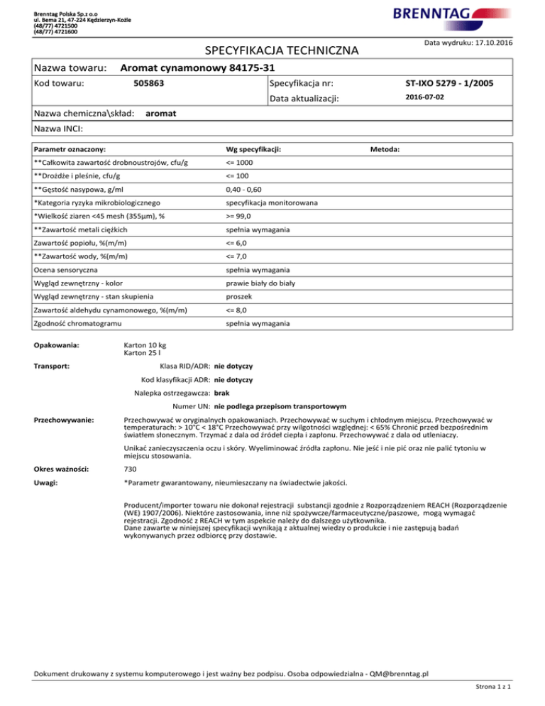 Brenntag Polska Sp.z o.o ul. Bema 21, 47-224 Kędzierzyn-Kożle (48/77) 4721500 (48/77) 4721600 Data wydruku: 17.10.2016 SPECYFIKACJA TECHNICZNA Nazwa towaru: Aromat cynamonowy 84175-31 Kod towaru: 505863 Nazwa chemiczna\skład: Specyfikacja nr: ST-IXO 5279 - 1/2005 Data aktualizacji: 2016-07-02 aromat Nazwa INCI: Parametr oznaczony: Wg specyfikacji: **Całkowita zawartość drobnoustrojów, cfu/g <= 1000 **Drożdże i pleśnie, cfu/g <= 100 **Gęstość nasypowa, g/ml 0,40 - 0,60 *Kategoria ryzyka mikrobiologicznego specyfikacja monitorowana *Wielkość ziaren <45 mesh (355µm), % >= 99,0 **Zawartość metali ciężkich spełnia wymagania Zawartość popiołu, %(m/m) <= 6,0 **Zawartość wody, %(m/m) <= 7,0 Ocena sensoryczna spełnia wymagania Wygląd zewnętrzny - kolor prawie biały do biały Wygląd zewnętrzny - stan skupienia proszek Zawartość aldehydu cynamonowego, %(m/m) <= 8,0 Zgodność chromatogramu spełnia wymagania Opakowania: Metoda: Karton 10 kg Karton 25 l Transport: Klasa RID/ADR: nie dotyczy Kod klasyfikacji ADR: nie dotyczy Nalepka ostrzegawcza: brak Numer UN: nie podlega przepisom transportowym Przechowywanie: Przechowywać w oryginalnych opakowaniach. Przechowywać w suchym i chłodnym miejscu. Przechowywać w temperaturach: > 10°C < 18°C Przechowywać przy wilgotności względnej: < 65% Chronić przed bezpośrednim światłem słonecznym. Trzymać z dala od źródeł ciepła i zapłonu. Przechowywać z dala od utleniaczy. Unikać zanieczyszczenia oczu i skóry. Wyeliminować źródła zapłonu. Nie jeść i nie pić oraz nie palić tytoniu w miejscu stosowania. Okres ważności: 730 Uwagi: *Parametr gwarantowany, nieumieszczany na świadectwie jakości. Producent/importer towaru nie dokonał rejestracji substancji zgodnie z Rozporządzeniem REACH (Rozporządzenie (WE) 1907/2006). Niektóre zastosowania, inne niż spożywcze/farmaceutyczne/paszowe, mogą wymagać rejestracji. Zgodność z REACH w tym aspekcie należy do dalszego użytkownika. Dane zawarte w niniejszej specyfikacji wynikają z aktualnej wiedzy o produkcie i nie zastępują badań wykonywanych przez odbiorcę przy dostawie. Dokument drukowany z systemu komputerowego i jest ważny bez podpisu. Osoba odpowiedzialna - [email protected] Strona 1 z 1