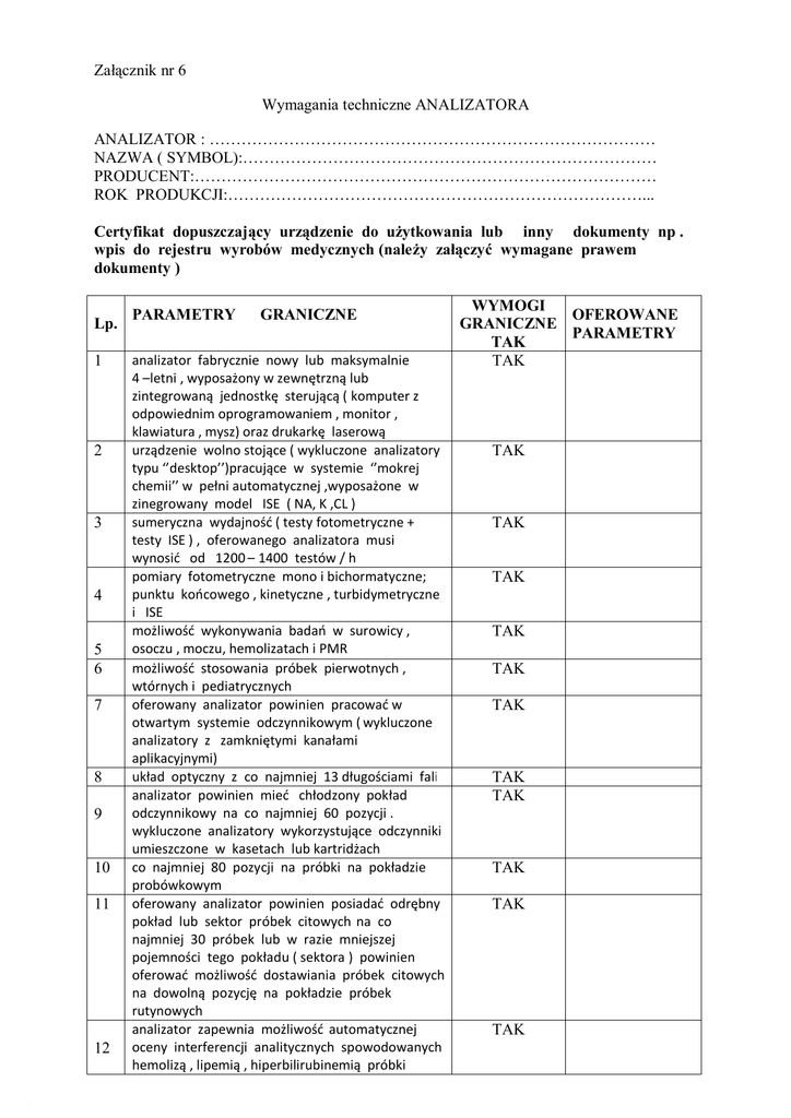 Załącznik nr 6 Wymagania techniczne ANALIZATORA ANALIZATOR : ………………………………………………………………………… NAZWA ( SYMBOL):…………………………………………………………………… PRODUCENT:…………………………………………………………………………… ROK PRODUKCJI:……………………………………………………………………... Certyfikat dopuszczający urządzenie do użytkowania lub inny dokumenty np . wpis do rejestru wyrobów medycznych (należy załączyć wymagane prawem dokumenty ) Lp. 1 2 3 4 5 6 7 8 9 10 11 12 PARAMETRY GRANICZNE analizator fabrycznie nowy lub maksymalnie 4 –letni , wyposażony w zewnętrzną lub zintegrowaną jednostkę sterującą ( komputer z odpowiednim oprogramowaniem , monitor , klawiatura , mysz) oraz drukarkę laserową urządzenie wolno stojące ( wykluczone analizatory typu ‘’desktop’’)pracujące w systemie ‘’mokrej chemii’’ w pełni automatycznej ,wyposażone w zinegrowany model ISE ( NA, K ,CL ) sumeryczna wydajność ( testy fotometryczne + testy ISE ) , oferowanego analizatora musi wynosić od 1200 – 1400 testów / h pomiary fotometryczne mono i bichormatyczne; punktu końcowego , kinetyczne , turbidymetryczne i ISE możliwość wykonywania badań w surowicy , osoczu , moczu, hemolizatach i PMR możliwość stosowania próbek pierwotnych , wtórnych i pediatrycznych oferowany analizator powinien pracować w otwartym systemie odczynnikowym ( wykluczone analizatory z zamkniętymi kanałami aplikacyjnymi) układ optyczny z co najmniej 13 długościami fali analizator powinien mieć chłodzony pokład odczynnikowy na co najmniej 60 pozycji . wykluczone analizatory wykorzystujące odczynniki umieszczone w kasetach lub kartridżach co najmniej 80 pozycji na próbki na pokładzie probówkowym oferowany analizator powinien posiadać odrębny pokład lub sektor próbek citowych na co najmniej 30 próbek lub w razie mniejszej pojemności tego pokładu ( sektora ) powinien oferować możliwość dostawiania próbek citowych na dowolną pozycję na pokładzie próbek rutynowych analizator zapewnia możliwość automatycznej oceny interferencji analitycznych spowodowanych hemolizą , lipemią , hiperbilirubinemią próbki WYMOGI OFEROWANE GRANICZNE PARAMETRY TAK TAK TAK TAK TAK TAK TAK TAK TAK TAK TAK TAK TAK 13 14 15 16 17 18 19 20 21 22 23 analizator powinien być wyposażony w co najmniej 2 niezależne igły odczynnikowe i igłę próbkową z detektorem skrzepu analizator umożliwia automatyczne wykonywanie zaprogramowanych uprzednio testów „reflex” dla wybranych paramatrów biochemicznych analizator powinien posiadać wbudowany program kontroli jakości z możliwością graficznego przedstawiania wyników analizator powinie być wyposażony w wielostopniową stację mycia kuwet reakcyjnych i wykorzystywać kuwety wielorazowe ( wykluczone analizatory bez stacji mycia i pracujące na kuwetach jednorazowych) kuwety reakcyjne zanurzone w ciekłym medium termostatującym minimalna objętość próbki w zakresie 1 – 1,5 ul możliwość ciągłego dostawiania próbek i uzupełniania odczynników bez przerywania biegnących analiz możliwość stałego monitorowania stanu odczynników z informacją o pozostałej w pojemnikach odczynnikowych ilości testów wbudowane czytniki barkodów próbek i odczynników w standardzie dwukierunkowa komunikacja analizatora z aktualnie stosowanym w laboratorium -laboratoryjnym systemem informatycznym wykonawca zapewni podłączenie oferowanego analizatora i uruchomienie dwukierunkowej transmisji danych na własny koszt w trakcie trwania dzierżawy oferent zapewni zamawiającemu bezpłatny udział w mi1) dzynarodowym programie zewnętrznej kontroli jakości badań w zakresie biochemii klinicznej WYMAGANIA DODATKOWE 1 2 3 4 5 w ramach dzierżawy, Wykonawca dostarczy , nieodpłatnie stołową wirówkę laboratoryjną mpw 223 e z rotorem na 24 probówki w przypadku awarii i aparatu serwis Wykonawcy usunie usterkę w ciągu 24 godz. do wszystkich badań biochemicznych , które mają być wykonywane na oferowanym analizatorze powinny być dostarczone aplikacje na oferowany analizator oraz na będący w posiadaniu laboratorium analizator HITACHI 902 Na spełnienie wymagań do oferty należy załączyć instrukcje lub ulotki w przypadku niedoszacowania oferty przez oferenta ponosi on wszystkie skutki finansowe TAK TAK TAK TAK TAK TAK TAK TAK TAK TAK TAK OFEROWANE WYMOGI GRANICZNE PARAMETRY TAK TAK TAK TAK TAK TAK 6 7 8 Lp. 1 2 3 4 5 6 bezpłatny przegląd serwisowy aparatu raz w roku W razie awarii aparatu koszty napraw i dojazdu pokrywa Wykonawca Straty odczynnikowe, które będą wynikały z awarii aparatu wyrówna na swój koszt Wykonawca PARAMETRY DO OCENY odczynniki ciekłe ( za wyjątkiem odczynnika do fosfatazy kwaśnej ) , gotowe do użycia w opakowaniach dedykowanych na oferowany analizator odczynniki do wykonywanych w laboratorium klienta badań biochemicznych ( nie dotyczy fosfatazy kwaśnej i bilirubiny met. jendrasika – grofa ) powinny być również dostępne w opakowaniach dostosowanych do bezpośredniego wstawiania na posiadany przez klienta analizator hitachi 902 oferowany program międzynarodowej kontroli jakości badań ma zawierać co najmniej 2 serie kontrolne / rok , składające się z 2 różnych próbek . każda seria powinna kończyć się uzyskaniem certyfikatu lub zaświadczenia uczestnictwa. oferent przedstawi również dokument organizatora kontroli uprawniający go do dystrybucji w/w programów kontrolnych w polsce. organizatorem kontroli musi być wyłącznie jednostka naukowa , nie związana z produkcją lub dystrybucją odczynników lub analizatorów analizator z wbudowanym , zitegrowanym , bezobsługowym modułem ise pozwalającym na jednoczesne oznaczanie sodu , potasu i chloru metodą pośrednią . kalibracja jonów nie częściej niż raz na 24 h dostępny odczynnik d