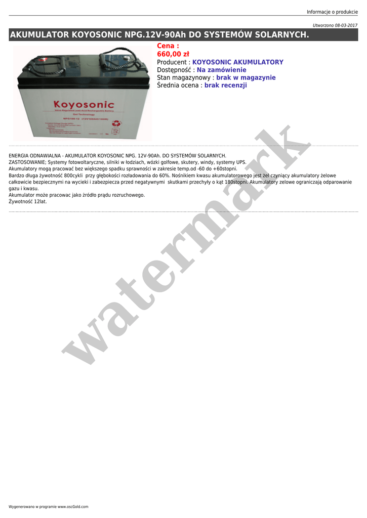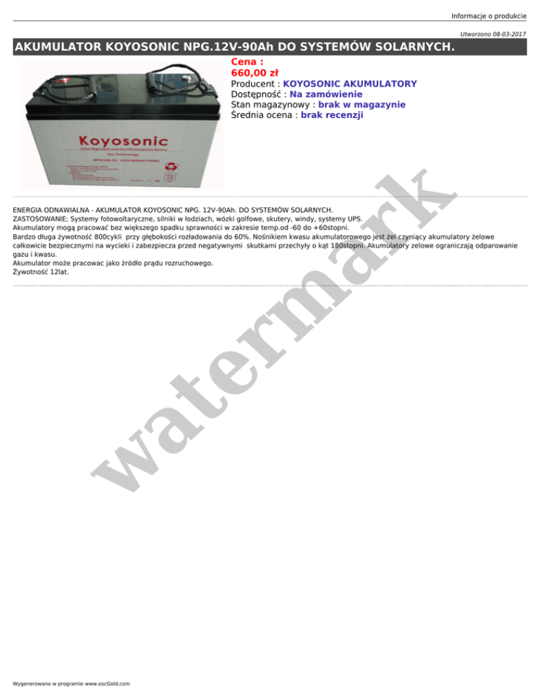 Informacje o produkcie Utworzono 08-03-2017 AKUMULATOR KOYOSONIC NPG.12V-90Ah DO SYSTEMÓW SOLARNYCH. Cena : 660,00 zł er m ar k Producent : KOYOSONIC AKUMULATORY Dostępność : Na zamówienie Stan magazynowy : brak w magazynie Średnia ocena : brak recenzji w at ENERGIA ODNAWIALNA - AKUMULATOR KOYOSONIC NPG. 12V-90Ah. DO SYSTEMÓW SOLARNYCH. ZASTOSOWANIE; Systemy fotowoltaryczne, silniki w łodziach, wózki golfowe, skutery, windy, systemy UPS. Akumulatory mogą pracować bez większego spadku sprawności w zakresie temp.od -60 do +60stopni. Bardzo długa żywotność 800cykli przy głębokości rozładowania do 60%. Nośnikiem kwasu akumulatorowego jest żel czyniący akumulatory żelowe całkowicie bezpiecznymi na wycieki i zabezpiecza przed negatywnymi skutkami przechyły o kąt 180stopni. Akumulatory zelowe ograniczają odparowanie gazu i kwasu. Akumulator może pracowac jako żródło prądu rozruchowego. Żywotność 12lat. Wygenerowano w programie www.oscGold.com