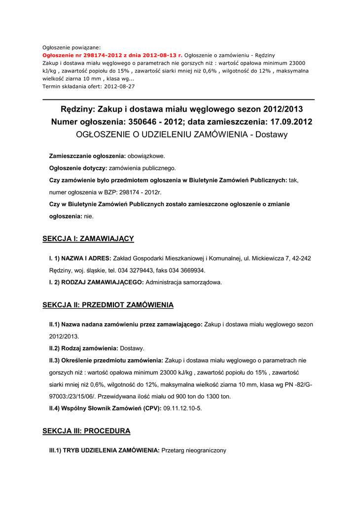 Ogłoszenie powiązane: Ogłoszenie nr 298174-2012 z dnia 2012-08-13 r. Ogłoszenie o zamówieniu - Rędziny Zakup i dostawa miału węglowego o parametrach nie gorszych niż : wartość opałowa minimum 23000 kJ/kg , zawartość popiołu do 15% , zawartość siarki mniej niż 0,6% , wilgotność do 12% , maksymalna wielkość ziarna 10 mm , klasa wg... Termin składania ofert: 2012-08-27 Rędziny: Zakup i dostawa miału węglowego sezon 2012/2013 Numer ogłoszenia: 350646 - 2012; data zamieszczenia: 17.09.2012 OGŁOSZENIE O UDZIELENIU ZAMÓWIENIA - Dostawy Zamieszczanie ogłoszenia: obowiązkowe. Ogłoszenie dotyczy: zamówienia publicznego. Czy zamówienie było przedmiotem ogłoszenia w Biuletynie Zamówień Publicznych: tak, numer ogłoszenia w BZP: 298174 - 2012r. Czy w Biuletynie Zamówień Publicznych zostało zamieszczone ogłoszenie o zmianie ogłoszenia: nie. SEKCJA I: ZAMAWIAJĄCY I. 1) NAZWA I ADRES: Zakład Gospodarki Mieszkaniowej i Komunalnej, ul. Mickiewicza 7, 42-242 Rędziny, woj. śląskie, tel. 034 3279443, faks 034 3669934. I. 2) RODZAJ ZAMAWIAJĄCEGO: Administracja samorządowa. SEKCJA II: PRZEDMIOT ZAMÓWIENIA II.1) Nazwa nadana zamówieniu przez zamawiającego: Zakup i dostawa miału węglowego sezon 2012/2013. II.2) Rodzaj zamówienia: Dostawy. II.3) Określenie przedmiotu zamówienia: Zakup i dostawa miału węglowego o parametrach nie gorszych niż : wartość opałowa minimum 23000 kJ/kg , zawartość popiołu do 15% , zawartość siarki mniej niż 0,6%, wilgotność do 12%, maksymalna wielkość ziarna 10 mm, klasa wg PN -82/G97003:/23/15/06/. Przewidywana ilość miału od 900 ton do 1300 ton. II.4) Wspólny Słownik Zamówień (CPV): 09.11.12.10-5. SEKCJA III: PROCEDURA III.1) TRYB UDZIELENIA ZAMÓWIENIA: Przetarg nieograniczony III.2) INFORMACJE ADMINISTRACYJNE Zamówienie dotyczy projektu/programu finansowanego ze środków Unii Europejskiej: nie SEKCJA IV: UDZIELENIE ZAMÓWIENIA IV.1) DATA UDZIELENIA ZAMÓWIENIA: 17.09.2012. IV.2) LICZBA OTRZYMANYCH OFERT: 8. IV.3) LICZBA ODRZUCONYCH OFERT: 8. IV.4) NAZWA I ADRES WYKONAWCY, KTÓREMU UDZIELONO ZAMÓWIENIA: Firma Trans Przewozowo Handlowa Ewelina Wołoch, Markowice ul.Górska 35, 42-350 Koziegłowy, kraj/woj. śląskie. IV.5) Szacunkowa wartość zamówienia (bez VAT): 413000,00 PLN. IV.6) INFORMACJA O CENIE WYBRANEJ OFERTY ORAZ O OFERTACH Z NAJNIŻSZĄ I NAJWYŻSZĄ CENĄ Cena wybranej oferty: 391,14 Oferta z najniższą ceną: 391,14 / Oferta z najwyższą ceną: 490,00 Waluta: PLN.