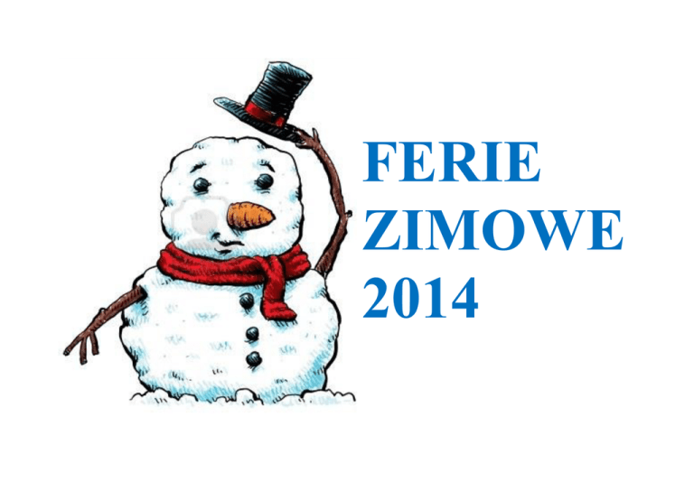 FERIE ZIMOWE 2014 Data Godzina Wtorek, 21 stycznia 2014 9.00 Wtorek, 21 stycznia 2014 9.15 Środa, 22 stycznia 2014 10.00 Rodzaj zajęć Organizator Wyjazd do kręgielni oraz na tor lodowy do Tomaszowa Maz. Szkoła oraz GOKiS p. Izabela Dybała Wyjazd do kina „Helios” w Piotrkowie Tryb. na film „Robaczki z Zaginionej Doliny” Szkoła p. Agnieszka Kaleta p. Ewelina Podlecka Turniej Tenisa Stołowego GOKiS Opiekunowie Uwagi Cena 10,00 zł p. Mariusz Kowalewski Dla uczniów klas I - VI Cena 22,00 zł Wyjazd uzależniony od ilości chętnych. p. Andrzej Nitek bezpłatnie Hala Sportowa bezpłatnie Środa, 22 stycznia 2014 10.00 – 12.00 Projekcja filmów fabularnych o tematyce historycznej Szkoła p. Piotr Skrobek Szkoła Dla uczniów klas IV- VI Czwartek, 23 stycznia 2014 11.00 – 21.30 Aikido 11.00 – 21.30 dla uczniów klas I – VI; Hala p. Marta Wąs Sportowa Należy zabrać t-shirt, długie spodnie dresowe oraz klapki. 12.30 – 13.15 dla uczniów zerówek Czwartek, 23 stycznia 2014 10.00 Warsztaty Sztuki Magicznej bezpłatnie Hala Sportowa bezpłatnie GOKiS Dom Kultury Piątek, 24 stycznia 2014 Poniedziałek, 27 stycznia 2014 9.00 8.00 p. Jolanta Cinkowska Wyjazd do kina „Helios” na film „Skubani” Wycieczka do Muzeum Techniki w Sielpi oraz zwiedzanie Zespołu Klasztornego Opactwa Cystersów w Sulejowie Szkoła oraz GOKiS Szkoła oraz GOKiS p. Teresa Czechowska – - Ośkiewicz p. Mariusz Kowalewski p. Elżbieta Góra p. Piotr Skrobek Cena 10 zł Dom Kultury Cena 10 zł Dom Kultury Dla uczniów klas IV – VI p. Mariusz Kowalewski Zapisy u p. Eli Góry Ilość miejsc ograniczona! Wtorek, 28 stycznia 2014 10.00 Turniej Szachowy i Warcabowy GOKiS p. Piotr Kaukel bezpłatnie Dom Kultury Środa, 29 stycznia 2014 Środa, 29 stycznia 2014 10.00 10.00 - 12.00 Turniej Piłki Nożnej o Puchar Dyrektora GOKiS Szkoła oraz GOKiS p. Anna Budzisz Projekcja filmów fabularnych o tematyce historycznej Szkoła p. Piotr Skrobek bezpłatnie p. Mariusz Kowalewski Hala Sportowa bezpłatnie Szkoła Dla uczniów klas IV- VI Czwartek, 30 stycznia 2014 10.00 Spotkanie kulinarne oraz gry i zabawy wGOKiS Szkoła oraz GOKiS p. Elżbieta Góra P. Mariusz bezpłatnie Dom Kultury Czwartek, 30 stycznia 2014 11.00 – 21.30 Aikido 11.00 – 21.30 dla uczniów klas I – VI; 12.30 – 13.15 dla uczniów zerówek Hala p. Marta Wąs Sportowa bezpłatnie Hala Sportowa Należy zabrać t-shirt, długie spodnie dresowe oraz klapki.