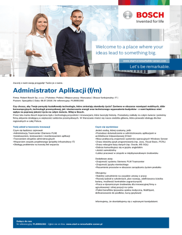 Zacznij z nami swoją przygodę! Twórz je z name. Administrator Aplikacji (f/m) Firma: Robert Bosch Sp. z o.o. | Państwo: Polska | Miejsce pracy: Warszawa | Obszar funkcjonalny: IT | Poziom: Specjaliści | Data: 06.07.2016 | Nr referencyjny: PL00001592 Czy chcesz, aby Twoje pomysły kształtowały technologie, które zmieniają standardy życia? Zarówno w obszarze rozwiązań mobilnych, dóbr konsumpcyjnych, technologii przemysłowej, jak i dostarczania energii oraz technicznego wyposażenia budynków - z nami będziesz mieć wpływ na poprawę jakości życia na całym świecie. Witaj w Bosch. Przez lata marka Bosch kojarzona była z technologią przyszłości i innowacjami, które tworzyły historię. Posiadamy zakłady na całym świecie i jesteśmy firmą aktywnie działającą w większości sektorów przemysłowych. W Warszawie mieści się nasza siedziba główna, która prowadzi obsługę dla biur regionalnych w całej Polsce. Twój udział w tworzeniu innowacji Czym się wyróżniasz Czym się będziesz zajmował: •Administracją Teamcenter (Siemens PLM) •Instalowaniem, testowaniem i monitorowaniem aplikacji •Tworzeniem skryptów administracyjnych •Wsparciem zespołu projektowego (projekty infrastruktury IT) •Obsługą problemów na trzeciej linii wsparcia Jesteś osobą, której szukamy, jeśli: •Posiadasz doświadczenie w administrowaniu aplikacjami w architekturze trójwarstwowej (3-tier) •Masz praktyczną znajomość systemów operacyjnych Windows Serwer •Znasz dowolny język programowania (np. Java, Visual Basic, PERL) •Znasz relacyjne bazy danych (np. Oracle, MS SQL) •Dobrze komunikujesz się w języku angielskim •Jesteś samodzielny •Lubisz pracować w zespole w międzynarodowym środowisku Dodatkowe atuty: •Znajomość systemu Siemens PLM Teamcenter •Znajomość języka niemieckiego •Rozumienie procesów w obszarze zarządzania życiem produktu Oferujemy: •Stabilne zatrudnienie na zasadzie umowy o pracę •Rozwój (udział w szkoleniach, plan rozwoju, zdefiniowana ścieżka kariery, możliwość kontraktów zagranicznych) •Praca w dynamicznym środowisku dla innowacyjnej firmy o ugruntowanej i silnej pozycji na rynku •Pakiet benefitów (prywatna opieka medyczna, MultiSport, dofinansowanie do posiłków, kursy językowe) Informujemy, że skontaktujemy się z wybranymi kandydatami. Dołącz do nas Nr referencyjny PL00001592 - Zgłoś sie on-line: www.start-a-remarkable-career.pl