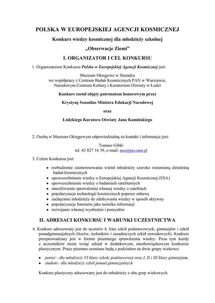 POLSKA W EUROPEJSKIEJ AGENCJI KOSMICZNEJ Konkurs wiedzy kosmicznej dla młodzieży szkolnej „Obserwacje Ziemi” I. ORGANIZATOR I CEL KONKURSU 1. Organizatorem Konkursu Polska w Europejskiej Agencji Kosmicznej jest: Muzeum Okręgowe w Sieradzu we współpracy z Centrum Badań Kosmicznych PAN w Warszawie, Narodowym Centrum Kultury i Kuratorium Oświaty w Łodzi Konkurs został objęty patronatem honorowym przez Krystynę Szumilas Ministra Edukacji Narodowej oraz Łódzkiego Kuratora Oświaty Jana Kamińskiego 2. Osobą w Muzeum Okręgowym odpowiedzialną za kontakt i informacje jest: Tomasz Gibki tel. 43 827 16 39, e-mail: [email protected] 3. Celem Konkursu jest: rozbudzenie zainteresowania wśród młodzieży szeroko rozumianą dziedziną badań kosmicznych upowszechnianie wiedzy o Europejskiej Agencji Kosmicznej (ESA) upowszechnienie wiedzy o badaniach satelitarnych umożliwienie sprawdzenia własnej wiedzy o satelitach popularyzacja technologii kosmicznych poprzez zabawę zachęcanie młodzieży do zdobywania wiedzy w sposób aktywny popularyzacja Internetu jako nośnika informacji rozwijanie własnej wyobraźni i pomysłów II. ADRESACI KONKURSU I WARUNKI UCZESTNICTWA 4. Konkurs adresowany jest do uczniów 6. klas szkół podstawowych, gimnazjów i szkół ponadgimnazjalnych (liceów, techników i zasadniczych szkół zawodowych). Konkurs przeprowadzany jest w formie pisemnego sprawdzenia wiedzy. Poza tym każdy z uczestników może wziąć udział w dodatkowym, nieobowiązkowym konkursie plastycznym. Prace pisemne oceniane będą z podziałem na dwie grupy wiekowe: junior - dla młodzieży VI klasy szkoły podstawowej oraz I, II i III klasy gimnazjum, student - dla młodzieży szkół ponad gimnazjalnych Konkurs plastyczny adresowany jest do młodzieży z obu grup wiekowych. 5. Każdy z uczestników konkursu pisemnego musi odpowiedzieć na 10 pytań szczegółowych sprawdzających zdobytą wiedzę w dziedzinie badań kosmicznych i oraz na 1 pytanie/zadanie problemowe, wymagające rozwiniętej odpowiedzi, które uczestnik Konkursu może sam wybrać z zestawu pytań problemowych, podając tylko numery pytania z zestawu. 6. Odpowiedzi na pytanie/zadanie problemowe będą oceniane tylko wtedy, jeśli zostaną udzielone poprawne odpowiedzi na wszystkie pytania szczegółowe. Jeśli ten warunek nie będzie spełniony, uczestnik Konkursu nie będzie oceniany. 7. Kryteria oceniania odpowiedzi na pytanie/zadanie problemowe to: poprawność merytoryczna oryginalny i twórczy charakter odpowiedzi poprawność stylistyczna i językowa Uczestnikom Konkursu pozostawia się pełną swobodę w wyborze pytania/zadania problemowego. Objętość tekstu odpowiedzi nie może przekraczać 9000 znaków liczonych ze spacjami, dobór ilustracji jest dowolny. 8. Warunkiem uczestnictwa w Konkursie jest przesłanie elektroniczną wraz z danymi osobowymi uczestnika: odpowiedzi pocztą imię i nazwisko adres zamieszkania, adres mailowy, telefon kontaktowy rok urodzenia, klasa, szkoła kategoria konkursu (junior/student) na adres: [email protected] , w temacie listu należy podać „Konkurs Polska w ESA 2013” 9. Konkurs plastyczny organizowany jest pod hasłem „Ziemia widziana z kosmosu”. Jest on niezależny od konkursu wiedzy. Oceniane będą prace wykonane dowolną techniką (rysunek, malarstwo, grafika, collage, techniki mieszane, formy przestrzenne). Żaden z wymiarów pracy nie może przekroczyć 1 metra. Do każdej pracy konkursowej winna być dołączona metryczka z następującymi danymi: imię i nazwisko adres zamieszkania, adres mailowy, telefon kontaktowy rok urodzenia, klasa, szkoła kategoria konkursu (junior/student) na adres: Muzeum Okręgowe w Sieradzu ul. Dominikańska 2 98-200 Sieradz Z dopiskiem „Ziemia widziana z kosmosu” Trzy najlepsze prace (miejsce I, II i III) zostaną nagrodzone 10. Pełnoletni uczestnik konkursu (w przypadku uczestników niepełnoletnich - rodzic lub opiekun uczestnika w jego imieniu) powinien własnoręcznie podpisać i przesłać wraz z przesłaniem odpowiedzi, oświadczenie następującej treści: „Oświadczam,że wyrażam zgodę na przetwarzanie przez Organizatora konkursu moich danych osobowych w celach związanych z organizacją konkursu Polska w Europejskiej Agencji Kosmicznej. Zostałem/am poinformowany/a o prawie dostępu do treści moich danych oraz ich poprawiania. W odpowiedzi na regulamin konkursu Polska w Europejskiej Agencji Kosmicznej wraz z doręczeniem Muzeum Okręgowemu z siedzibą w Sieradzu odpowiedzi w Konkursie Polska w Europejskiej Agencji Kosmicznej udzielam również Muzeum Okręgowemu z siedzibą w Sieradzu, zgody na nieodpłatne publikowanie moich odpowiedzi na pytania konkursowe (dotyczy tylko odpowiedzi na pytanie/zadanie problemowe) na stronie internetowej Muzeum lub w pismach zajmujących się problematyką kosmiczną, przez okres 2 lat.” 11. Konkurs trwa od 27 maja do 10 września 2013 r. Termin doręczenia odpowiedzi pisemnych drogą mailową oraz prac plastycznych na adres Muzeum w Sieradzu upływa 10 września 2013 r. Po tym terminie prace nie będą przyjmowane. 12. Dostarczenie odpowiedzi konkursowych równoznaczne jest z akceptacją warunków Konkursu. III. PYTANIA KONKURSOWE Pytania szczegółowe (obowiązkowe), jednakowe dla juniorów i studentów: 1. Jaka jest rozdzielczość terenowa skanera MODIS pracującego na pokładzie satelitów TERRA i AQUA? 2. Jakie jest zadanie misji GRACE? 3. Jakimi literami oznaczane są zakresy pracy systemów radarowych obrazujących powierzchnię Ziemi. 4. Sensory lidarowe i radarowe SAR są systemami aktywnymi czy pasywnymi? 5. Wymień co najmniej trzy (z czterech) rodzajów rozdzielczości charakteryzujących zdjęcie satelitarne? 6. Kiedy został wystrzelony pierwszy satelita meteorologiczny i jak się nazywał? 7. Jakie satelity z serii LANDSAT nadal pracują na orbicie ? 8. Ile satelitów z serii SPOT zostało umieszczonych na orbicie ? 9. Czy możliwy jest pomiar temperatury 