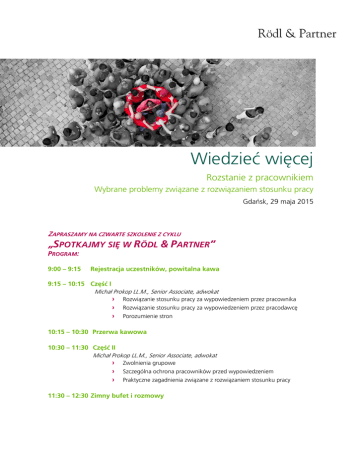 Wiedzieć więcej Rozstanie z pracownikiem Wybrane problemy związane z rozwiązaniem stosunku pracy Gdańsk, 29 maja 2015 ZAPRASZAMY NA CZWARTE SZKOLENIE Z CYKLU „SPOTKAJMY SIĘ W RÖDL & PARTNER” PROGRAM: 9:00 – 9:15 Rejestracja uczestników, powitalna kawa 9:15 – 10:15 Część I Michał Prokop LL.M., Senior Associate, adwokat › › › Rozwiązanie stosunku pracy za wypowiedzeniem przez pracownika Rozwiązanie stosunku pracy za wypowiedzeniem przez pracodawcę Porozumienie stron 10:15 – 10:30 Przerwa kawowa 10:30 – 11:30 Część II Michał Prokop LL.M., Senior Associate, adwokat › › › Zwolnienia grupowe Szczególna ochrona pracowników przed wypowiedzeniem Praktyczne zagadnienia związane z rozwiązaniem stosunku pracy 11:30 – 12:30 Zimny bufet i rozmowy Rozstanie z pracownikiem Wybrane problemy związane z rozwiązaniem stosunku pracy Gdańsk, 29 maja 2015 PROWADZĄCY Adwokat, absolwent prawa na Wydziale Prawa i Administracji Uniwersytetu Warszawskiego, absolwent Szkoły Prawa Niemieckiego przy UW, magister prawa niemieckiego (LL.M) Reńskiego Uniwersytetu Fryderyka Wilhelma w Bonn. Starszy prawnik w dziale prawnopodatkowym w warszawskim oddziale kancelarii Rödl & Partner. Jego sześcioletnie doświadczenie zawodowe jest ściśle związane z doradztwem w zakresie polskiego, jak również niemieckiego, prawa pracy. Reprezentuje klientów przed sądami powszechnymi, zajmuje się bieżącym doradztwem prawnym, ze szczególnym uwzględnieniem praktycznych aspektów prawa pracy oraz uczestniczy w organizacji szkoleń. Michał Prokop, LL.M. (Bonn) Senior Associate, adwokat tel.: + 48 22 244 00 76 e-mail: [email protected] TERMIN I ZGŁOSZENIA Spotkanie zostanie przeprowadzone w języku polskim w dniu 29 maja 2015. w godzinach 9:00-12:30 w biurze Rödl & Partner w Gdańsku, ul. Chrzanowskiego 10/U m.7. Zgłoszenia przyjmuje: Marta Sikorska fax: + 48 58 520 27 20 e-mail: [email protected] Termin nadsyłania zgłoszeń upływa 25 maja 2015. Koszt uczestnictwa wynosi 200 PLN + 23% VAT za osobę. Dla klientów Rödl & Partner koszt uczestnictwa wynosi 100 zł + 23% VAT za osobę. Uczestnikom zapewniamy przerwy kawowe oraz zimny bufet. Informujemy także, że ilość miejsc jest ograniczona, a warunkiem uczestnictwa jest otrzymanie mailem potwierdzenia o rejestracji. ZGŁOSZENIE Rozstanie z pracownikiem Wybrane problemy związane z rozwiązaniem stosunku pracy Gdańsk, 29 maja 2015, 9:00-12:30 ………………………………………………………………………………………………...... firma ………………………………………………………………………………………………...... imię i nazwisko uczestnika ………………………………………………… . e-mail ………………… telefon …………….. fax ………………………………………………………………………………………………...... adres: ulica, numer ……………………………………………………………… adres: miasto …………………… data ……………………...... podpis Zgłoszenia przyjmujemy: mailem na adres: faksem na numer: [email protected] +48 58 520 27 20 ……………………….......... kod pocztowy Warunkiem uczestnictwa jest otrzymanie mailem potwierdzenia o zarejestrowaniu uczestnika. Koszt uczestnictwa wynosi 200 PLN + 23% VAT za osobę. Dla klientów Rödl & Partner koszt uczestnictwa wynosi 100 PLN + 23% VAT za osobę. Uczestnikom zapewniamy przerwy kawowe oraz zimny bufet. Informujemy, że ilość miejsc jest ograniczona. Decyduje kolejność zgłoszeń. Wysłanie zgłoszenia jest równoznaczne z akceptacją przetwarzania danych osobowych i kontaktowych do celów związanych ze szkoleniami jak również promocją usług spółek grupy Rödl & Partner.