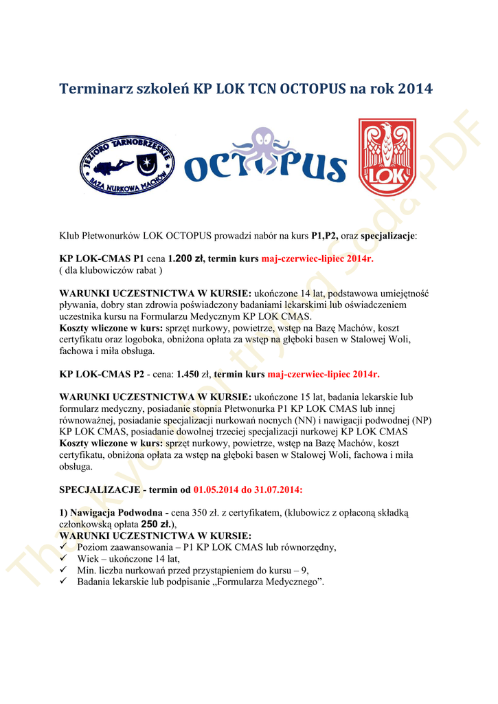 Terminarz szkoleń KP LOK TCN OCTOPUS na rok 2014 Klub Płetwonurków LOK OCTOPUS prowadzi nabór na kurs P1,P2, oraz specjalizacje: KP LOK-CMAS P1 cena 1.200 zł, termin kurs maj-czerwiec-lipiec 2014r. ( dla klubowiczów rabat ) WARUNKI UCZESTNICTWA W KURSIE: ukończone 14 lat, podstawowa umiejętność pływania, dobry stan zdrowia poświadczony badaniami lekarskimi lub oświadczeniem uczestnika kursu na Formularzu Medycznym KP LOK CMAS. Koszty wliczone w kurs: sprzęt nurkowy, powietrze, wstęp na Bazę Machów, koszt certyfikatu oraz logoboka, obniżona opłata za wstęp na głęboki basen w Stalowej Woli, fachowa i miła obsługa. KP LOK-CMAS P2 - cena: 1.450 zł, termin kurs maj-czerwiec-lipiec 2014r. WARUNKI UCZESTNICTWA W KURSIE: ukończone 15 lat, badania lekarskie lub formularz medyczny, posiadanie stopnia Płetwonurka P1 KP LOK CMAS lub innej równoważnej, posiadanie specjalizacji nurkowań nocnych (NN) i nawigacji podwodnej (NP) KP LOK CMAS, posiadanie dowolnej trzeciej specjalizacji nurkowej KP LOK CMAS Koszty wliczone w kurs: sprzęt nurkowy, powietrze, wstęp na Bazę Machów, koszt certyfikatu, obniżona opłata za wstęp na głęboki basen w Stalowej Woli, fachowa i miła obsługa. SPECJALIZACJE - termin od 01.05.2014 do 31.07.2014: 1) Nawigacja Podwodna - cena 350 zł. z certyfikatem, (klubowicz z opłaconą składką członkowską opłata 250 zł.), WARUNKI UCZESTNICTWA W KURSIE: Poziom zaawansowania – P1 KP LOK CMAS lub równorzędny, Wiek – ukończone 14 lat, Min. liczba nurkowań przed przystąpieniem do kursu – 9, Badania lekarskie lub podpisanie „Formularza Medycznego”. 2) Nurkowanie Nocne - cena 350 zł. z certyfikatem, (klubowicz z opłaconą składką członkowską opłata 250 zł.), WARUNKI UCZESTNICTWA W KURSIE: Poziom zaawansowania – P1 KP LOK CMAS lub równorzędny, Wiek – ukończone 14 lat, Min. liczba nurkowań przed przystąpieniem do kursu – 9, Badania lekarskie lub podpisanie „Formularza Medycznego”, 3) Poszukiwanie i Wydobywanie - cena 350 zł. z certyfikatem, (klubowicz z opłaconą składką członkowską opłata 250 zł.), WARUNKI UCZESTNICTWA W KURSIE: Poziom zaawansowania – P1 KP LOK CMAS lub równorzędny, Wiek – ukończone 14 lat, Min. liczba nurkowań przed przystąpieniem do kursu – 20, Badania lekarskie lub podpisanie „Formularza Medycznego”, 4) Wrakowe - cena 350 zł. z certyfikatem, (klubowicz z opłaconą składką członkowską opłata 250 zł.), WARUNKI UCZESTNICTWA W KURSIE: Poziom zaawansowania – P1 KP LOK CMAS lub równorzędny, Wiek – 14 lat, Min. liczba nurkowań przed przystąpieniem do kursu – 20, Badania lekarskie lub podpisanie „Formularza Medycznego”, 5) Suchy Skafander - cena 350 zł. z certyfikatem, (klubowicz z opłaconą składką członkowską opłata 250 zł.), WARUNKI UCZESTNICTWA W KURSIE: Poziom zaawansowania – P1 KP LOK CMAS lub równorzędny, Badania lekarskie lub podpisanie „Formularza Medycznego”, 6) Nurkowanie Nitroksowe - cena 390 zł. z certyfikatem, (klubowicz z opłaconą składką członkowską opłata 290 zł.), WARUNKI UCZESTNICTWA W KURSIE: Poziom zaawansowania – P1 KP LOK CMAS lub równorzędny, Wiek – ukończone 14 lat, Min. liczba nurkowań przed przystąpieniem do kursu – 9, Badania lekarskie lub podpisanie „Formularza Medycznego”, Termin przyjmowania zgłoszeń: Specjalizacje do 25.05. .2014r (lub termin ustalany indywidualnie z instruktorem). Kurs P1,P2 KP LOK CMAS do 25.05.2014r (lub termin ustalany indywidualnie z instruktorem).Warunkiem przystąpienia do kursu specjalizacji jest spełnienie w/w kryteriów oraz zgłoszenie chęci przystąpienia pisemnie lub telefonicznie, ustalenie terminu oraz wpłacenie wpisowego w wysokości 100 zł., wszystkie specjalizacje z wyłączeniem nurkowanie nitroksowe wpisowe 130 zł. Instruktor M1 Daria Majewska Kontakt w sprawie wybranych specjalizacji oraz kursu P1- MNP - Instruktor Nawigacji Podwodnej, MSS - Instruktor Nurkowań w Skafandrach Suchych : Instruktor – Daria Majewska tel. 535 276 995, e-mail: [email protected] DANE DO WPŁATY KURS P1 oraz specjalizacje KP LOK CMAS: KP LOK TCN OCTOPUS, Liga Obrony Kraju , Biuro Podkarpackiego ZW, ul. Gołębia 10, 35-205 Rzeszów, NIP 521-008-68-32, Pekao SA 41 12 40 4764 1111 0000 4866 1236 W dopisku " P1 KP LOK CMAS Octopus" certyfikat…………………..OCTOPUS " Instruktor M2 Mirosław Kowalczyk Kontakt w sprawie wybranych specjalizacji oraz kursu P2 - MNN - Instruktor Nurkowania Nocnego, MPW - Instruktor Poszukiwania i Wydobywania Małych Przedmiotów, MNP - Instruktor Nawigacji Podwodnej, MSS - Instruktor Nurkowań w Skafandrach Suchych , MPL - Instruktor Nurkowań Podlodowych , MBNx - Instruktor Nurkowań Nitroksowych, MWM - Instruktor Nurkowań Wrakowo-Morskich : Instruktor - Mirosław Kowalczyk, tel. 889403441, e-mail: [email protected] DANE DO WPŁATY SPECJALIZACJE: PKO BP 30 1020 4939 0000 0102 0011 5477 W dopisku " certyfikat………………….." W przypadku szkolenia P2 KP LOK CMAS wymagana pełna odpłatność w wysokości 1.450 zł. w momencie przystąpienia do kursu. DANE DO WPŁATY KURS P2 KP LOK CMAS: KP LOK TCN OCTOPUS, Liga Obrony Kraju , Biuro Podkarpackiego ZW, ul. Gołębia 10, 35-205 Rzeszów, NIP 521-008-68-32, Pekao SA 41 12 40 4764 1111 0000 4866 1236 W dopisku " P2 KP LOK CMAS Octopus" Prezes - Piotr Pawlik tel. 697692387 e-mail: [email protected], Skarbnik - Tomasz Smykla tel. 603047969 e-mail: [email protected] www.lok-octopus.pl