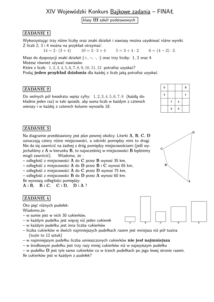 XIV Wojewódzki Konkurs Bajkowe zadania – FINAŁ klasy III szkół podstawowych ZADANIE 1 Wykorzystując trzy różne liczby oraz znaki działań i nawiasy można uzyskiwać różne wyniki. Z liczb 2, 3 i 4 można na przykład otrzymać: 14 = 2 · (3 + 4) 10 = 2 · 3 + 4 5=3+4:2 6 = (4 − 2) · 3. Masz do dyspozycji znaki działań (+, –, ·, :) oraz trzy liczby: 1, 2 oraz 4. Możesz również używać nawiasów. Które z liczb: 1, 2, 3, 4, 5, 6, 7, 8, 9, 10, 11, 12 potrafisz uzyskać? Podaj jeden przykład działania dla każdej z liczb jaką potrafisz uzyskać. ZADANIE 2 Do wolnych pól kwadratu wpisz cyfry: 1, 2, 3, 4, 5, 6, 7, 8 (każdą dokładnie jeden raz) w taki sposób, aby suma liczb w każdym z czterech wierszy i w każdej z czterech kolumn wynosiła 18. 6 8 3 1 7 4 2 5 ZADANIE 3 D Na diagramie przedstawiony jest plan pewnej okolicy. Literki A, B, C, D oznaczają cztery różne miejscowości, a odcinki pomiędzy nimi to drogi. Nie da się zawrócić na żadnej z dróg pomiędzy miejscowościami (jeśli wyjechaliśmy z A w kierunku B, to najwcześniej w miejscowości B będziemy mogli zawrócić). Wiadomo, że : – odległość z miejscowości A do C przez B wynosi 35 km, – odległość z miejscowości A do D przez B i C wynosi 65 km, – odległość z miejscowości A do C przez D wynosi 75 km, – odległość z miejscowości B do D przez A wynosi 60 km. Ile wynoszą odległości pomiędzy: A i B, B i C, C i D, D i A ? C B A ZADANIE 4 Oto pięć różnych pudełek: Wiadomo,że: – w sumie jest w nich 30 cukierków, – w każdym pudełku jest więcej niż jeden cukierek A B C D – w każdym pudełku jest inna liczba cukierków – liczba cukierków w dwóch najmniejszych pudełkach razem jest mniejsza niż pół tuzina (tuzin to 12 sztuk) – w najmniejszym pudełku liczba umieszczonych cukierków nie jest najmniejsza – w środkowym pudełku jest trzy razy mniej cukierków niż w najwyższym pudełku – w pudełku D jest tyle samo cukierków co w trzech pudełkach po jego lewej stronie razem. Ile cukierków jest w każdym z pudełek? E ZADANIE 5 Oto wszystkie figurki pentomina: W każdej z narysowanych figur umieść dwie różne takie figurki. Jeśli potrafisz to zrobić na różne sposoby przedstaw w karcie odpowiedzi wszystkie swoje rozwiązania. a) b) ZADANIE 6 Uczniowie A, B, C, D, E i F stoją w szeregu. Wiadomo, że: – D stoi pomiędzy E i F – C stoi pomiędzy D i E – B stoi pomiędzy C i D – A stoi pomiędzy B i C Podaj bezpośrednich sąsiadów ucznia A oraz bezpośrednich sąsiadów ucznia D. IMIĘ I NAZWISKO . . . . . . . . . . . . . . . . . . . . . . . . . . . . . . . . . . . . . . . . . . . . . . . . . . . . . . . . . . . . . . . . . . . . . . . . . . . . . . . . SZKOŁA. . . . . . . . . . . . . . . . . . . . . . . . . . . . . . . . . w . . . . . . . . . . . . . . . . . . . . . . . . . . . . . . . . . . . . . . . . . . . . . . . . . . . . . . XIV Wojewódzki Konkurs Bajkowe zadania – FINAŁ ZADANIE 1 1= 4= 7= 2= 5= 8= 3= 6= 9= 10= 11= 12= m ZADANIE 2 6 8 6 8 6 8 3 1 3 1 3 1 7 4 7 4 7 4 2 5 2 5 2 5 ZADANIE 3 ZADANIE 4 Odległość pomiędzy A i B wynosi . . . . . . . . . . . W pudełku A jest . . . . . . . . . . . cukierków, Odległość pomiędzy B i C wynosi . . . . . . . . . . w pudełku B jest . . . . . . . . . . . cukierków, Odległość pomiędzy C i D wynosi . . . . . . . . . . w pudełku C jest . . . . . . . . . . . cukierków, Odległość pomiędzy D i A wynosi . . . . . . . . . . w pudełku D jest . . . . . . . . . . . cukierków, w pudełku E jest . . . . . . . . . . . cukierków. ZADANIE 5 ZADANIE 6 Bezpośrednimi sąsiadami ucznia A są . . . . . . . . . . . . . . . . . . . . . . . . . . . . . . . . . . . . . . . . . . . . . . . . . . . . . . . . . . . . . . . Bezpośrednimi sąsiadami ucznia D są . . . . . . . . . . . . . . . . . . . . . . . . . . . . . . . . . . . . . . . . . . . . . . . . . . . . . . . . . . . . . . .