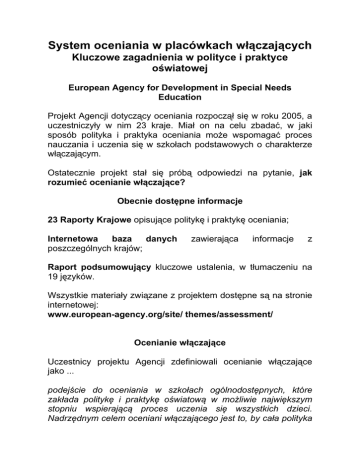 System oceniania w placówkach włączających Kluczowe zagadnienia w polityce i praktyce oświatowej European Agency for Development in Special Needs Education Projekt Agencji dotyczący oceniania rozpoczął się w roku 2005, a uczestniczyły w nim 23 kraje. Miał on na celu zbadać, w jaki sposób polityka i praktyka oceniania może wspomagać proces nauczania i uczenia się w szkołach podstawowych o charakterze włączającym. Ostatecznie projekt stał się próbą odpowiedzi na pytanie, jak rozumieć ocenianie włączające? Obecnie dostępne informacje 23 Raporty Krajowe opisujące politykę i praktykę oceniania; Internetowa baza danych poszczególnych krajów; zawierająca informacje z Raport podsumowujący kluczowe ustalenia, w tłumaczeniu na 19 języków. Wszystkie materiały związane z projektem dostępne są na stronie internetowej: www.european-agency.org/site/ themes/assessment/ Ocenianie włączające Uczestnicy projektu Agencji zdefiniowali ocenianie włączające jako ... podejście do oceniania w szkołach ogólnodostępnych, które zakłada politykę i praktykę oświatową w możliwie największym stopniu wspierającą proces uczenia się wszystkich dzieci. Nadrzędnym celem oceniani włączającego jest to, by cała polityka oceniania i stosowane procedury wspomagały i wzmacniały włączanie i uczestnictwo wszystkich uczniów zagrożonych wykluczeniem, także dzieci z SPE. Ocenianie włączające należy uznać za ważne zadanie stojące przed wszystkimi odpowiedzialnymi za politykę i praktykę nauczania. Najważniejszym przesłaniem płynącym z projektu Agencji jest to, że praktyka oceniania włączającego powinna stać się wzorem dla całego systemu oceniania ... Zasady oceniania włączającego wspomagają proces nauczania i uczenia się wszystkich dzieci. Innowacje wprowadzane w praktyce oceniania włączającego stanowią przykłady dobrej praktyki oceniania wszystkich uczniów. Zasady oceniania włączającego Ocenianie włączające stawia sobie za cel zapobieganie segregacji poprzez unikanie (o ile to możliwe) szufladkowania uczniów, oraz przez to, że koncentruje się na takiej praktyce nauczania i uczenia się, która pomaga wprowadzić edukację włączającą w szkołach ogólnodostępnych. Warunkiem wprowadzenia oceniania włączającego jest właściwa polityka oświatowa i odpowiednia organizacja szkoły oraz form wspomagania nauczycieli, którzy powinni wykazywać pozytywne nastawienie do edukacji włączającej. Oznacza to, że … … polityka oceniania w całym systemie szkolnictwa powinna, podobnie jak polityka oceniania w szkolnictwie specjalnym, uwzględniać potrzeby uczniów zagrożonych wykluczeniem, w tym uczniów z SPE; … wszyscy uczniowie mają prawo uczestniczyć w procedurach oceniania włączającego, dotyczy to uczniów z SPE na równi z ich kolegami; … wszystkie sposoby i metody oceniania powinny się wzajem uzupełniać i wspomagać; … ocenianie służyć ma „kulturze różnorodności” poprzez określenie postępów i osiągnięć każdego ucznia i ich docenienie. Cele oceniania włączającego Ocenianie włączające ma za zadanie poprawę procesu kształcenia wszystkich uczniów uczęszczających do szkół ogólnodostępnych. Wszystkie procedury, metody i narzędzia oceniania włączającego mają przełożenie na proces nauczania i uczenia się i wspomagają nauczycieli w ich pracy. Ocenianie włączające ma pozytywnie wzmacniać ucznia, którego dotyczy, dając mu wgląd w przebieg własnego kształcenia i motywując do dalszej nauki. Ocenianie włączające zakłada: … wykorzystanie szeregu metod i strategii w celu zebrania wystarczających danych na temat postępów ucznia w zakresie nauczania przedmiotowego i nabywania umiejętności pozaprzedmiotowych; … użycie procedur, które służą także innym celom niż wsparcie procesu nauczania i uczenia się (np. wstępnemu rozpoznaniu SPE lub monitorowaniu standardów edukacyjnych), ale również opierają się na zasadzie współudziału i współpracy i oparte są na tym samym systemie pojęciowym i wartościach, co ocenianie włączające; … stosowanie metod, które nie tylko obrazują wyniki nauczania, ale także dostarczają nauczycielom informacji pomocnych w planowaniu i doskonaleniu procesu kształcenia poszczególnych dzieci i grup uczniów; … podejmowanie decyzji na podstawie danych zaczerpniętych z wielu źródeł dokumentujących przebieg nauki w dłuższym okresie czasu; pozwala to na uzyskanie dodatkowych informacji („wartości dodanej”) o postępach i rozwoju ucznia, a nie tylko wyrywkowych danych; … umieszczanie uzyskanych informacji w kontekście, z uwzględnieniem czynników środowiskowych i rodzinnych, które mają wpływ na proces uczenia się dziecka; … ocenę czynników wspomagających proces włączenia indywidualnego ucznia, ponieważ wzięcie ich pod uwagę przy podejmowaniu szerszych decyzji dotyczących szkoły, klasy i form wspomagania, zwiększa skuteczność tych ostatnich; … czynne zaangażowanie nauczycieli i wychowawców, uczniów, rodziców, rówieśników i innych osób w proces oceniania. Więcej informacji na temat Europejskiej Agencji Rozwoju Edukacji Ucznia ze Specjalnymi Potrzebami uzyskać można na stornie internetowej: www.european-agency.org