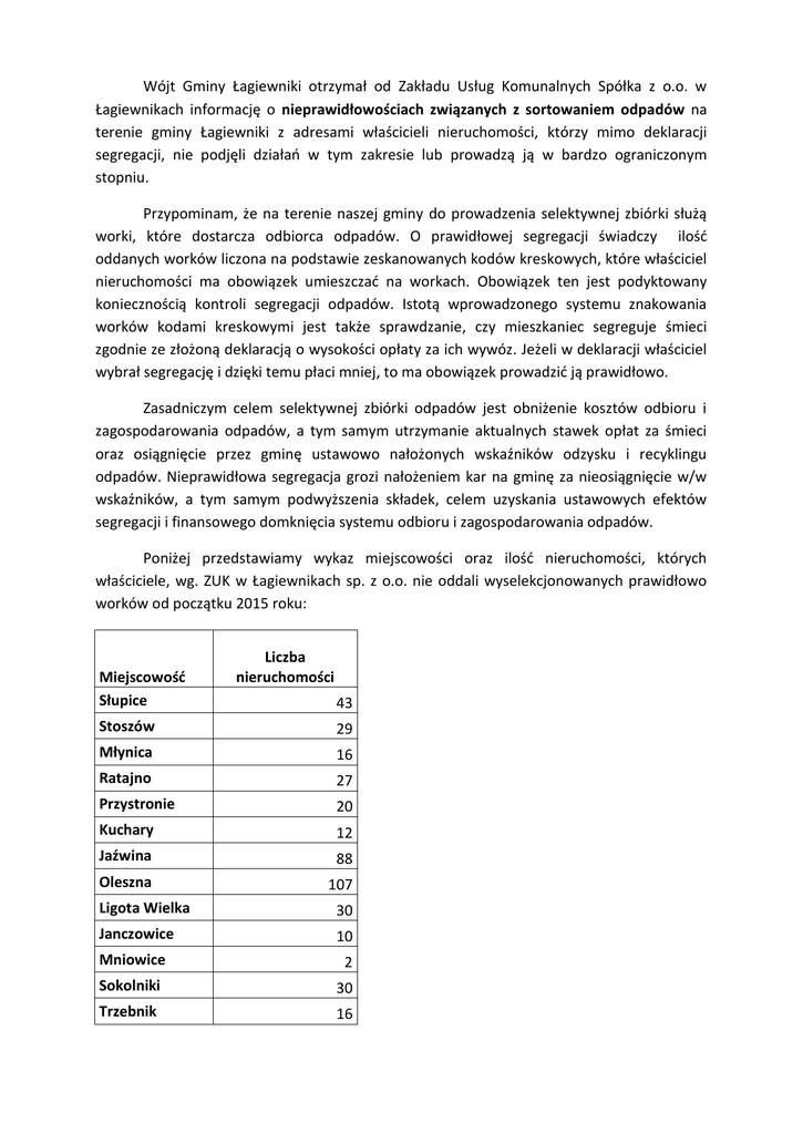 Wójt Gminy Łagiewniki otrzymał od Zakładu Usług Komunalnych Spółka z o.o. w Łagiewnikach informację o nieprawidłowościach związanych z sortowaniem odpadów na terenie gminy Łagiewniki z adresami właścicieli nieruchomości, którzy mimo deklaracji segregacji, nie podjęli działań w tym zakresie lub prowadzą ją w bardzo ograniczonym stopniu. Przypominam, że na terenie naszej gminy do prowadzenia selektywnej zbiórki służą worki, które dostarcza odbiorca odpadów. O prawidłowej segregacji świadczy ilość oddanych worków liczona na podstawie zeskanowanych kodów kreskowych, które właściciel nieruchomości ma obowiązek umieszczać na workach. Obowiązek ten jest podyktowany koniecznością kontroli segregacji odpadów. Istotą wprowadzonego systemu znakowania worków kodami kreskowymi jest także sprawdzanie, czy mieszkaniec segreguje śmieci zgodnie ze złożoną deklaracją o wysokości opłaty za ich wywóz. Jeżeli w deklaracji właściciel wybrał segregację i dzięki temu płaci mniej, to ma obowiązek prowadzić ją prawidłowo. Zasadniczym celem selektywnej zbiórki odpadów jest obniżenie kosztów odbioru i zagospodarowania odpadów, a tym samym utrzymanie aktualnych stawek opłat za śmieci oraz osiągnięcie przez gminę ustawowo nałożonych wskaźników odzysku i recyklingu odpadów. Nieprawidłowa segregacja grozi nałożeniem kar na gminę za nieosiągnięcie w/w wskaźników, a tym samym podwyższenia składek, celem uzyskania ustawowych efektów segregacji i finansowego domknięcia systemu odbioru i zagospodarowania odpadów. Poniżej przedstawiamy wykaz miejscowości oraz ilość nieruchomości, których właściciele, wg. ZUK w Łagiewnikach sp. z o.o. nie oddali wyselekcjonowanych prawidłowo worków od początku 2015 roku: Miejscowość Słupice Liczba nieruchomości 43 Stoszów 29 Młynica 16 Ratajno 27 Przystronie 20 Kuchary 12 Jaźwina 88 Oleszna 107 Ligota Wielka 30 Janczowice 10 Mniowice 2 Sokolniki 30 Trzebnik 16 Sieniawka 37 Radzików 45 Sienice 34 Uliczno 7 Łagiewniki RAZEM 340 893 W najbliższym czasie zostanie poddany dokładnej weryfikacji sposób gromadzenia i segregowania odpadów w wyszczególnionych nieruchomościach. Jednocześnie informuję, że jeśli system stosowania kodów kreskowych nie będzie stosowany poprawnie, będę zmuszony naliczyć opłatę według stawki za odpady niesegregowane zgodnie z obowiązującymi przepisami. Jednocześnie informuję, że kwota opłaty „za śmieci” zależy od ilości osób zamieszkujących daną nieruchomość oraz od wyboru stawki opłaty w zależności, czy zadeklarowaliśmy segregację na nieruchomości czy nie. A zatem jeszcze raz przypominam i proszę o prawidłową segregację odpadów komunalnych na Państwa nieruchomościach zgodnie ze złożoną deklaracją lub o zmianę deklaracji. Worki na odpady selektywne muszą posiadać naklejony kod kreskowy – worki bez kodów kresowych nie będą ewidencjonowane, co będzie skutkowało naliczeniem wyższej stawki opłat o 50% za nieudokumentowany sposób selektywnie odebranych odpadów.